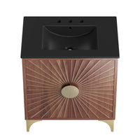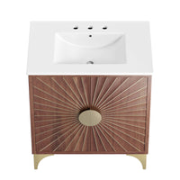 Bring refreshing energy into your bathroom space with the Daylight 30" Bathroom Vanity. Beautifully crafted with solid mango wood and a rich wood stain, this bathroom cabinet features a sun ray design made possible through intricate powder-coated brass details and hardware. This vanity cabinet is a complete addition to a bathroom with a ceramic sink basin and an integrated countertop with 8" centerset holes. Resting on a brass base with arched details and non-marking foot caps, this bathroom vanity offers ample storage space for bathroom essentials with the spacious open shelf and pull-out drawer. Fixtures not included. Assembly required.