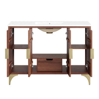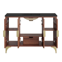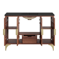 Bring refreshing energy into your bathroom space with the Daylight 48" Bathroom Vanity. Beautifully crafted with solid mango wood and a rich wood stain, this bathroom cabinet features a sun ray design made possible through intricate powder-coated brass details and hardware. This vanity cabinet is a complete addition to a bathroom with a ceramic sink basin and an integrated countertop with 8" centerset holes. Resting on a brass base with arched details and non-marking foot caps, this bathroom vanity offers ample storage space for bathroom essentials with the spacious open shelf and pull-out drawer. Fixtures not included. Assembly required.