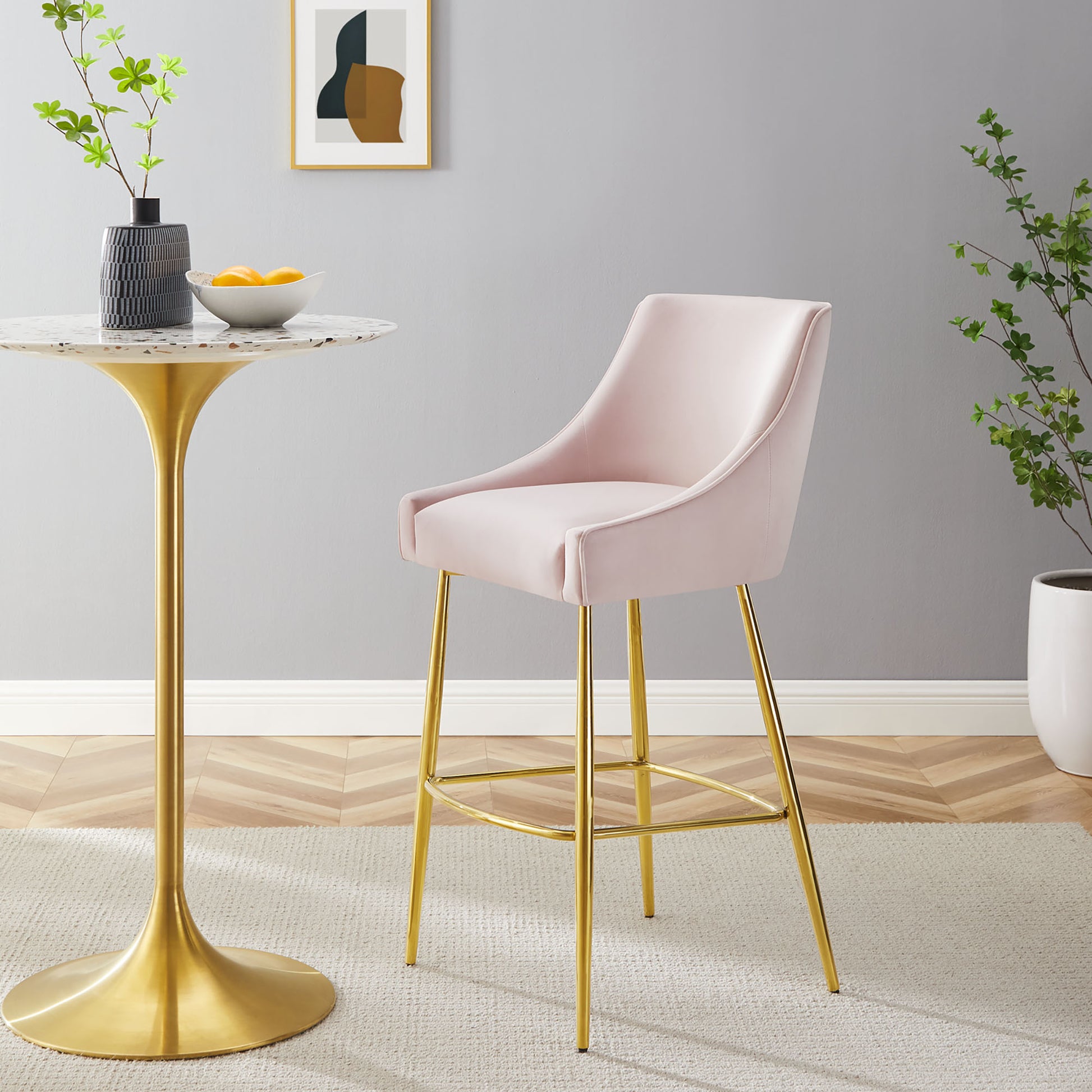 The dashingly handsome Discern Performance Velvet Bar Stool brings substance and charisma into your dining space. Standing confidently on brushed gold stainless steel legs braced by a matching stretcher, the Discern Bar Stool enthralls with subtle details and a stylish retro modern vibe that fits well with mid-century modern decor. Stain-resistant performance velvet upholstery envelopes the seat and backrest of this bar-height stool, perfect for a pub table or kitchen bar. The curved armrest and precise tailoring signal an attention to detail that makes this velvet bar stool irresistible. The Discern Bar Stool features protective foot pads, a decorative handle, and dense foam padding.