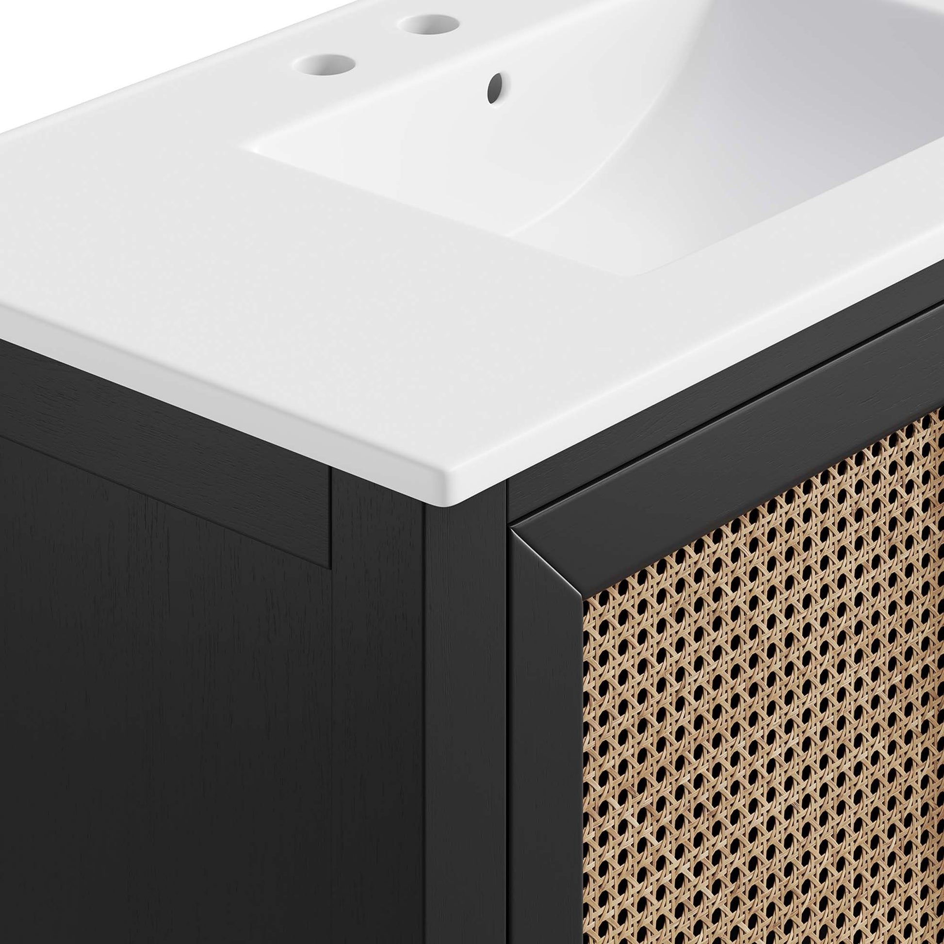With its clean lines, smooth surfaces, and contemporary angles, the Dixie 36” Bathroom Vanity introduces a layer of modern sophistication to any bathroom space. Crafted from solid Mahogany wood, it stands firm on slightly tapered legs and is fitted with a sleek ceramic basin boasting an integrated countertop and 8-inch centerset faucet holes. This vanity features one cabinet door, concealing a height-adjustable shelf with a cut-out design to accommodate plumbing, and three adjacent drawers, enhancing functionality and storage space. All compartments are tastefully adorned with satin brass handles and equipped with soft close hinges, for a smooth experience. Optimizing storage for a variety of bathroom essentials, from towels to toiletries, the Dixie Bathroom Vanity ensures that everything is conveniently at hand. It includes non-marking foot caps for floor protection. Sink basin and fixtures not included. Assembly required. Weight Capacity: 200 lbs