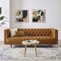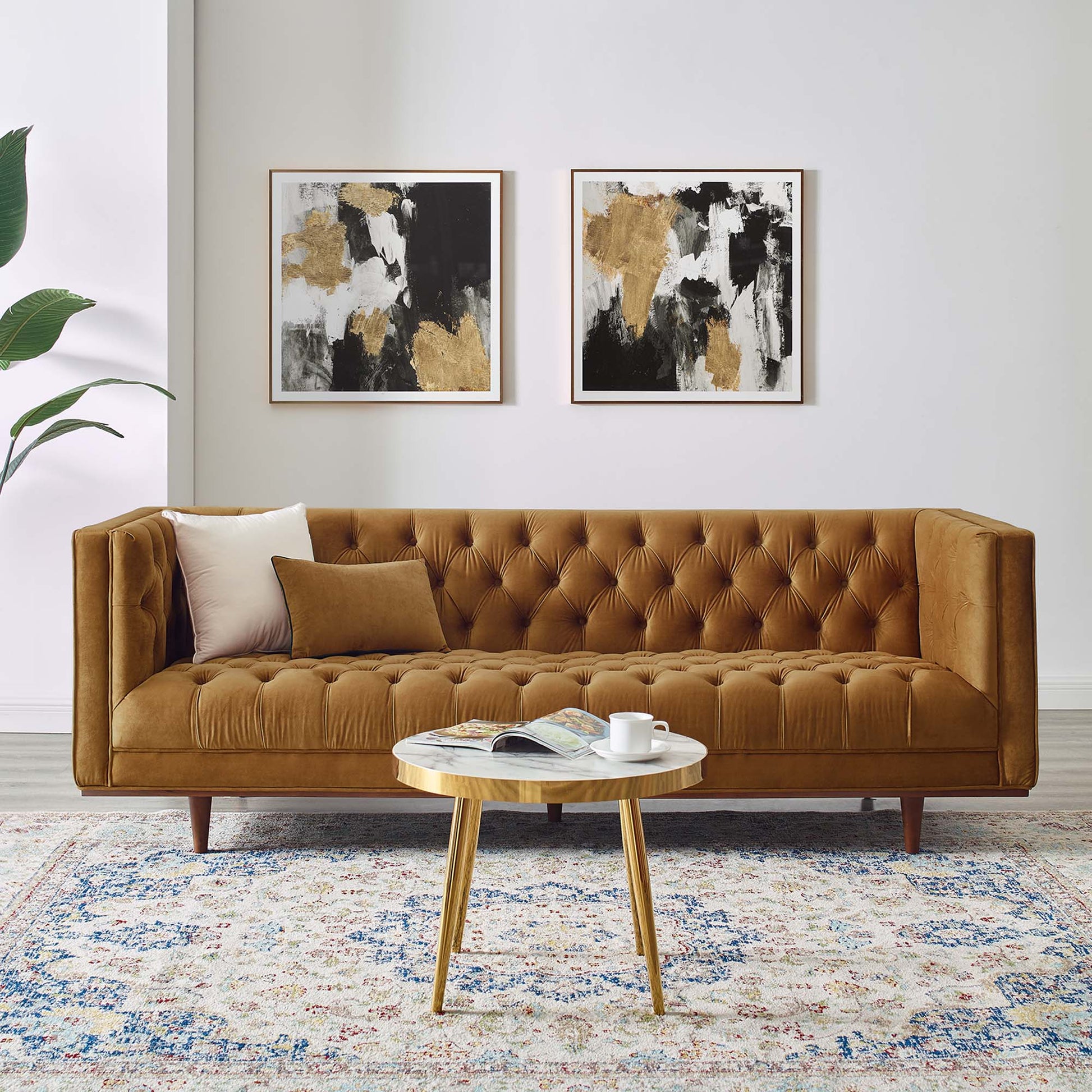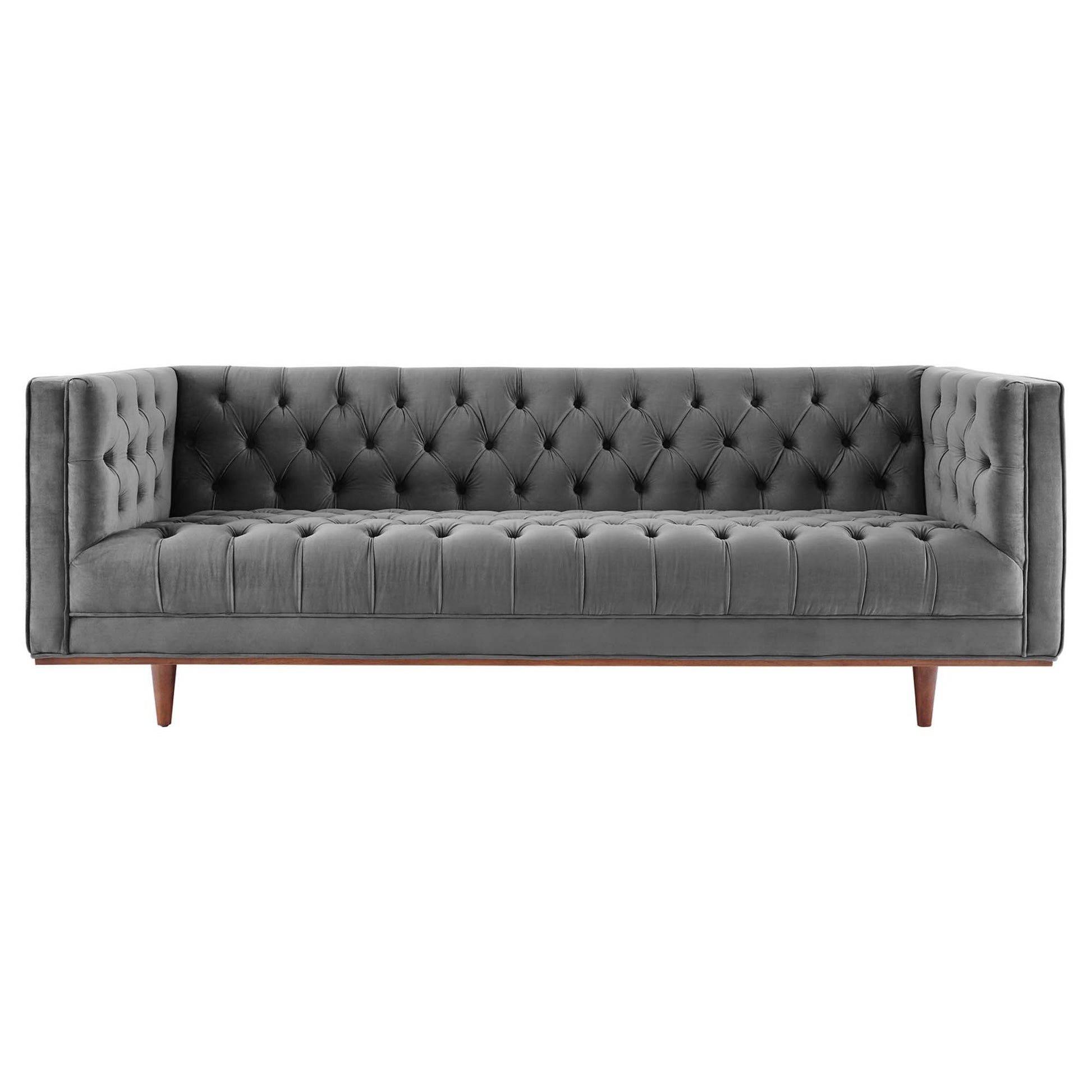 Inspire vintage modernity and glam deco style in your living space with the Elation Tufted Performance Velvet Sofa. Adorned with beautiful button tufting in an elegant diamond pattern, this living room sofa adds effortless depth to any lounge area. Elation is covered in stain-resistant performance velvet upholstery and features dense foam padding for a premium seating experience. With a durably crafted wood frame, this sofa rests atop tapered rubberwood legs. Includes non-marking foot caps. Assembly required. Sofa Weight Capacity: 881 lbs.