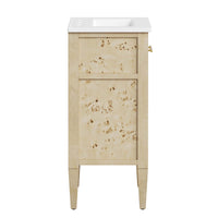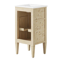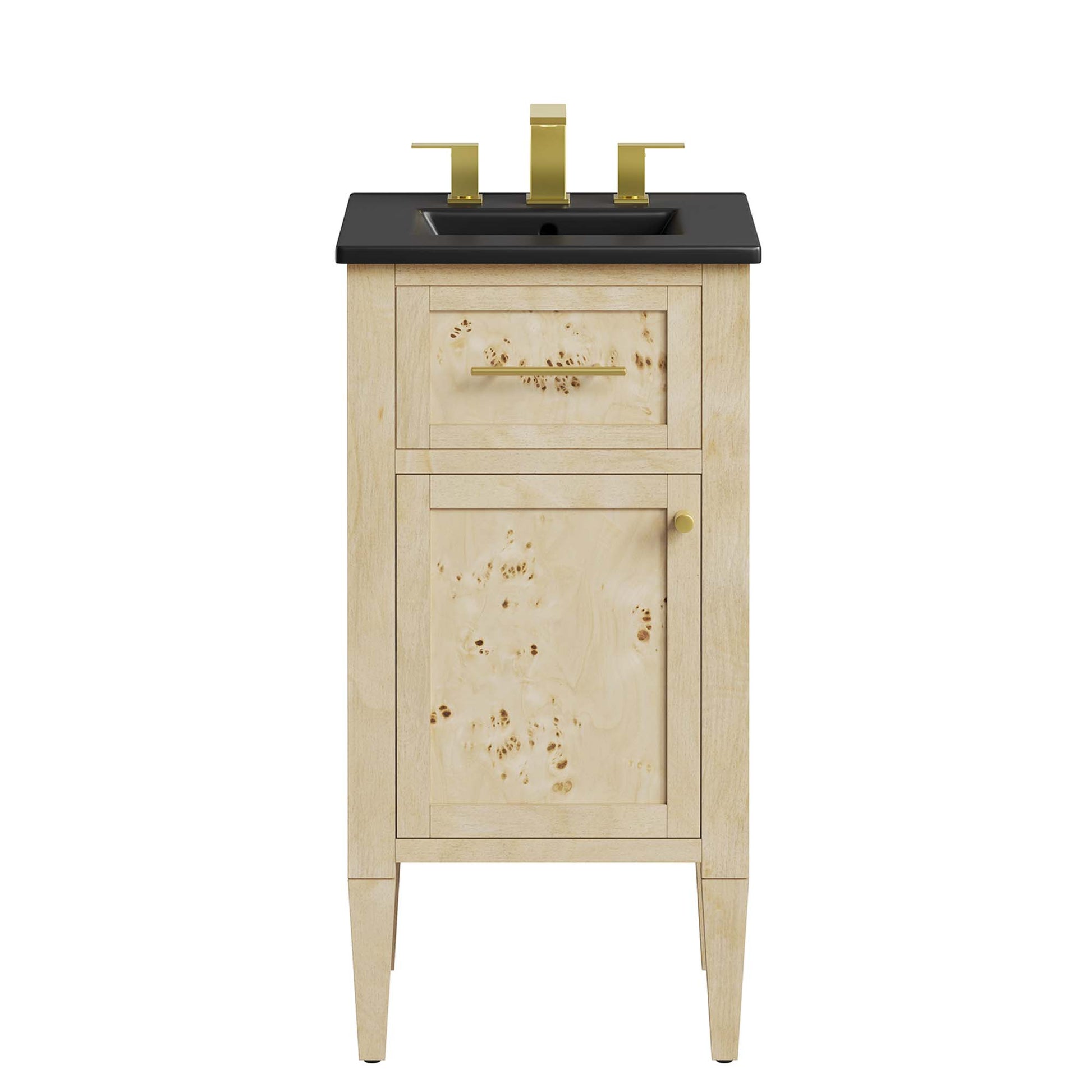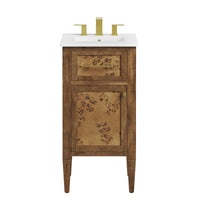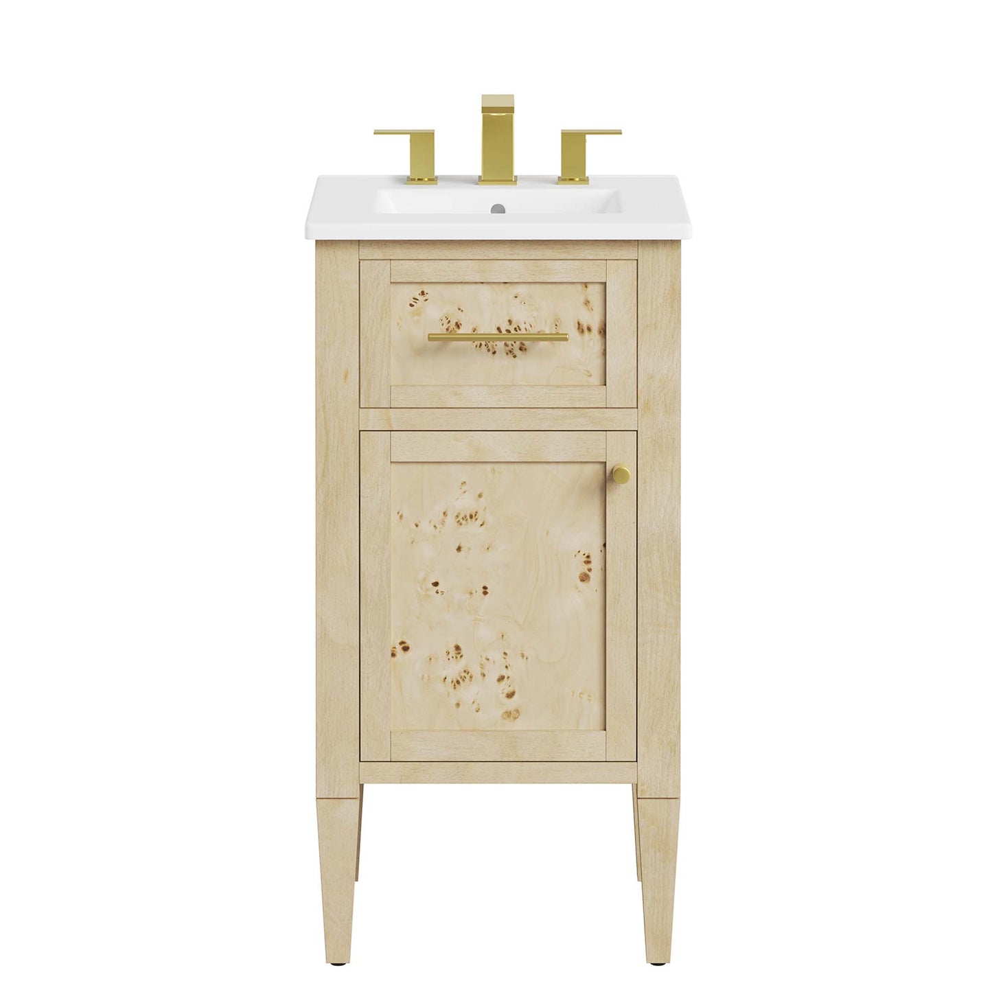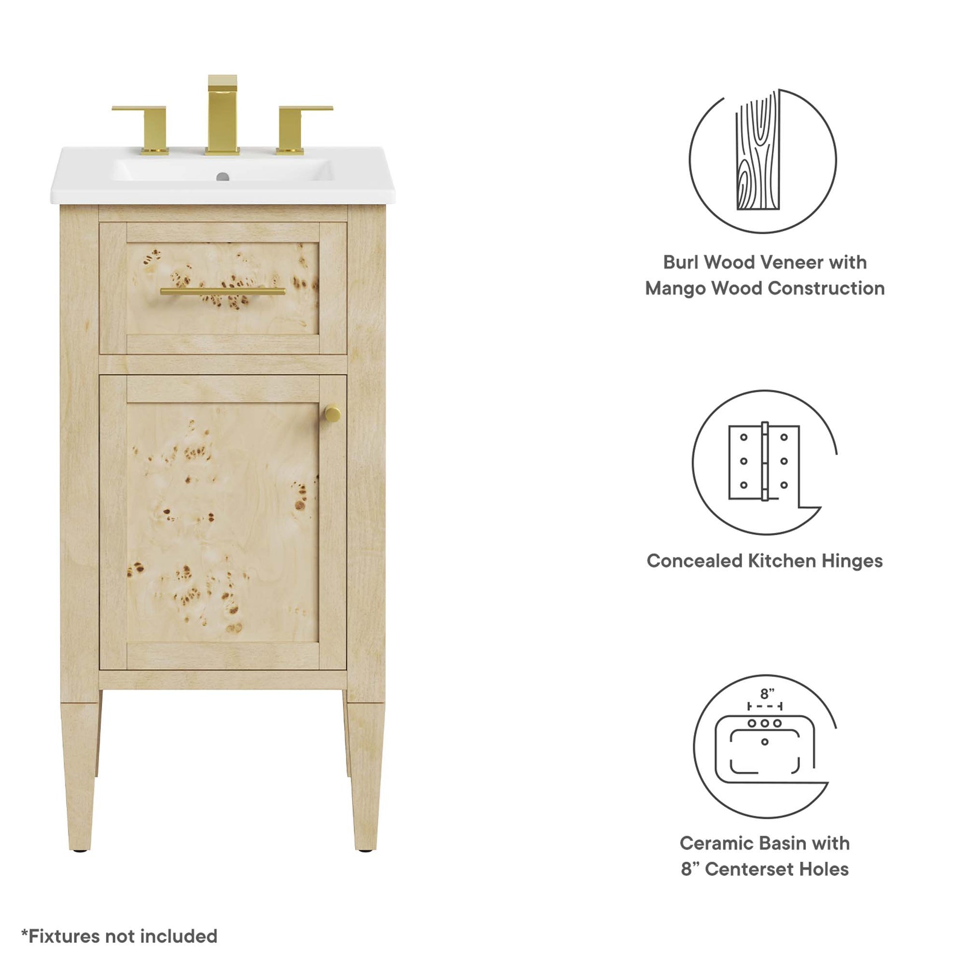 Discover the epitome of organic aesthetics and practicality with the Elysian 18" Burl Wood Bathroom Vanity. Each vanity cabinet is uniquely crafted from exquisite mango wood, further adorned with a rich burl wood veneer, radiating a distinctive charm and character. This bathroom vanity's centerpiece is an elegant ceramic sink basin, thoughtfully designed with an integrated countertop and 8" centerset holes ready for your choice of fixtures (not included). A fixed top drawer and tapered wood legs add to the sleek design, while the spacious shelving beneath–complete with a convenient plumbing cutout–offers ample storage space for all your bathroom essentials. While assembly is required, this vanity includes easy-to-follow assembly instructions.