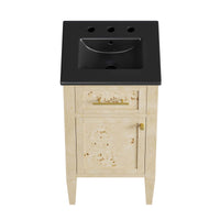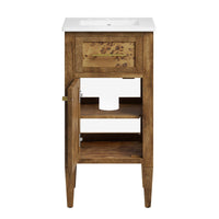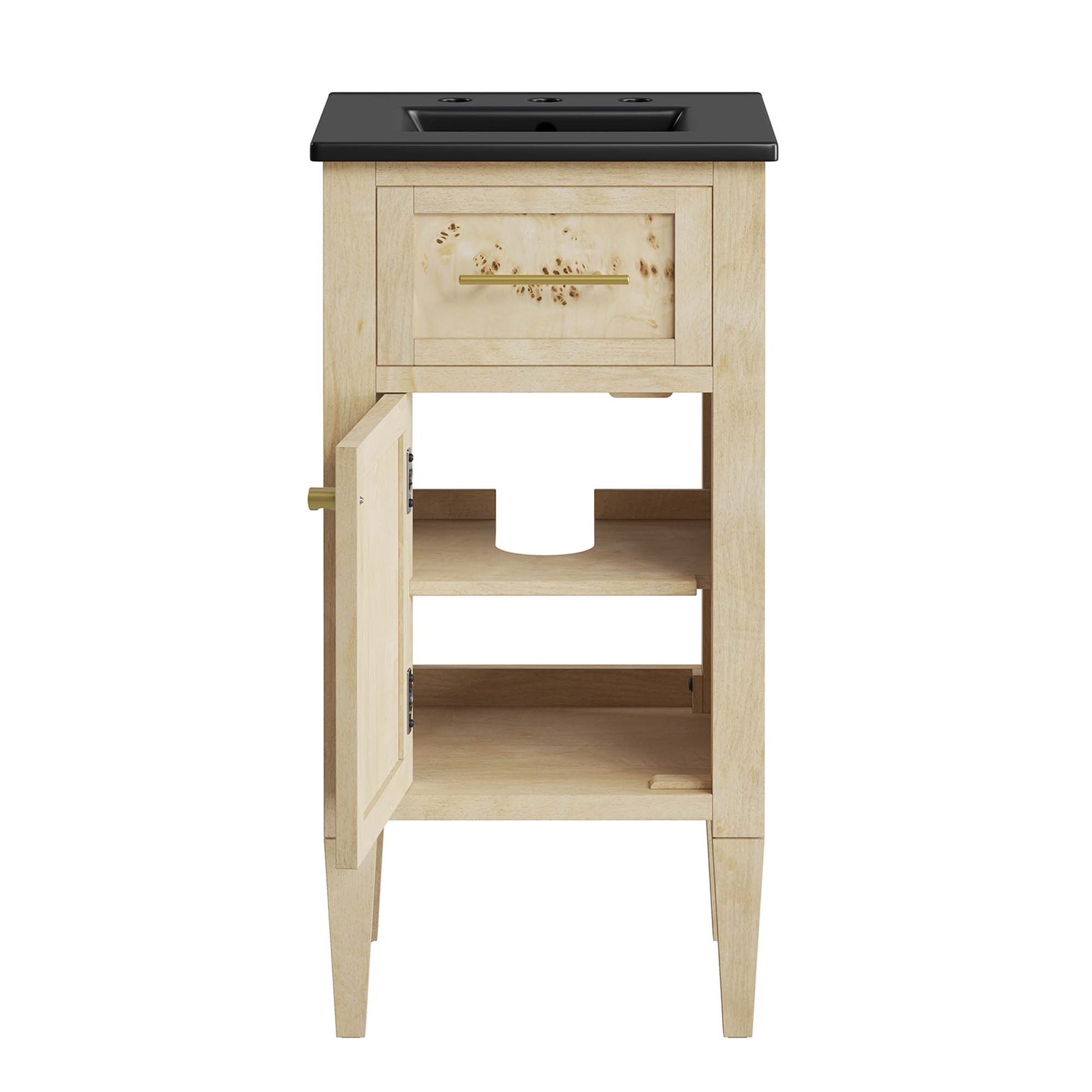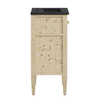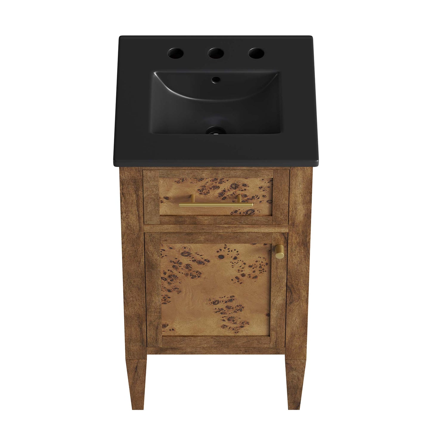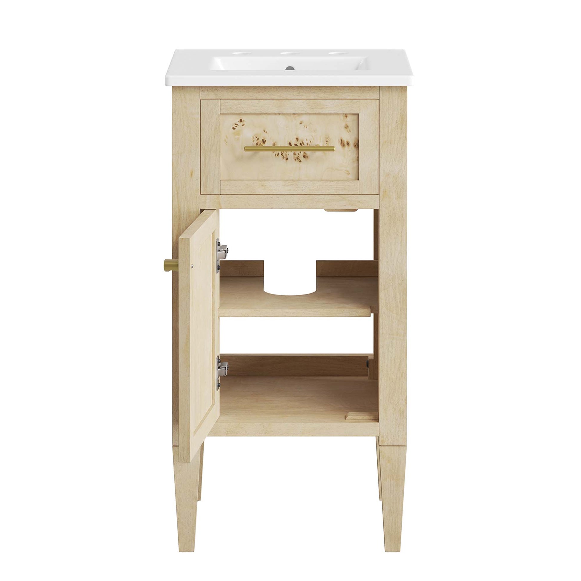 Discover the epitome of organic aesthetics and practicality with the Elysian 18" Burl Wood Bathroom Vanity. Each vanity cabinet is uniquely crafted from exquisite mango wood, further adorned with a rich burl wood veneer, radiating a distinctive charm and character. This bathroom vanity's centerpiece is an elegant ceramic sink basin, thoughtfully designed with an integrated countertop and 8" centerset holes ready for your choice of fixtures (not included). A fixed top drawer and tapered wood legs add to the sleek design, while the spacious shelving beneath–complete with a convenient plumbing cutout–offers ample storage space for all your bathroom essentials. While assembly is required, this vanity includes easy-to-follow assembly instructions.
