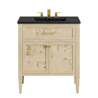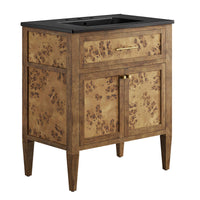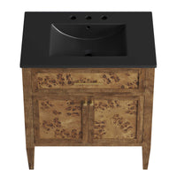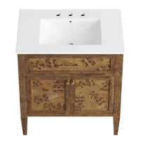 Discover the epitome of organic aesthetics and practicality with the Elysian 30" Burl Wood Bathroom Vanity. Each vanity cabinet is uniquely crafted from exquisite mango wood, further adorned with a rich burl wood veneer, radiating a distinctive charm and character. This bathroom vanity's centerpiece is an elegant ceramic sink basin, thoughtfully designed with an integrated countertop and 8" centerset holes ready for your choice of fixtures (not included). A fixed top drawer and tapered wood legs add to the sleek design, while the spacious shelving beneath–complete with a convenient plumbing cutout–offers ample storage space for all your bathroom essentials. While assembly is required, this vanity includes easy-to-follow assembly instructions.