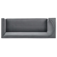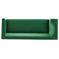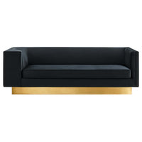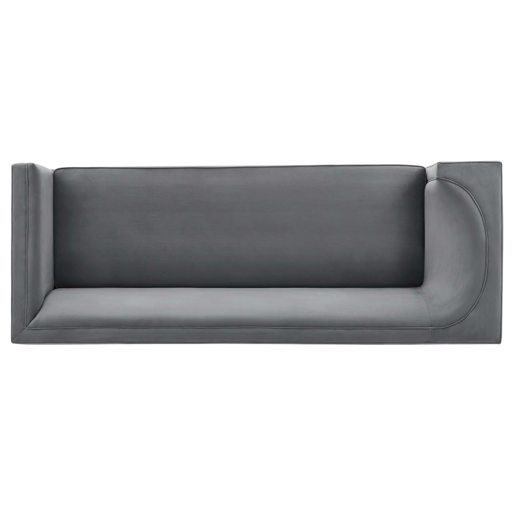 Introduce personality and polish into your living room with the intriguing silhouette and meticulous design of the Eminence Performance Velvet Sofa. Complementing mid-century modern, contemporary, or eclectic decors, this retro-modern living room sofa brims with elegance, carried on a gold inset rim. Featuring asymmetrical armrests, Eminence adds charisma and interest to the modern living room. Sturdily built with an enduring webbed support system and dense foam padding, this stain-resistant velvet couch is a versatile focal point in your lounge area, home office, or bedroom. Eminence is a captivating upholstered sofa with an overscale design. Fitted with non-marking foot glides. Sofa Weight Capacity: 993 lbs