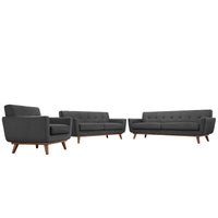 Gently sloping curves and large dual cushions create a favorite lounging spot with Engage Upholstered Fabric Button Tufted Sofa Furniture Series. Whether plopping down after a long day at work, settling in with coffee and brunch, or entering a spirited discussion with friends, the Engage Upholstered Fabric Button Tufted Sofa, Loveseat and Armchair set is a welcome presence in your home. Seven tufted buttons create eye-catching appeal, adding depth that brings your sitting décor to center stage. Four cherry color rubberwood legs and frame supply a solid base to the comfortably durable and stain-resistant upholstery.