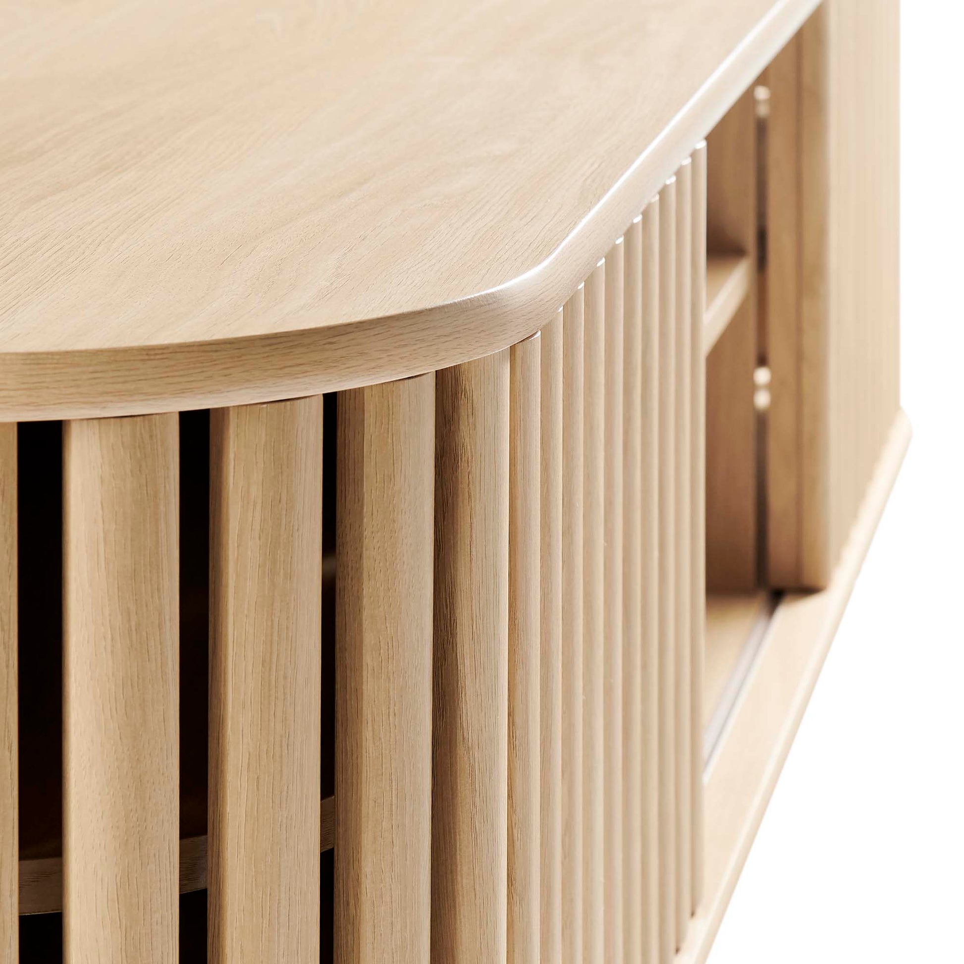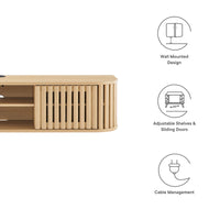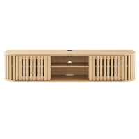 Elevate your entertainment with the Fortitude Wall Mounted TV Stand. With its sliding doors, timber style strip design, adjustable shelves, and a grommet on top for cable management, Fortitude is a practical and stylish solution for any living space. Crafted from MDF and particleboard and designed to mount on the wall, this stand can accommodate TVs up to 70 inches. Includes non-marking foot caps. Assembly required.