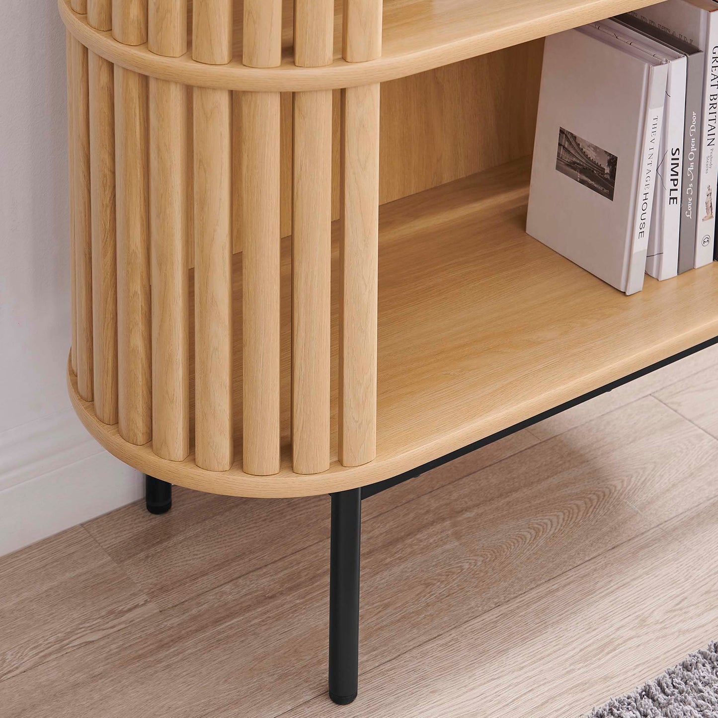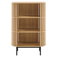 Enrich your living space with the Fortitude Three Tier Display Cabinet Bookshelf. Designed for the living room, office, bedroom, or entryway, this bookshelf features three tiers of open storage shelves perfect for displaying books, photos, and more. Crafted from MDF and particleboard with a wood grain finish and a timber style strip design, this piece is both durable and stylish. The round metal legs offer stability and an added touch of modern appeal. Includes non-marking foot caps. Assembly required.