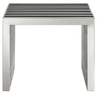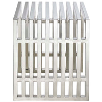 Silver rivers of laughter race back and forth in this high energy modern piece. Gridiron's sleek stainless steel bench contains a message of transformation and metamorphosis. Exuberance abounds as the strategic placement of this piece will radiate a happy atmosphere.