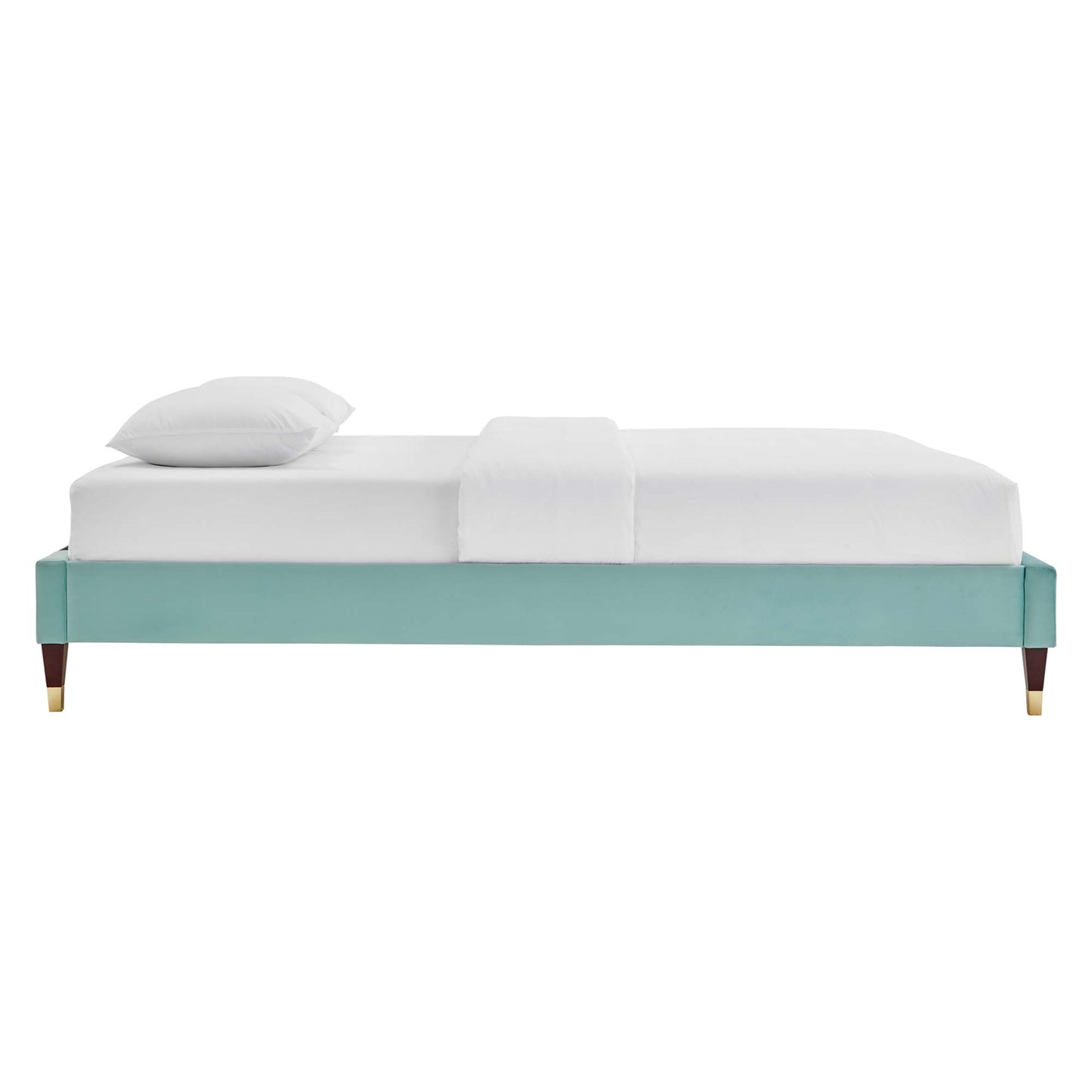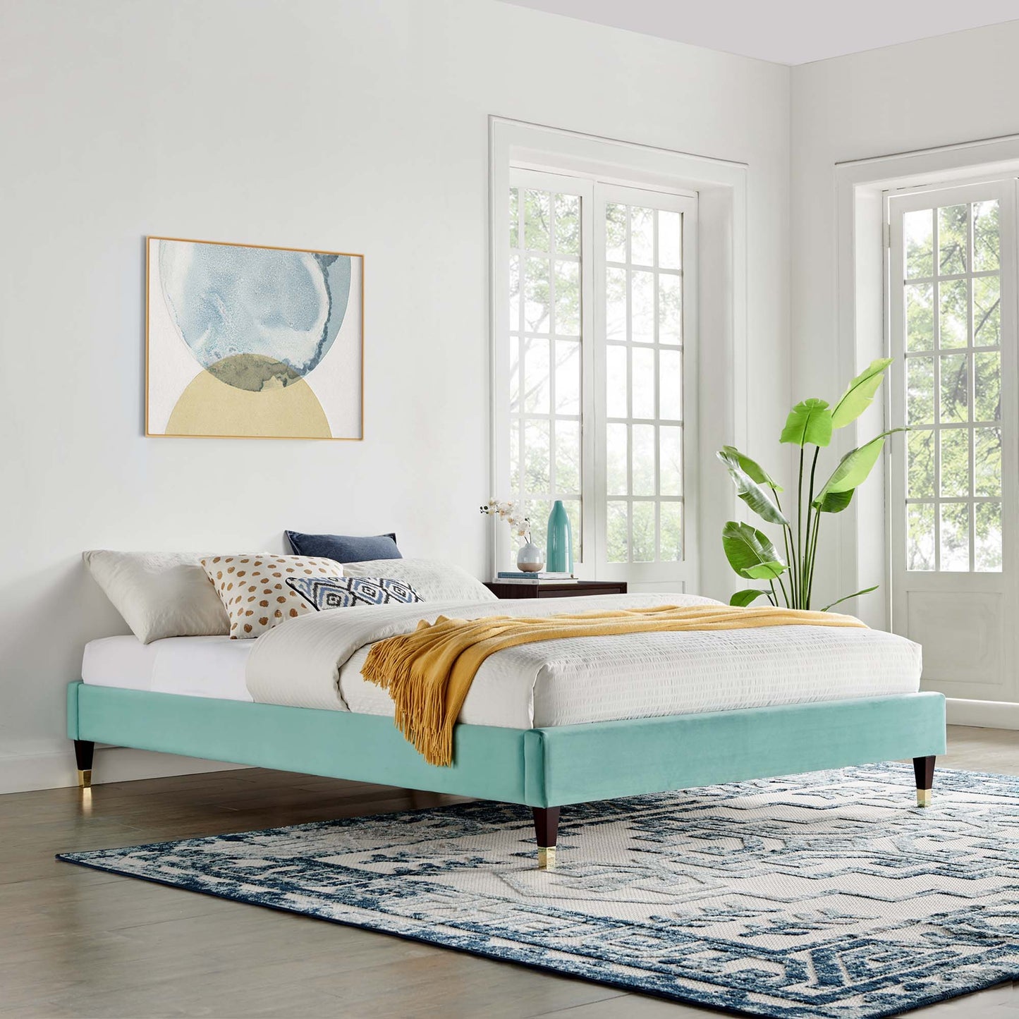 Bring glam deco style and luxurious sleep to your guest bedroom or teenager's bedroom with the Harlow Performance Velvet Full Bed Frame. Resting atop wood legs with gold metal sleeves, the side rails of this platform bed are covered in soft, stain-resistant performance velvet offering rich texture to the simple design. This full size bed frame is a sturdy mattress foundation for memory foam, innerspring, latex, and hybrid mattresses. With supporting legs and a reinforced center beam, this upholstered bed is complete with a poplar wood slat support system that offers lasting stability. Compatible with a variety of full headboard designs, this full platform bed also makes a statement as a stand-alone piece. Mattress not included. Assembly required. Full Bed Frame Weight Capacity: 800 lbs.