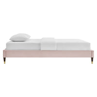Bring glam deco style and luxurious sleep to your master bedroom or guest bedroom with the Harlow Performance Velvet King Bed Frame. Resting atop wood legs with gold metal sleeves, the side rails of this platform bed are covered in soft, stain-resistant performance velvet offering rich texture to the simple design. This king size bed frame is a sturdy mattress foundation for memory foam, innerspring, latex, and hybrid mattresses. With supporting legs and a reinforced center beam, this upholstered bed is complete with a poplar wood slat support system that offers lasting stability. Compatible with a variety of king headboard designs, this king platform bed also makes a statement as a stand-alone piece. Mattress not included. Assembly required. King Bed Frame Weight Capacity: 800 lbs.