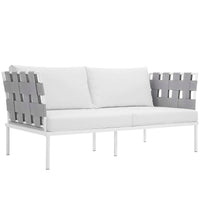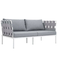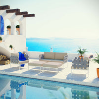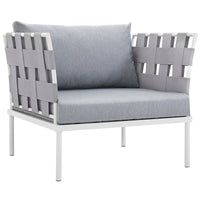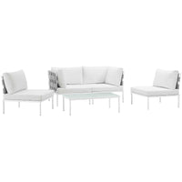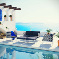 Engage life with Harmony Outdoor Patio Sectional Sofa Furniture Set. Enjoy casual conversation under the open sky with an all-weather waterproof furniture set that delivers an exceptional outdoor porch, patio, balcony or garden experience. An exceptional modern patio furniture set that exceeds expectations, this Harmony Outdoor Sectional set comes with long-lasting machine washable cushions, silk polyester seat back weave, square powder coated aluminum bases, tempered glass top tables, and non-marking foot caps. A sectional sofa that arranges according to the spontaneous needs of your guests, set your sights on open and inspired moments with the Harmony Outdoor Patio Collection.