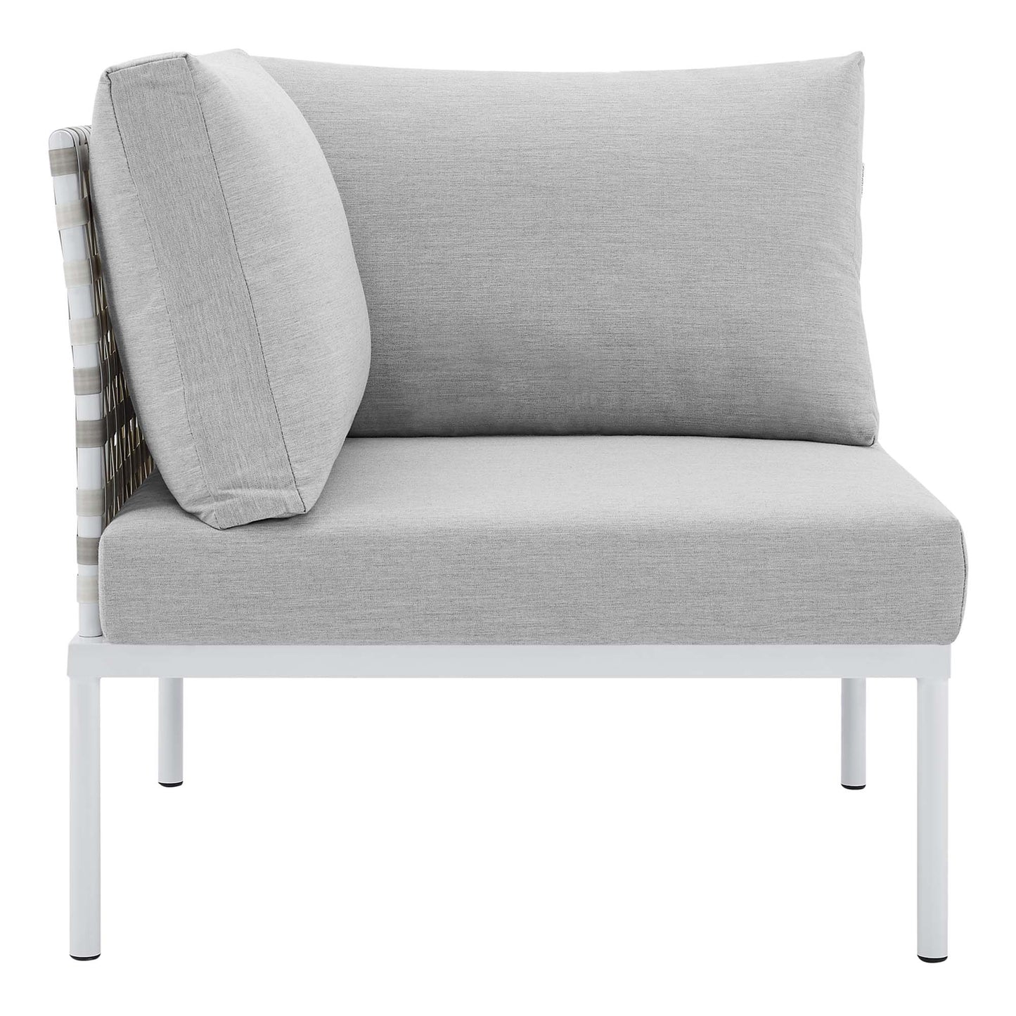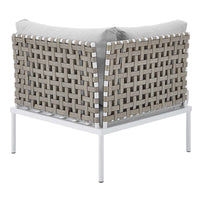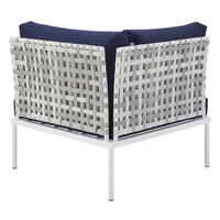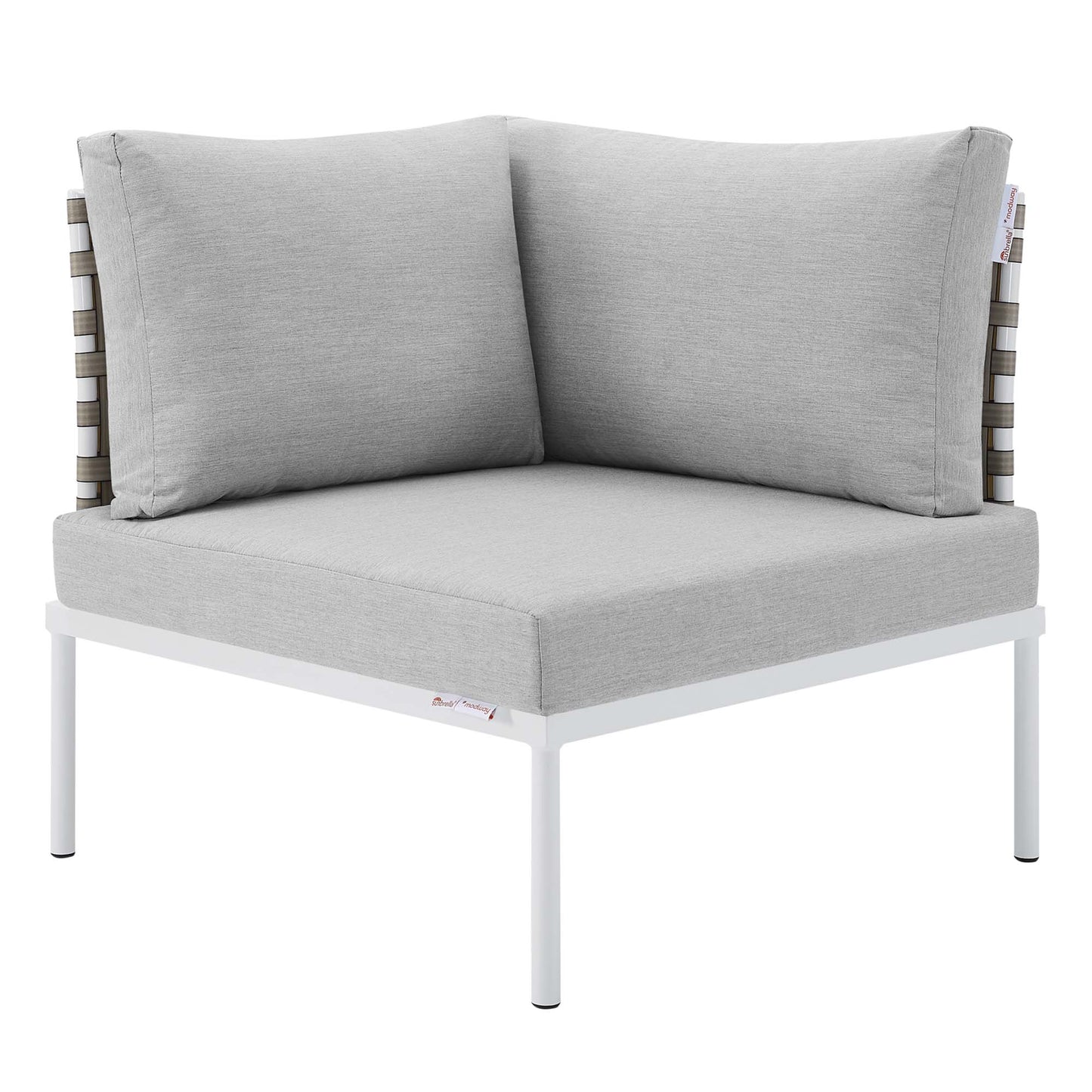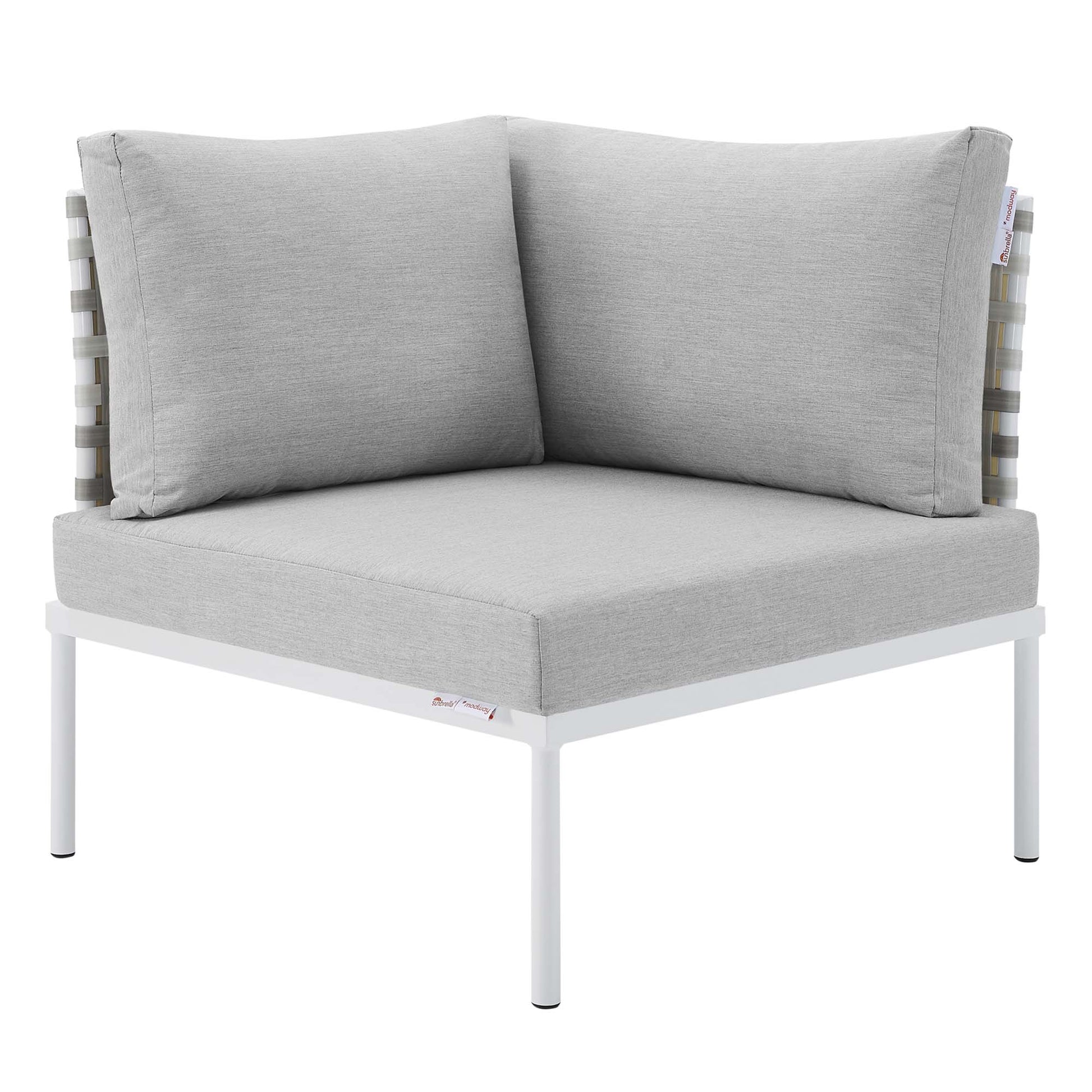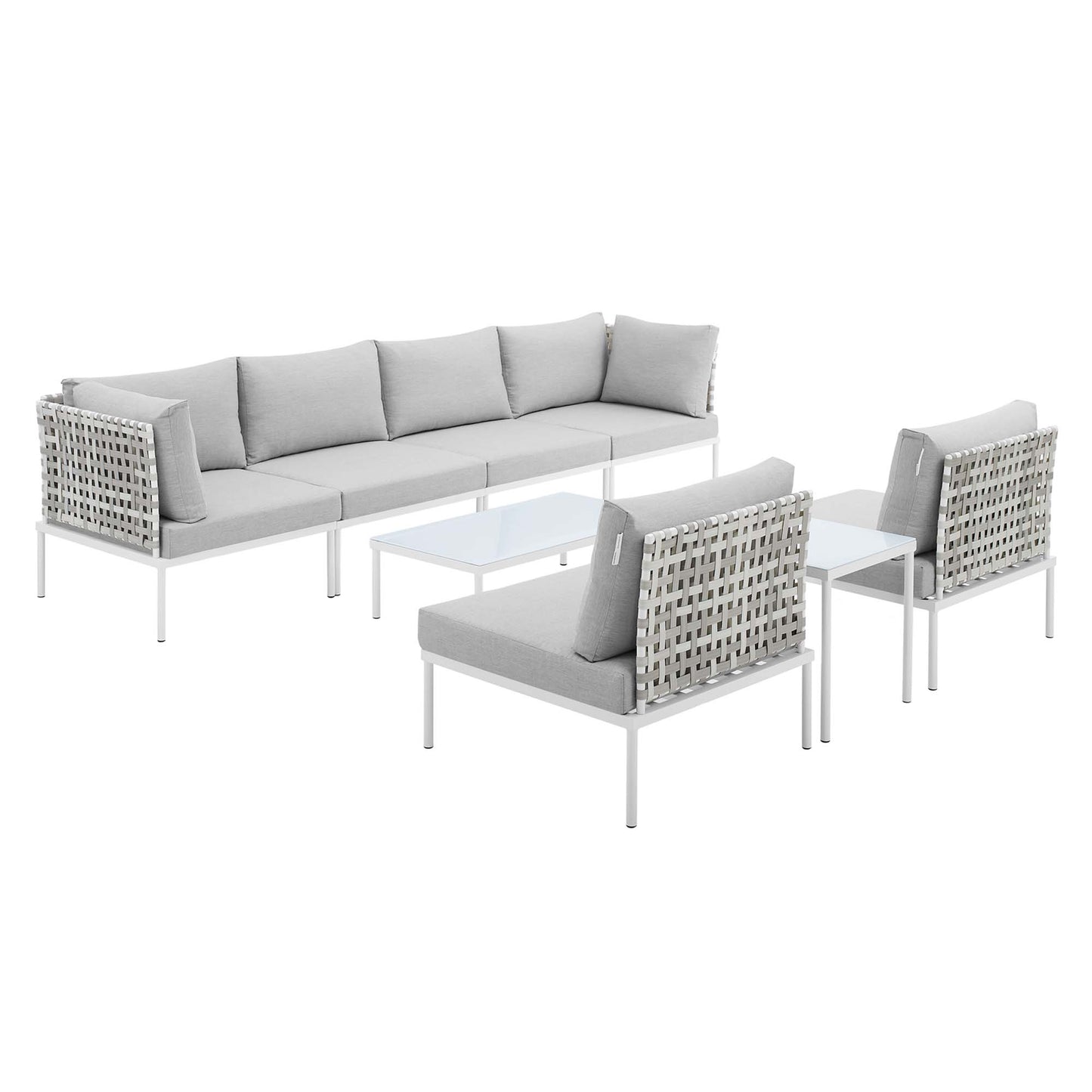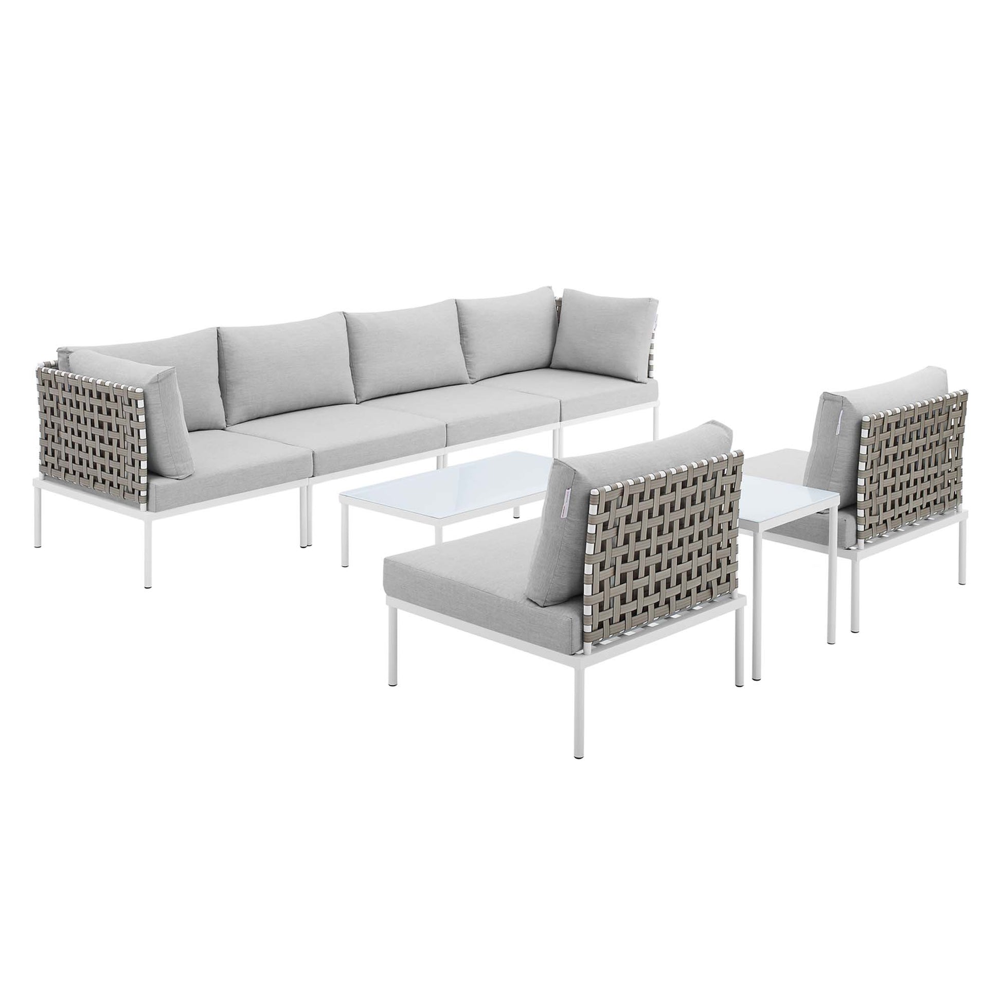 Engage life with Harmony. Enjoy casual conversation under the open sky with an all-weather waterproof furniture set that delivers an exceptional outdoor porch, patio, balcony or garden experience. An exceptional modern furniture set that exceeds expectations, Harmony comes with long-lasting machine washable Sunbrella® cushions, synthetic rattan seat back weave, square powder coated aluminum bases, tempered glass top tables, and non-marking foot caps. A sectional that arranges according to the spontaneous needs of your guests, set your sights on open and inspired moments with the Harmony Outdoor Patio Collection. Set Includes: 5 Armless Chairs, 2 Corner Chairs, 1 Coffee Table