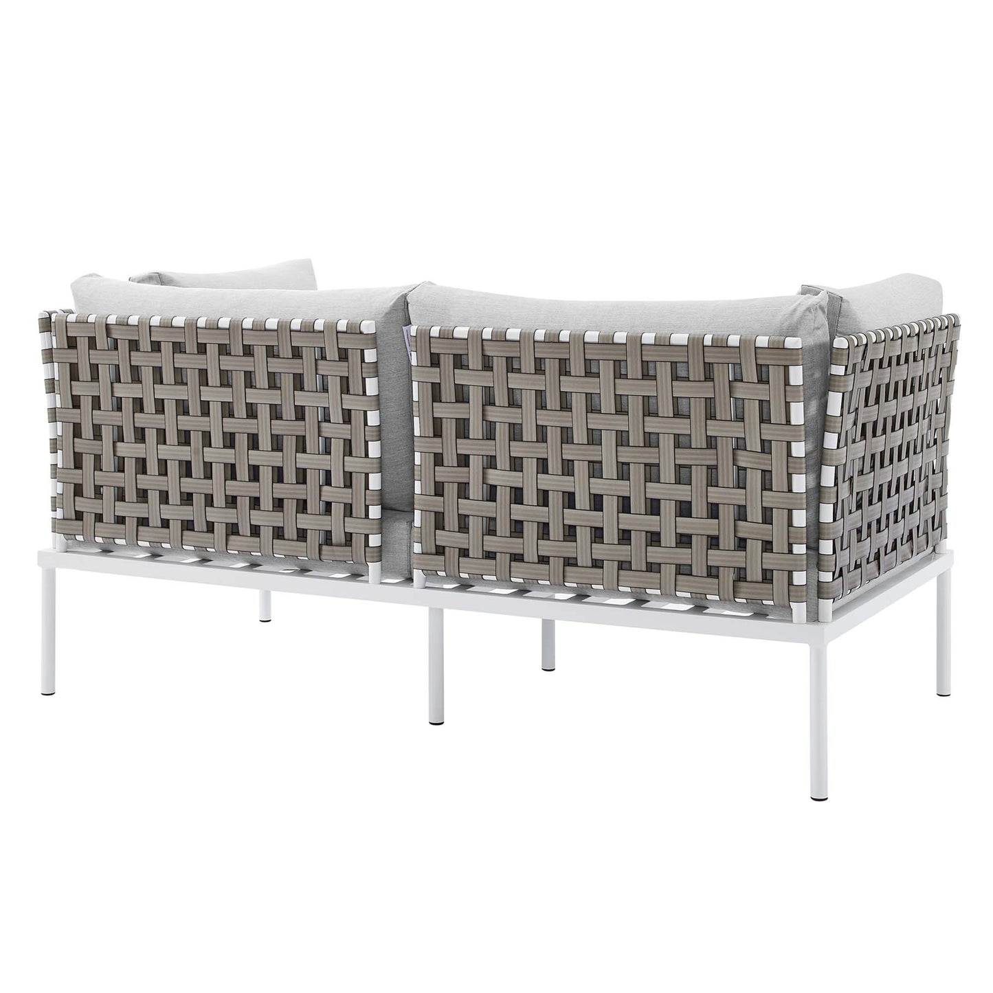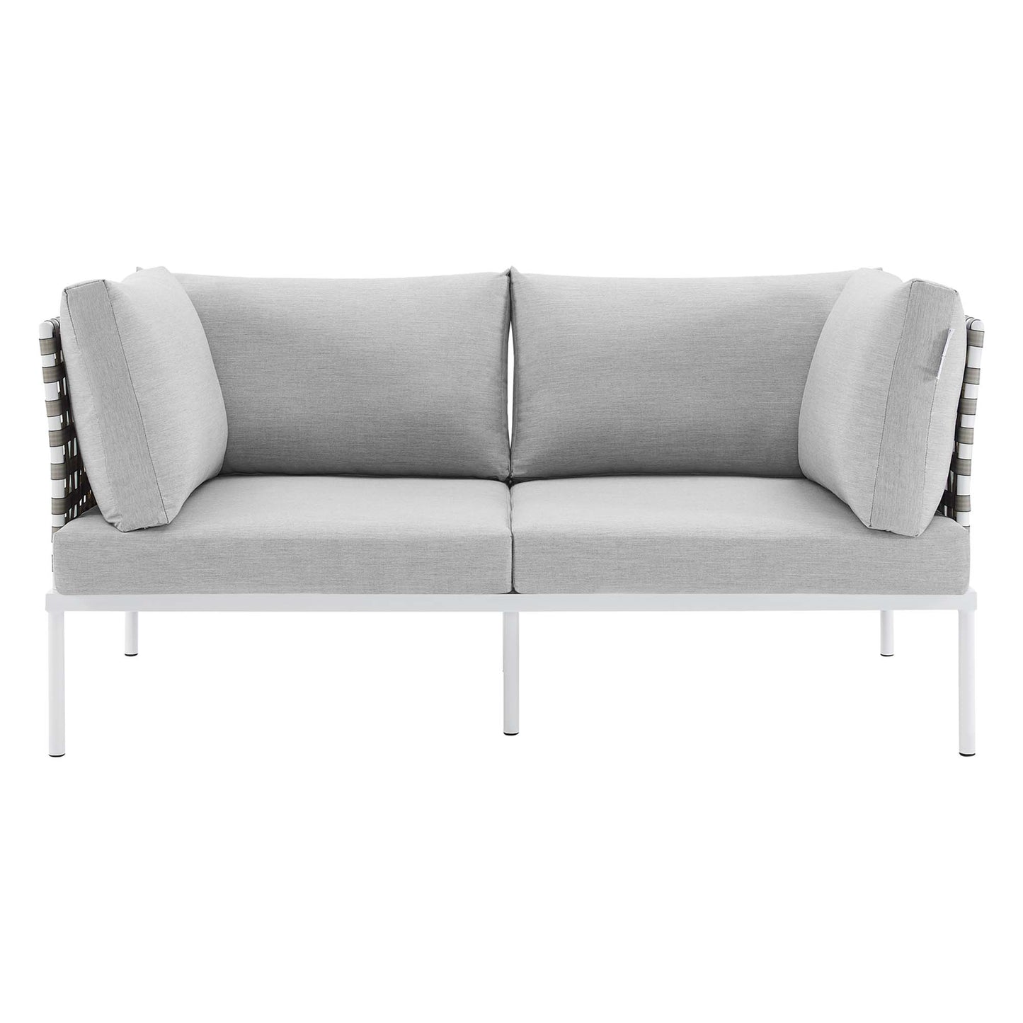 Engage life with Harmony Outdoor Patio Loveseat. Enjoy casual conversation under the open sky with an all-weather waterproof outdoor loveseat from a versatile furniture set that delivers an exceptional outdoor porch, patio, balcony or garden experience. An exceptional modern outdoor furniture set that exceeds expectations, Harmony Patio Two-Seat Sofa comes with synthetic rattan seat back weave, square powder coated aluminum bases, Sunbrella® cushions, and non-marking foot caps. An outside loveseat that arranges according to the spontaneous needs of your guests, set your sights on open and inspired moments with the Harmony Outdoor Patio Collection.
