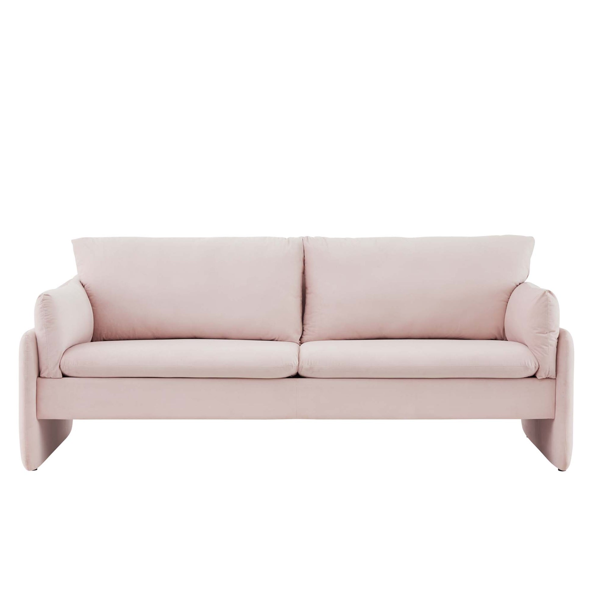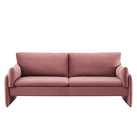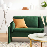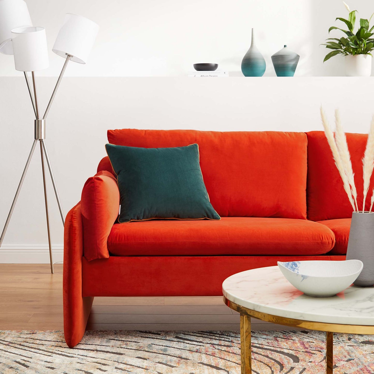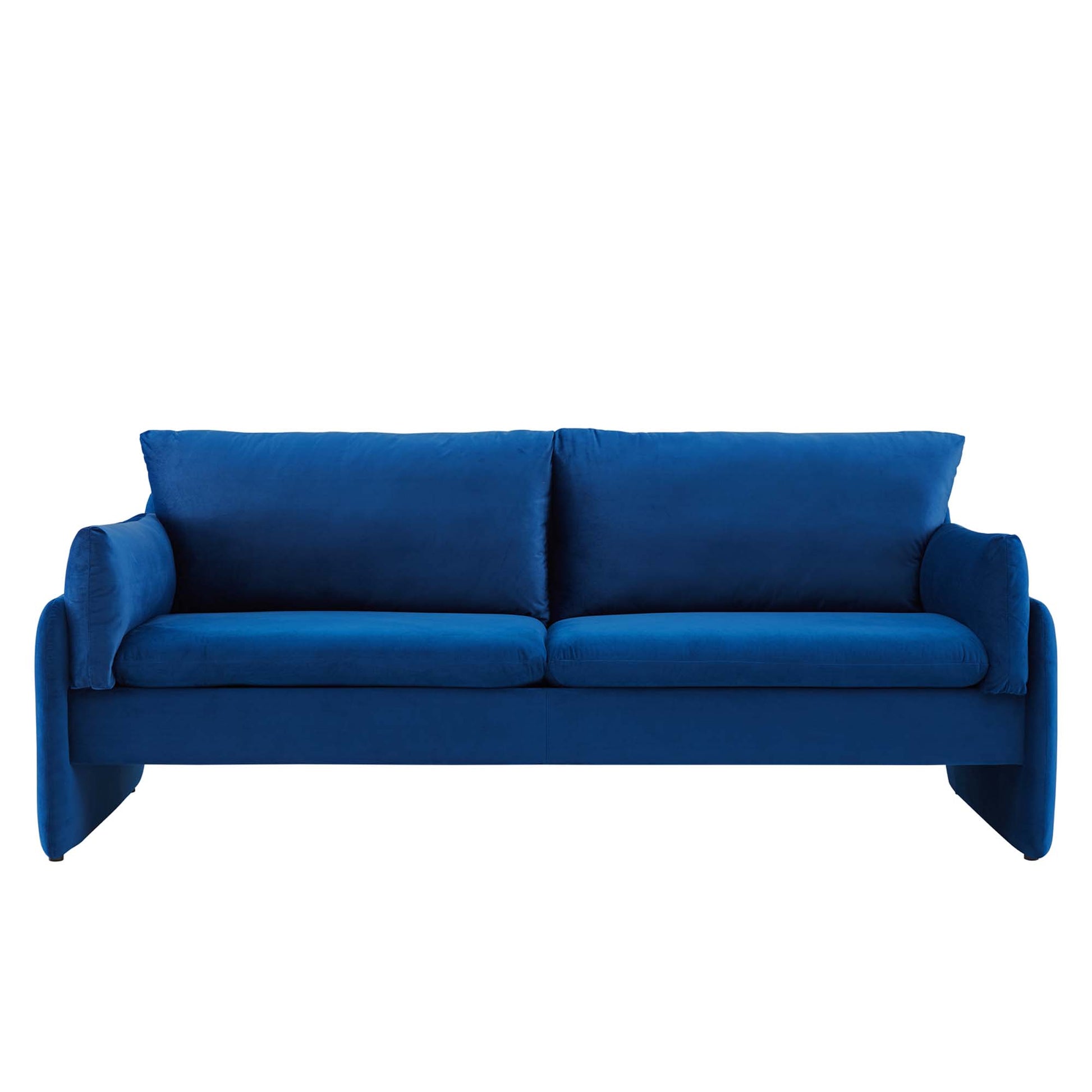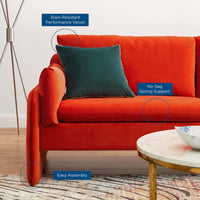 Reimagine your living space with the modern style and glam deco elegance of the Indicate Performance Velvet Sofa. Featuring a casual design with rounded corners and plush foam cushions, the look of this comfortable sofa is elevated by its luxurious stain-resistant performance velvet upholstery making it perfect for a living room, office, bedroom, or other lounge area. A no-sag spring support system grants a premium seating experience while non-marking foot caps protect your flooring. This living room sofa ships conveniently to your doorstep in a portable box for effortless maneuvering with easy-to-follow assembly instructions. Weight Capacity: 992 lbs.