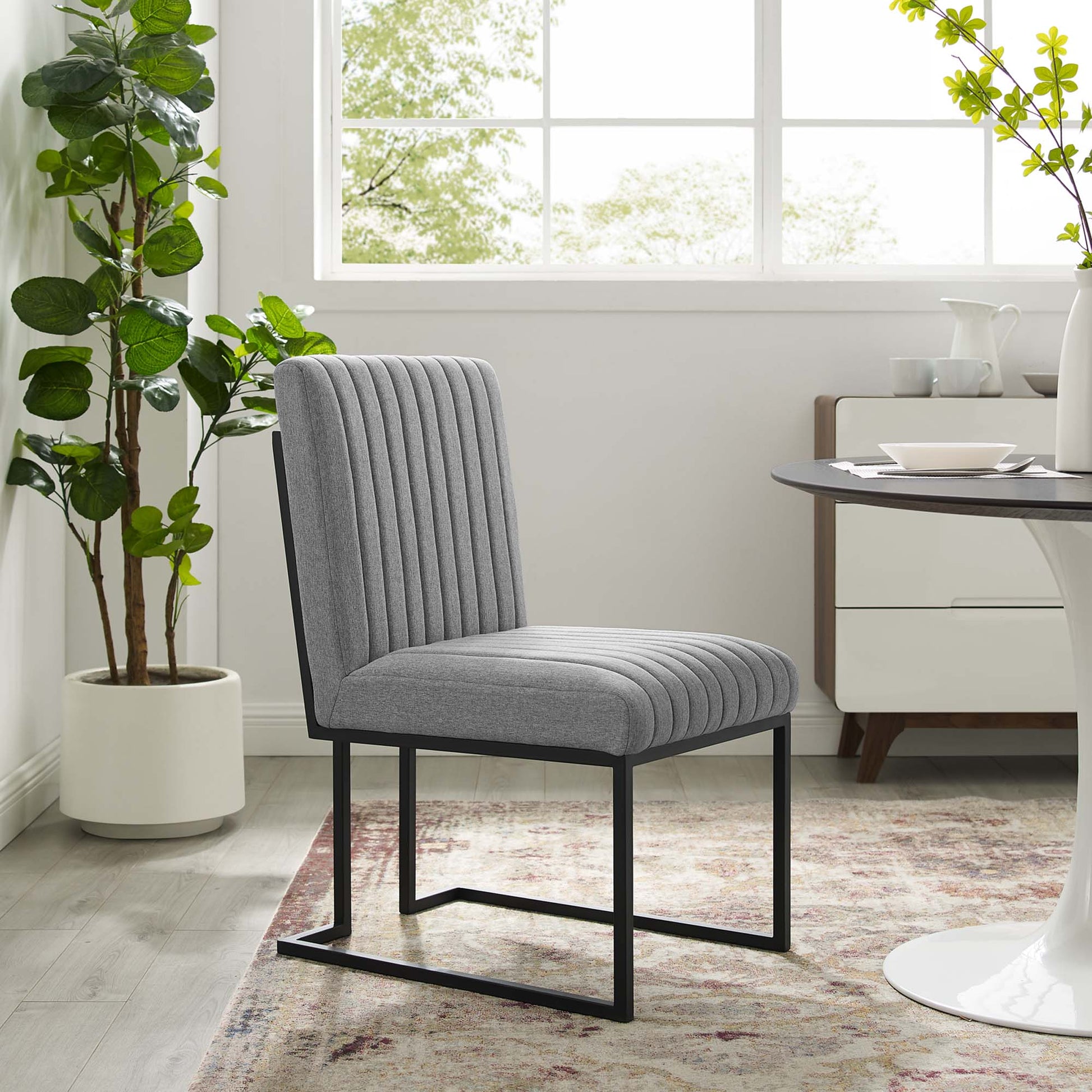 Inspire retro design and modern style in your dining room with the Indulge Channel Tufted Dining Chair. Mid-century inspired channel tufting flows effortlessly into the matte black stainless steel sled base of this dining accent chair. Covered in soft polyester fabric, this upholstered chair is complete with dense foam padding creating a comfortable, supportive place to sit while dining. Bring contemporary style to your living space, dining room, lounge area, or home office with this dining chair. Includes non-marking foot caps. Chair Weight Capacity: 330 lbs.
