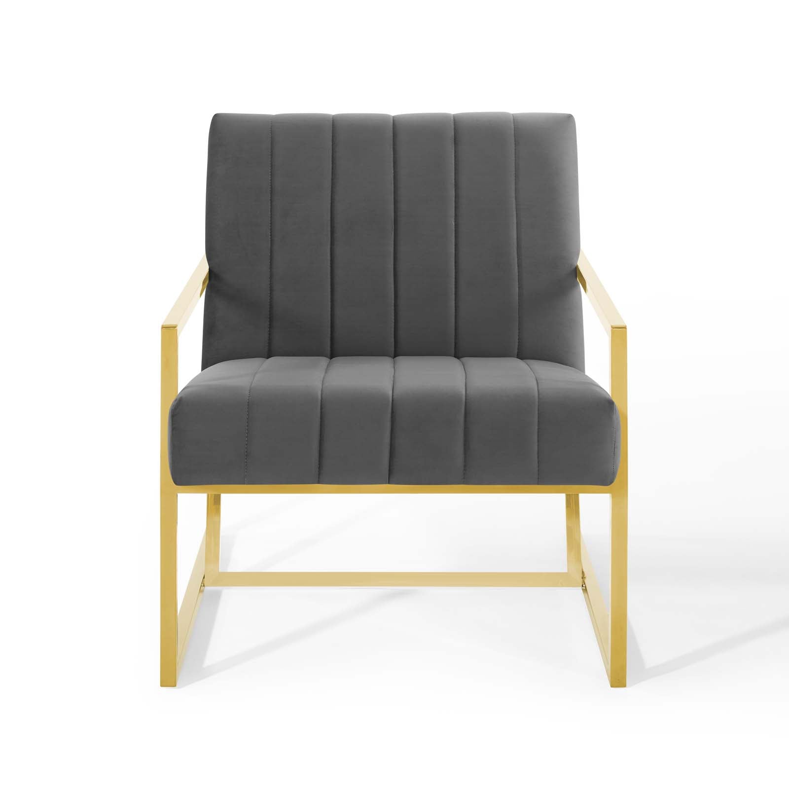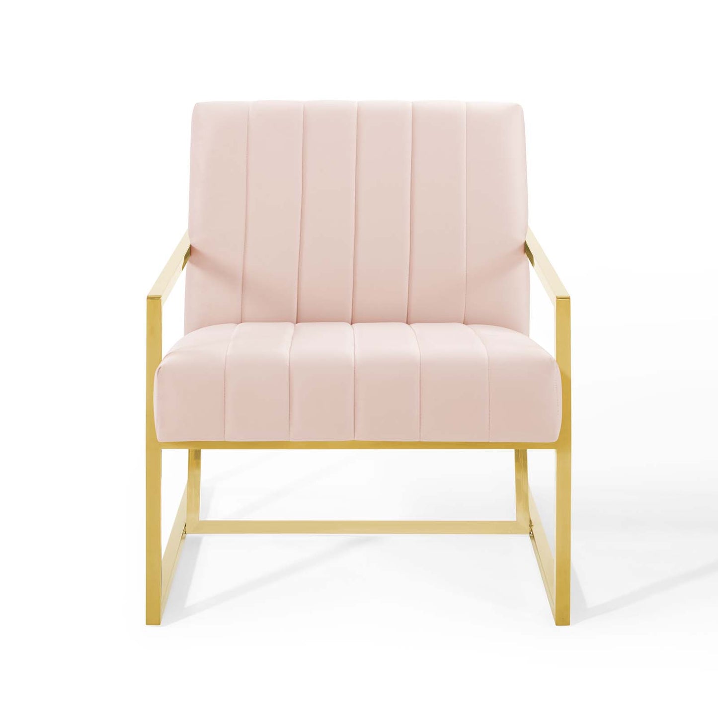 Style the canvas of your living room with the crisply elegant Inspire Channel Tufted Performance Velvet Upholstered Accent Armchair. The crisp lines of the vertical channel tufting seamlessly flow into the geometric polished gold stainless steel frame for a living room chair that stands out in your lounge decor. Dense foam padding and an spring coil support system present comfort unrivaled for an accent armchair your friends and family will be drawn to relax in at every gathering. Soft and durable stain-resistant performance velvet polyester upholstery provides tactile luxury for the solidly constructed glam deco Inspire Accent Chair while non-marking foot caps provide protection for your floors. No Assembly Required. Chair Weight Capacity: 441 lbs.