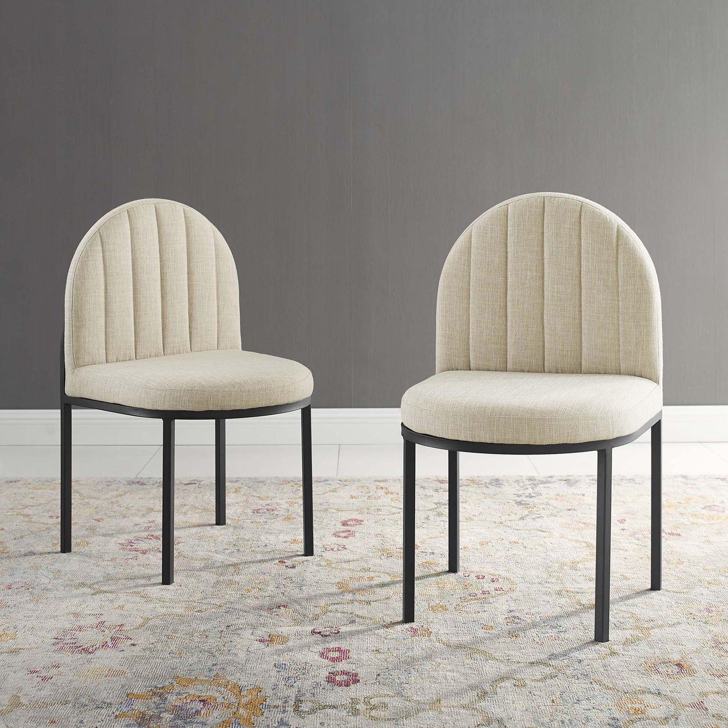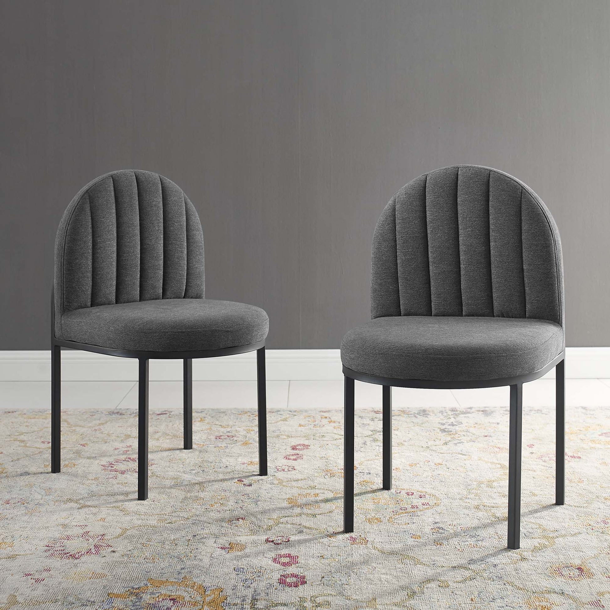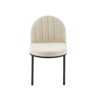 Reinvent your dining room decor with the vintage glamour of the Isla Channel Tufted Upholstered Fabric Dining Room Side Chair. Featuring a vintage clamshell design and the bold lines of channel tufted accents, the Isla Dining Accent Chair is a piece to be remarked upon by guests and friends. Dense foam padding provides a comfortable seat, while soft and durable polyester fabric upholstery creates a luxe elegance for long-lasting use. The curved matte black stainless steel frame on the Isla Side Chair has four legs with non marking foot caps to protect flooring. Chair Weight Capacity: 331 lbs.