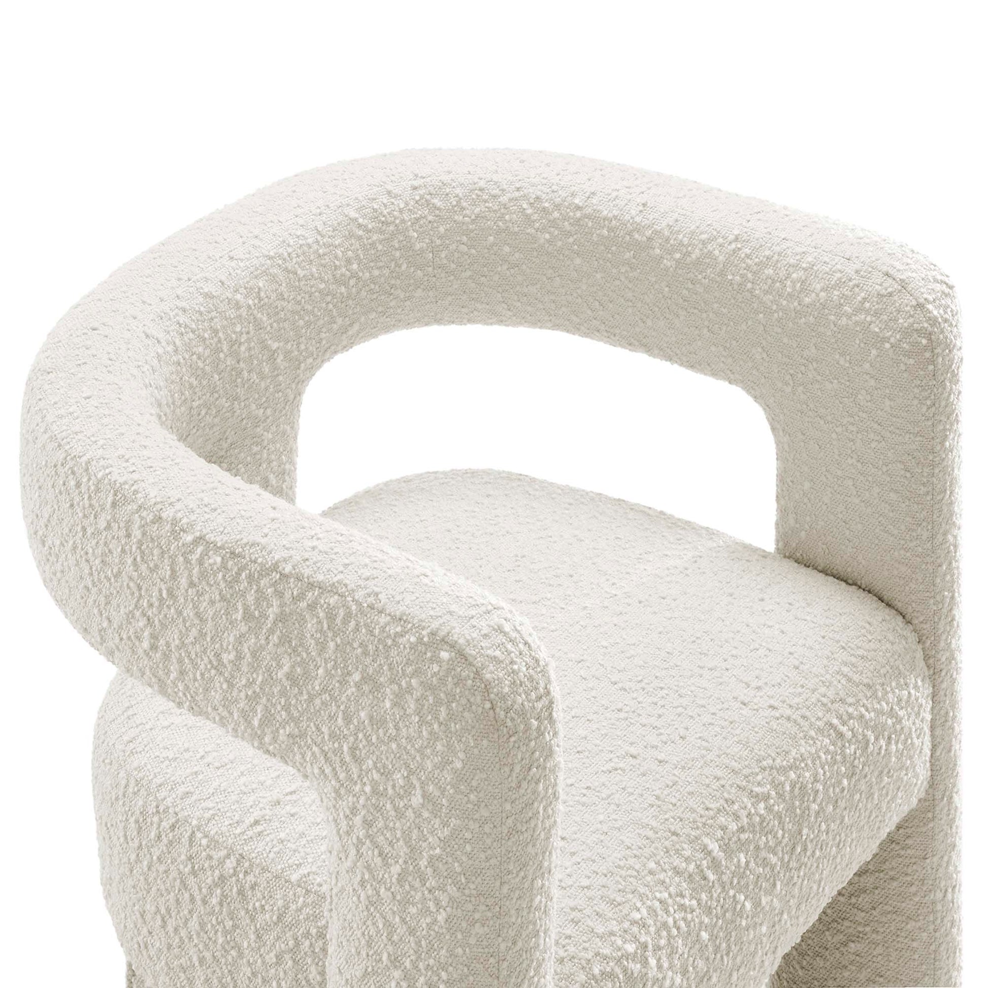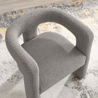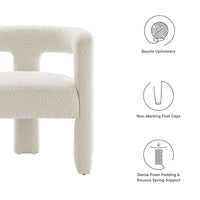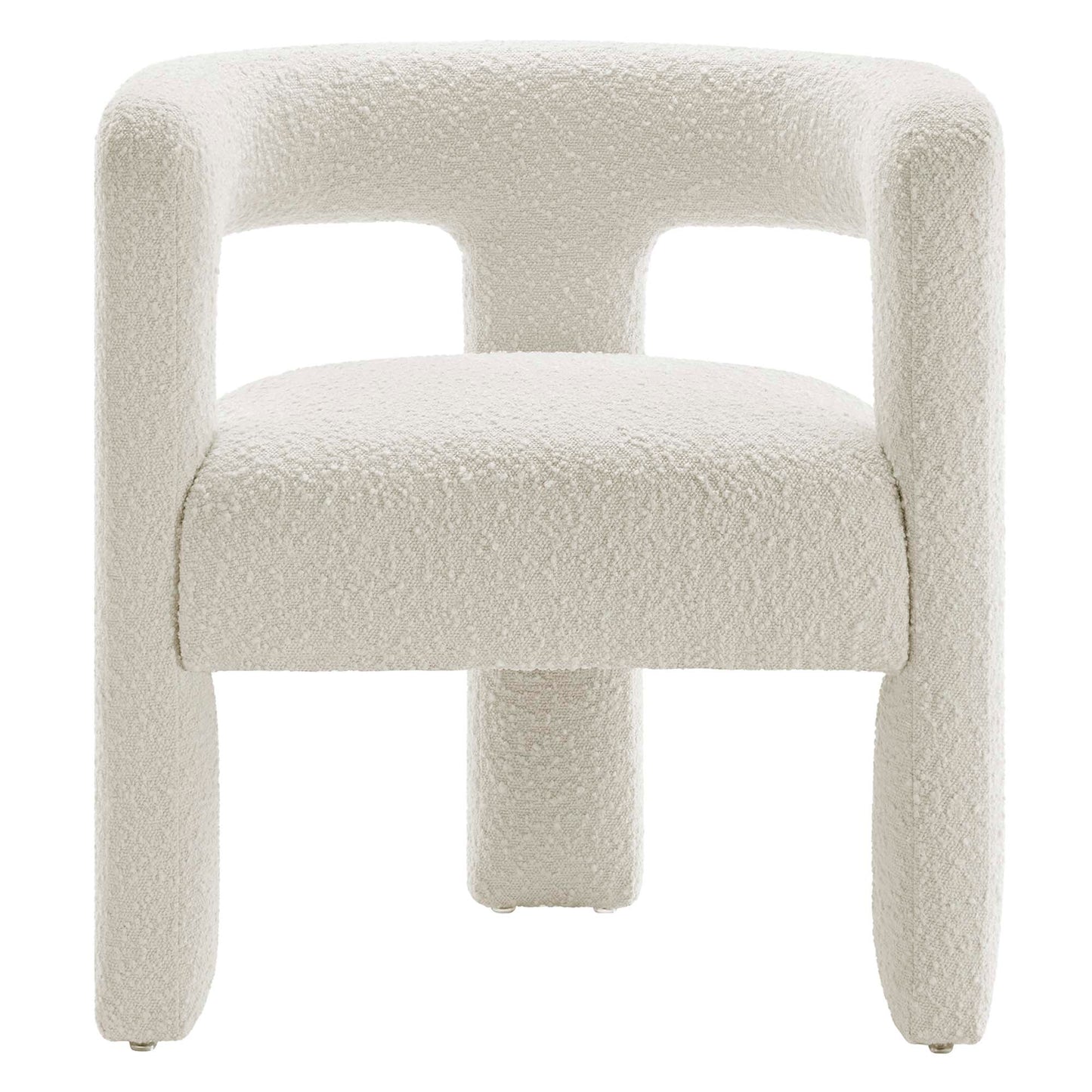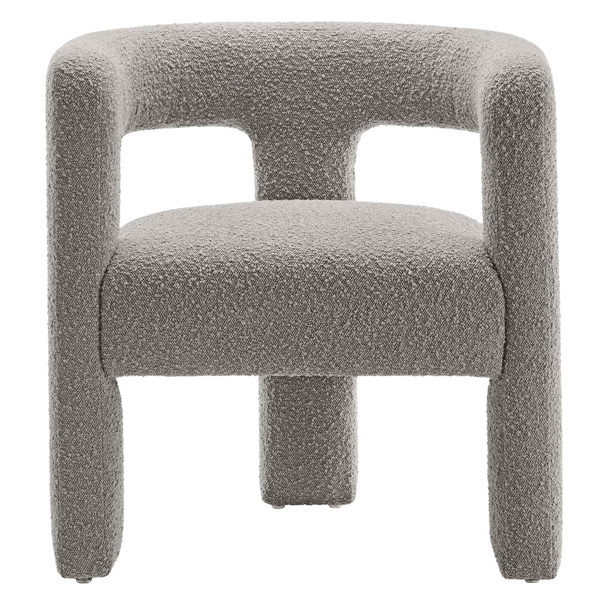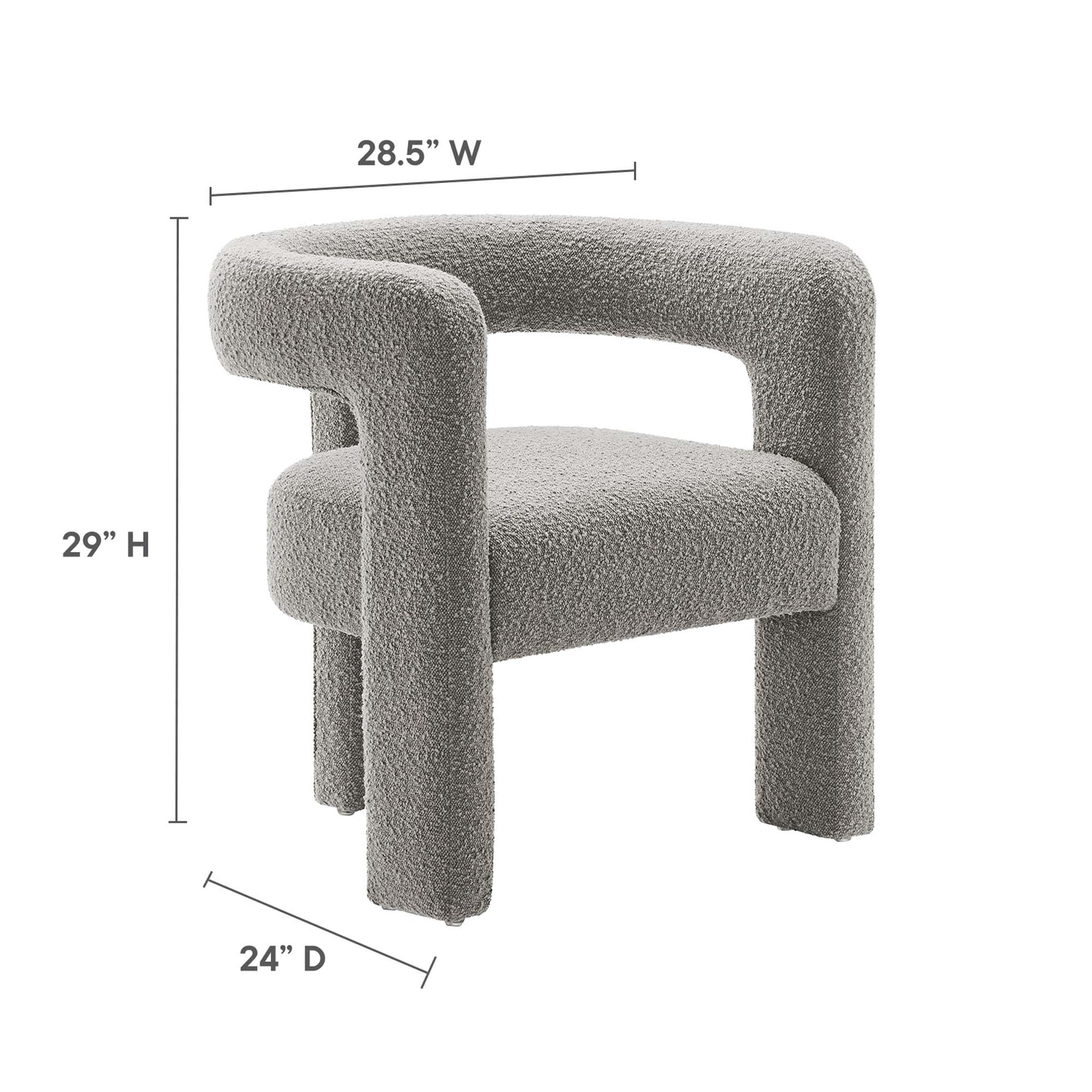 Experience unmatched comfort and sleek modernity with the Kayla Boucle Armchair. Its progressive design and rounded open profile make a chic statement in any space. The boucle fabric adds a delightful touch with its charming nubby texture. Crafted with a sturdy wood frame, sinuous spring support, and dense foam padding, this accent chair offers premium comfort and durability. Non-marking foot glides protect your floors. Elevate your space with the Kayla Boucle Armchair—where modern luxury meets everyday elegance. Weight Capacity: 330 lbs.