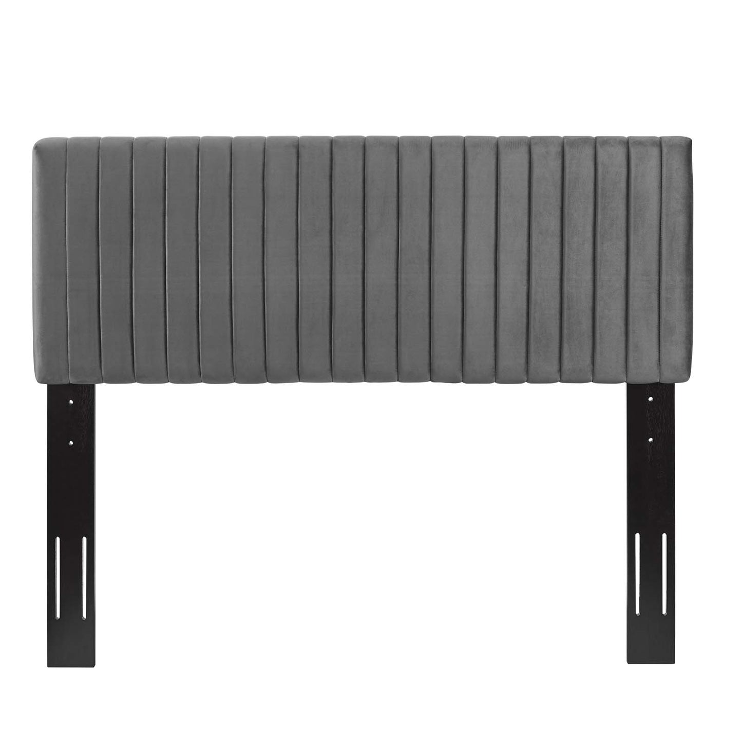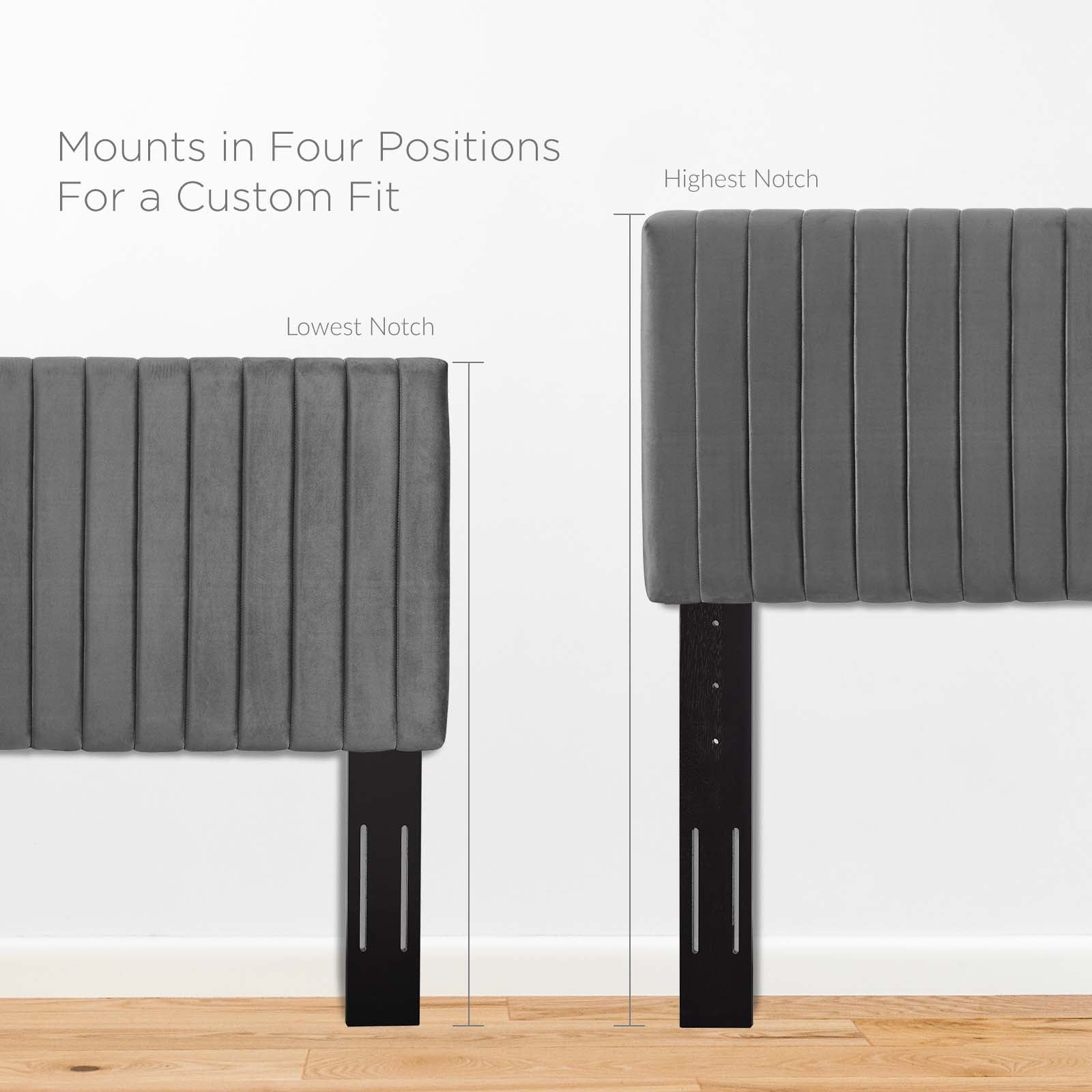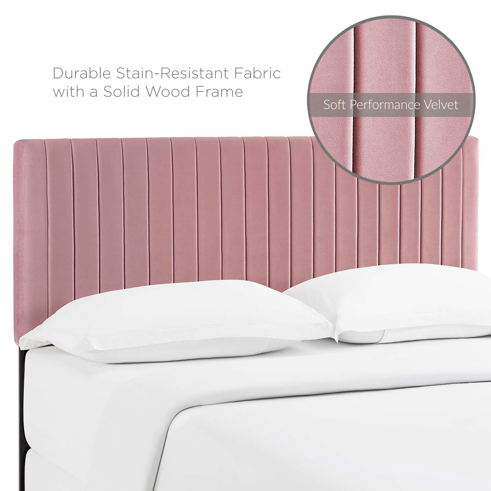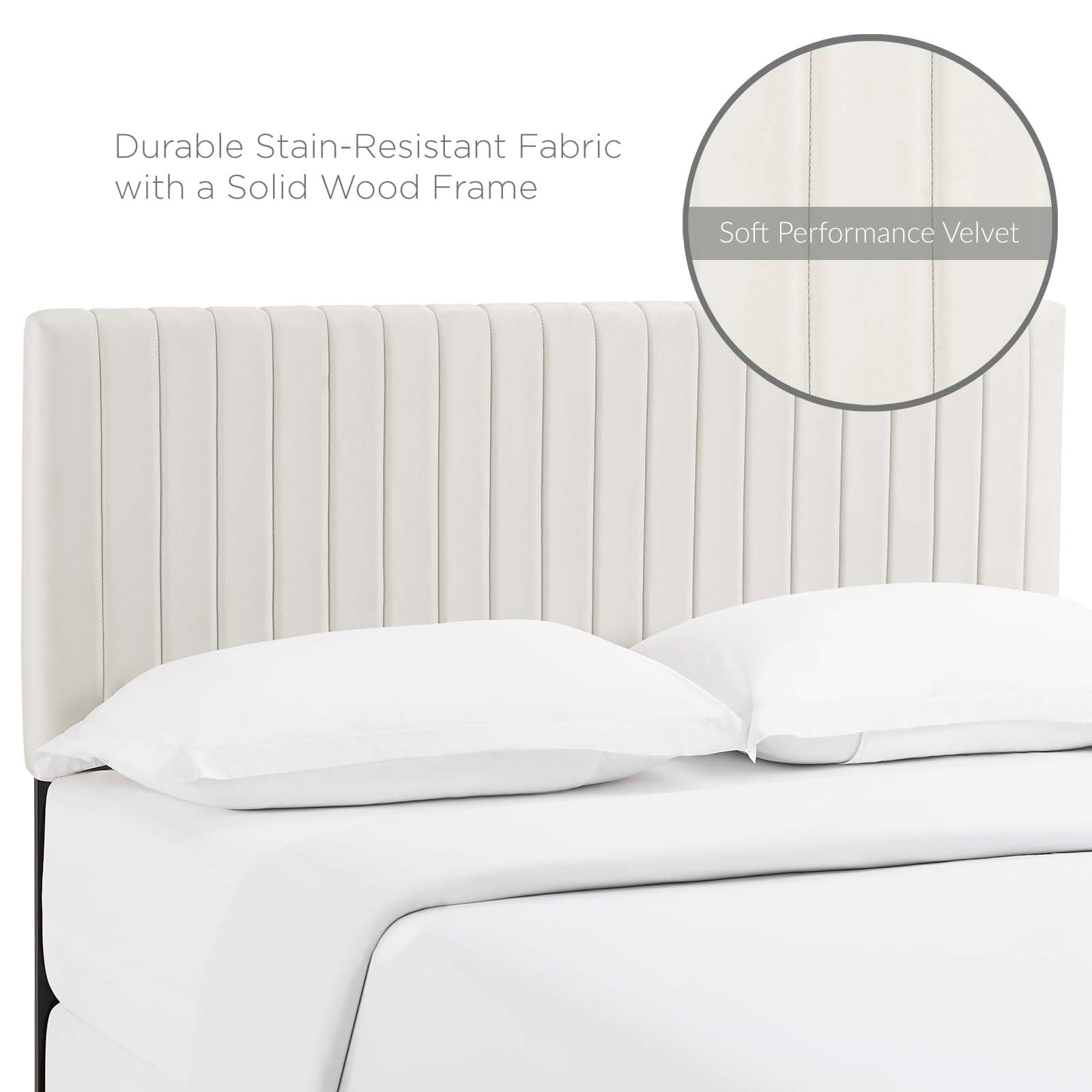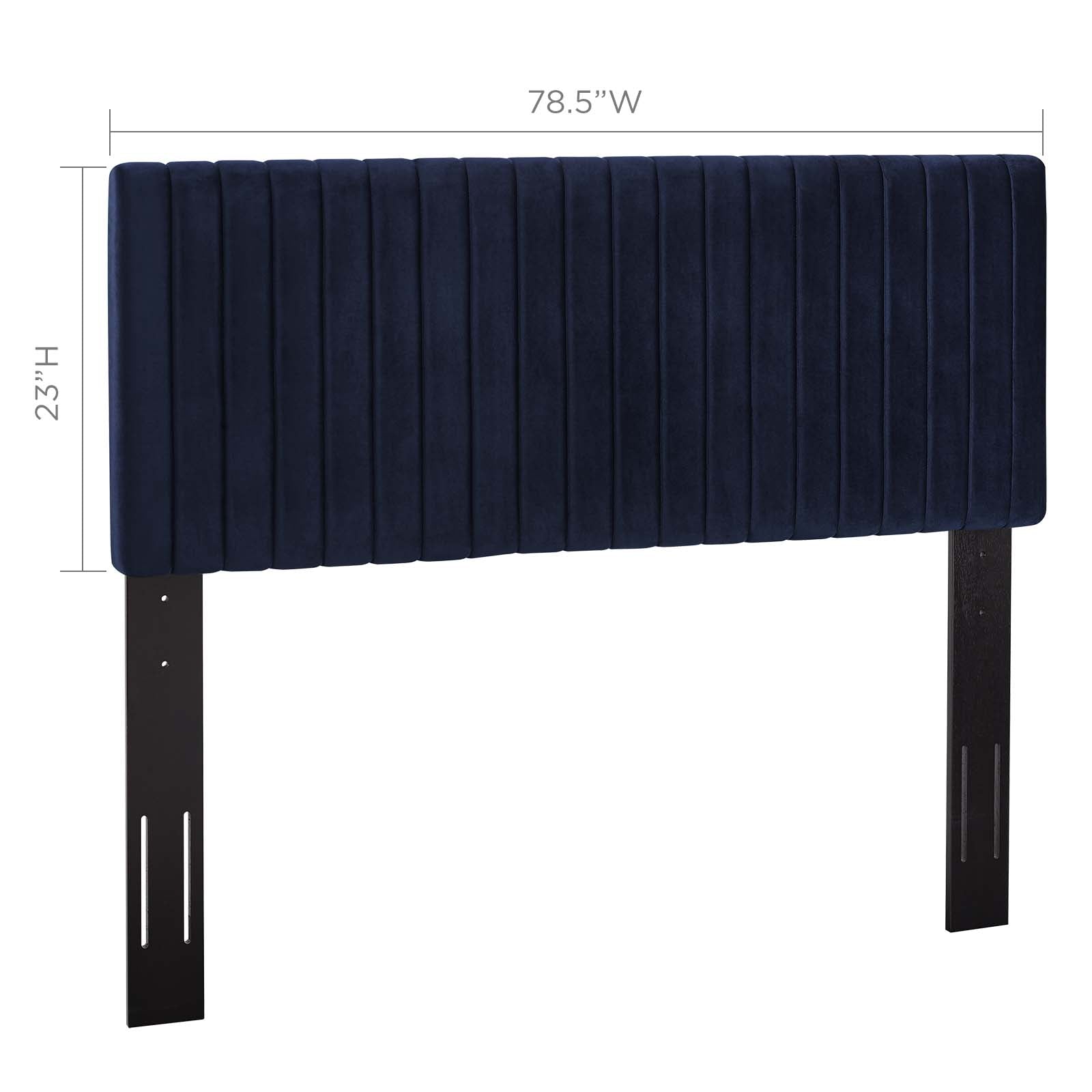 Refresh your master bedroom with the Keira King/California King Headboard. This elegant king headboard makes a luxe statement with its channel tufting, velvet texture, and chic squared profile. Boasting a modern design with timeless appeal, this upholstered headboard is covered in soft performance velvet made of stain-resistant polyester and features a solid wood and particleboard construction that’s durable and long-lasting. Lean back and relax while reading or watching TV in bed with the dense foam padding on this upholstered king headboard. Fits king and California king size beds.