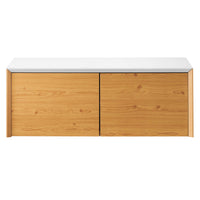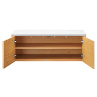 The Kinetic Wall-Mount Cabinet introduces stylish storage to a home office or living space. Crafted from durable, lightweight particleboard and featuring a complementing melamine top, this cabinet's concealed storage area is accessed through two magnetic-close doors. Kinetic boasts a wide interior shelf, perfect for storing office essentials, home accessories, media equipment, and more. With an organic wood grain design, this home office cabinet adds a touch of natural elegance to any room and mounts directly to the wall to save valuable floor space. Although designed with the workplace in mind, this wall-mounted cabinet can also serve its purpose in the entryway, living room, hallway, or lounge area. Say goodbye to clutter and hello to organization with this versatile storage solution. Assembly required. Weight Capacity: 200 lbs.