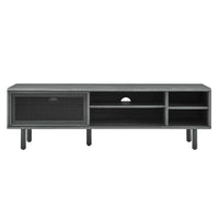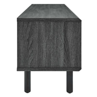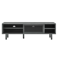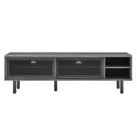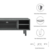 Bring urban flare to your living space with the modern design of the Kurtis 60" TV Stand. Featuring sliding metal mesh doors, this entertainment center brings industrial design to the living room, bedroom, home office, or lounge area. This media stand is crafted from MDF and particleboard with a natural wood grain design. Offering ample storage space for all your media essentials, this TV console features an open shelving area concealed by mesh sliding doors with cable management holes that keep things organized and allow for flow through ventilation. Resting on sturdy wood legs with non-marking foot pads to protect flooring, this low-profile TV stand accommodates flat screen TVs up to 65 inches. Assembly required. Weight Capacity: 200 lbs.
