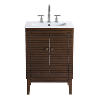 Mid-century style inspired the modern look of the Ledger 24" Bathroom Vanity. With square brass hardware, this vanity is made with solid mindi wood and showcases a beautifully carved linear design that adds intrigue and interest. Resting on tapered legs, this vanity features a spacious storage area behind two soft-close hinged doors perfect for concealing all your bathroom essentials. Blending style and function, this bathroom vanity is complete with a ceramic sink basin with 8-inch centerset holes and an integrated countertop. Includes non-marking foot caps. Assembly required. Fixtures not included.