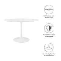 Let modern inspiration flow while gathered around the Lippa 48" Round Dining Table. Perfect for entertaining family and friends or everyday dining, this pedestal table comfortably seats four. Its round tabletop is crafted with MDF with a high gloss finish and beveled edge for a contemporary yet timeless design. Embodying an iconic mid-century silhouette, this pedestal dining table floats on a sleek tapered metal pedestal base with a chip-resistant lacquered finish. Includes non-marking felt pad to protect flooring. Assembly required.