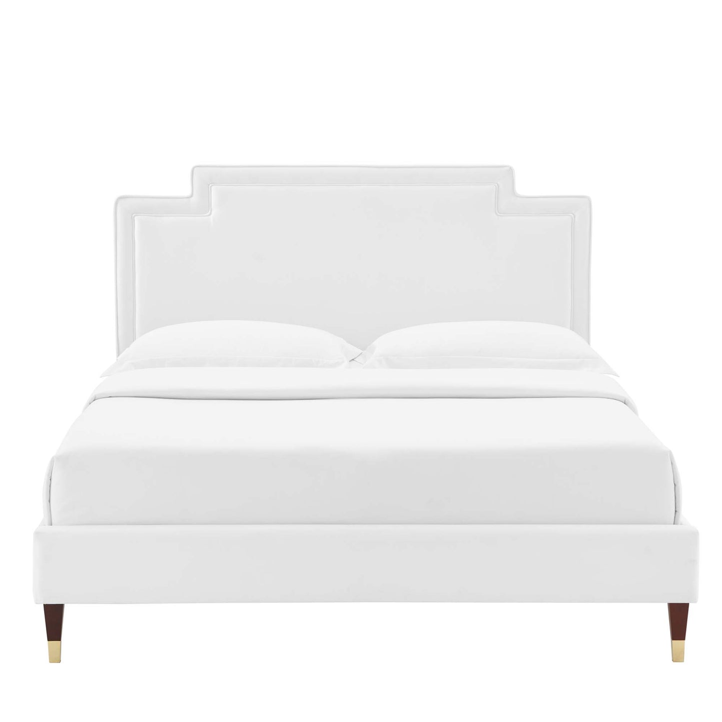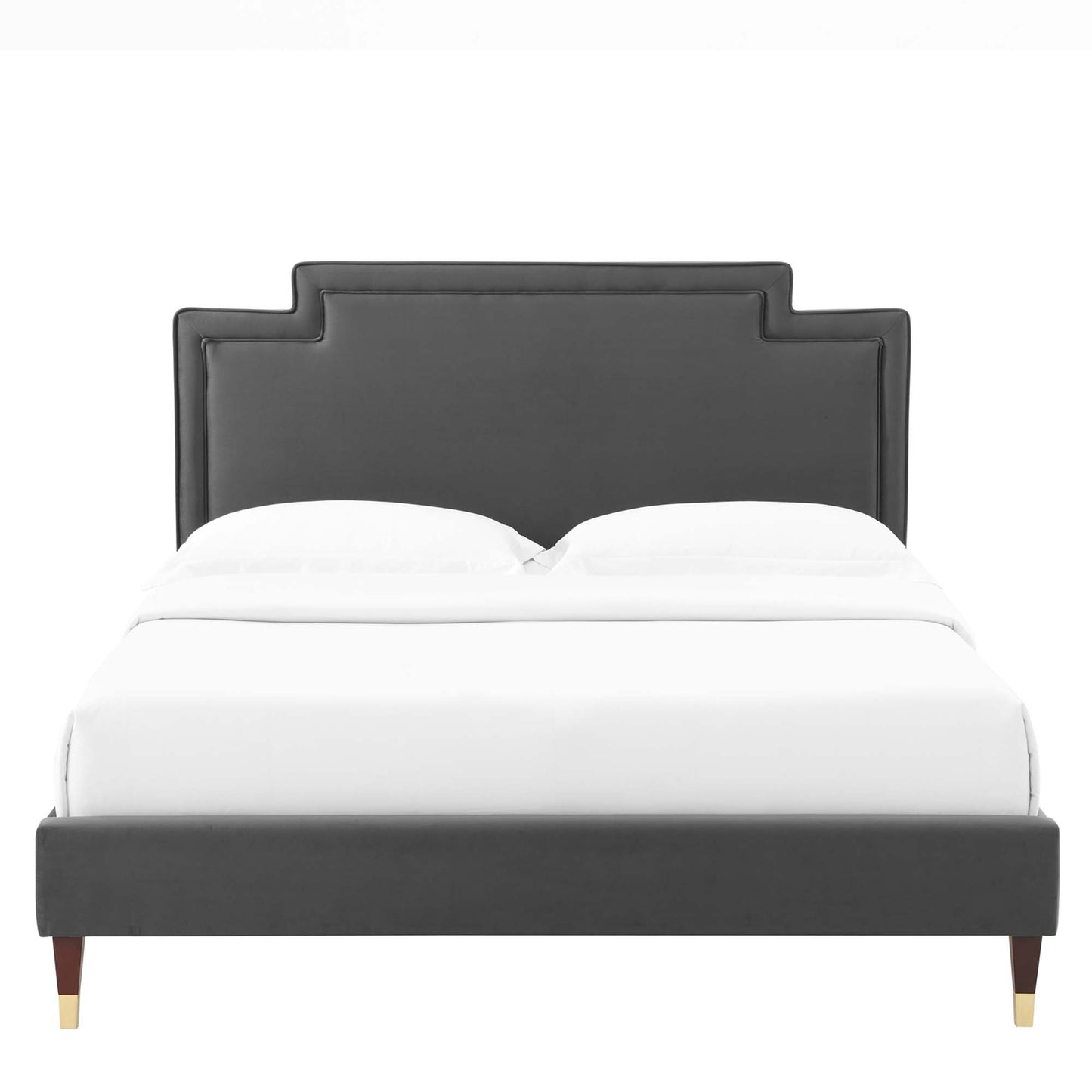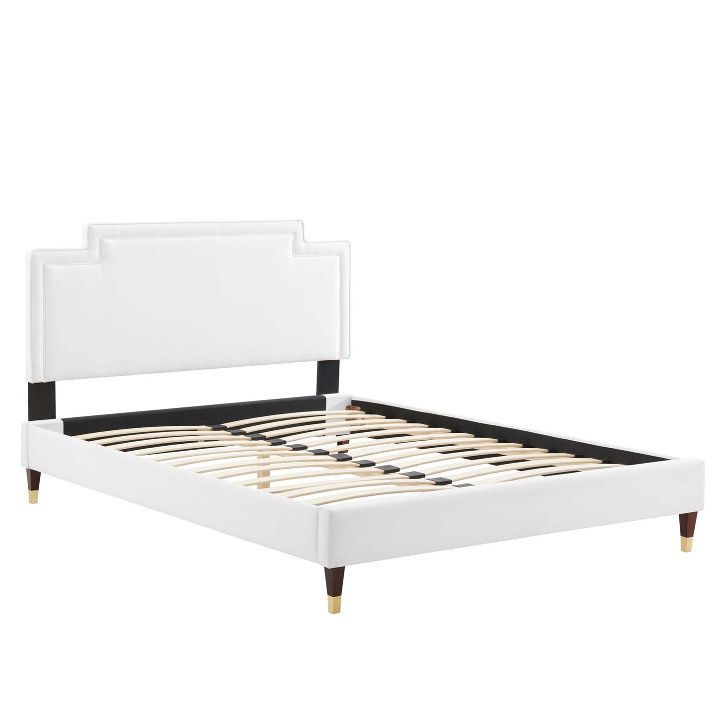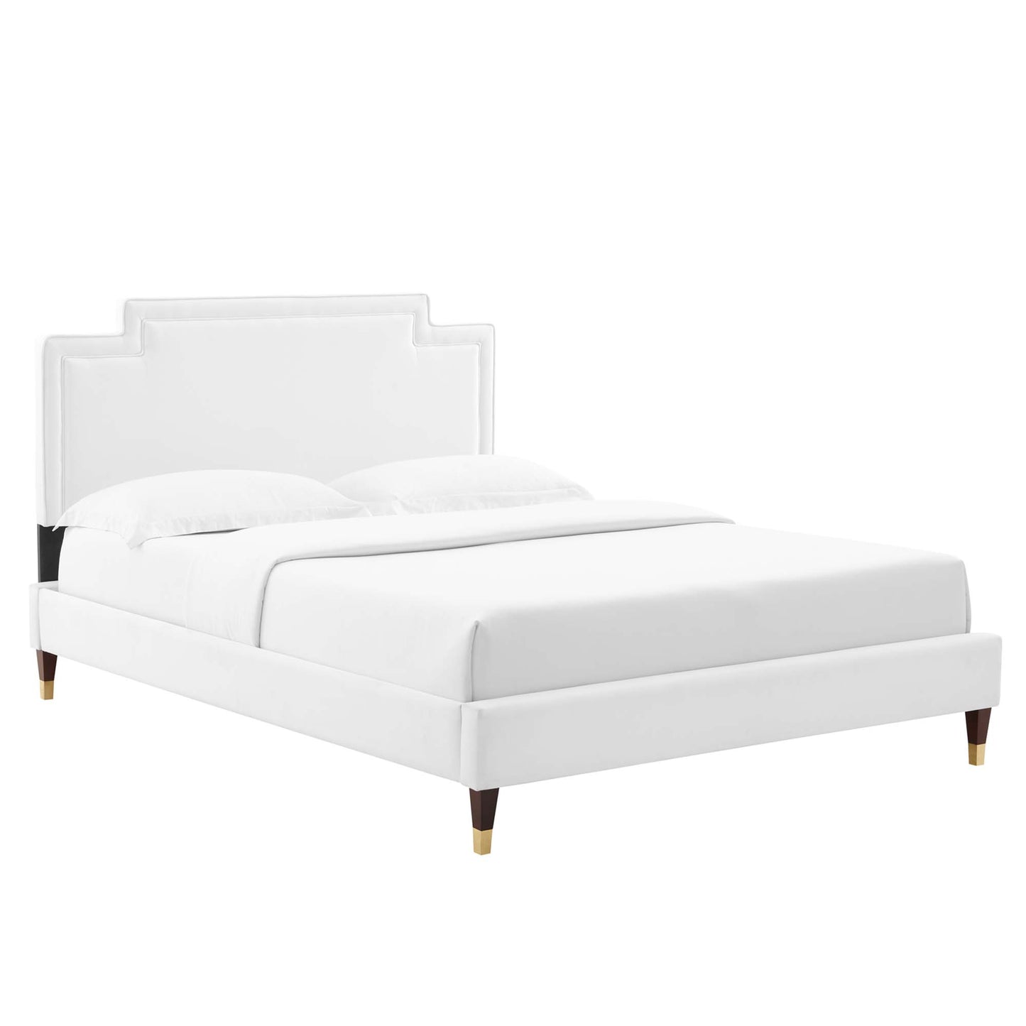 Cultivate an aura of refinement in your master bedroom or guest room decor with the sleek design of the Liva Performance Velvet King Bed. The modern upholstered headboard features delicate French piping and is an alluring focal point sturdily constructed on solid plywood and MDF frame. Complementing mid-century modern, contemporary, or eclectic decors, the Liva Upholstered King Bed brings an essence of restfulness, featuring stain-resistant performance velvet and dense foam padding. This king platform bed boasts a well-crafted MDF bed frame providing a sturdy foundation for memory foam, innerspring, latex, and hybrid mattresses. The Liva Upholstered Platform Bed features a durable poplar wood slat support system with a reinforced center beam and two support legs, eliminating the need for a box spring. The slatted bed frame rests on gold metal legs with non-marking foot caps. Assembly required. Weight Capacity: 800 lbs.