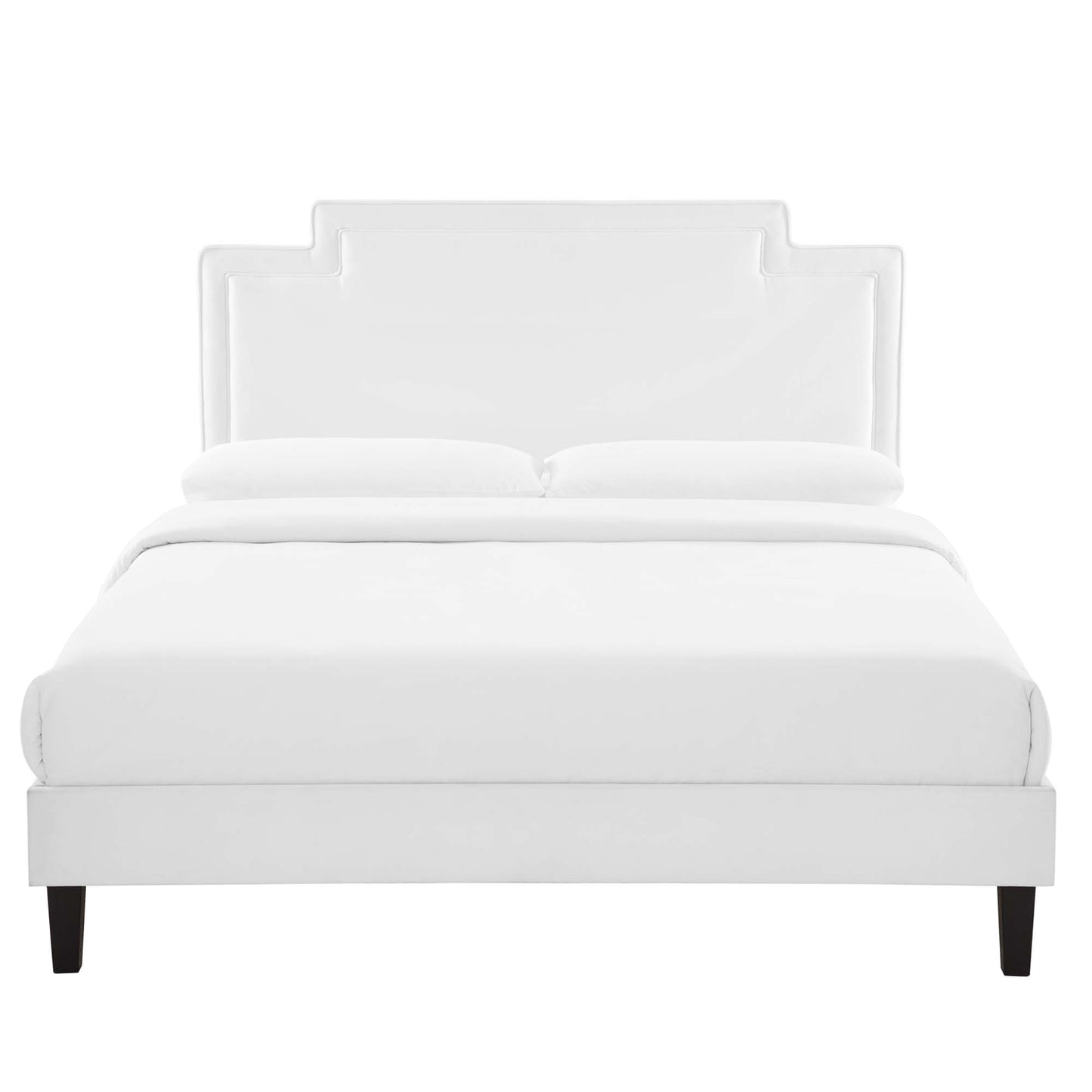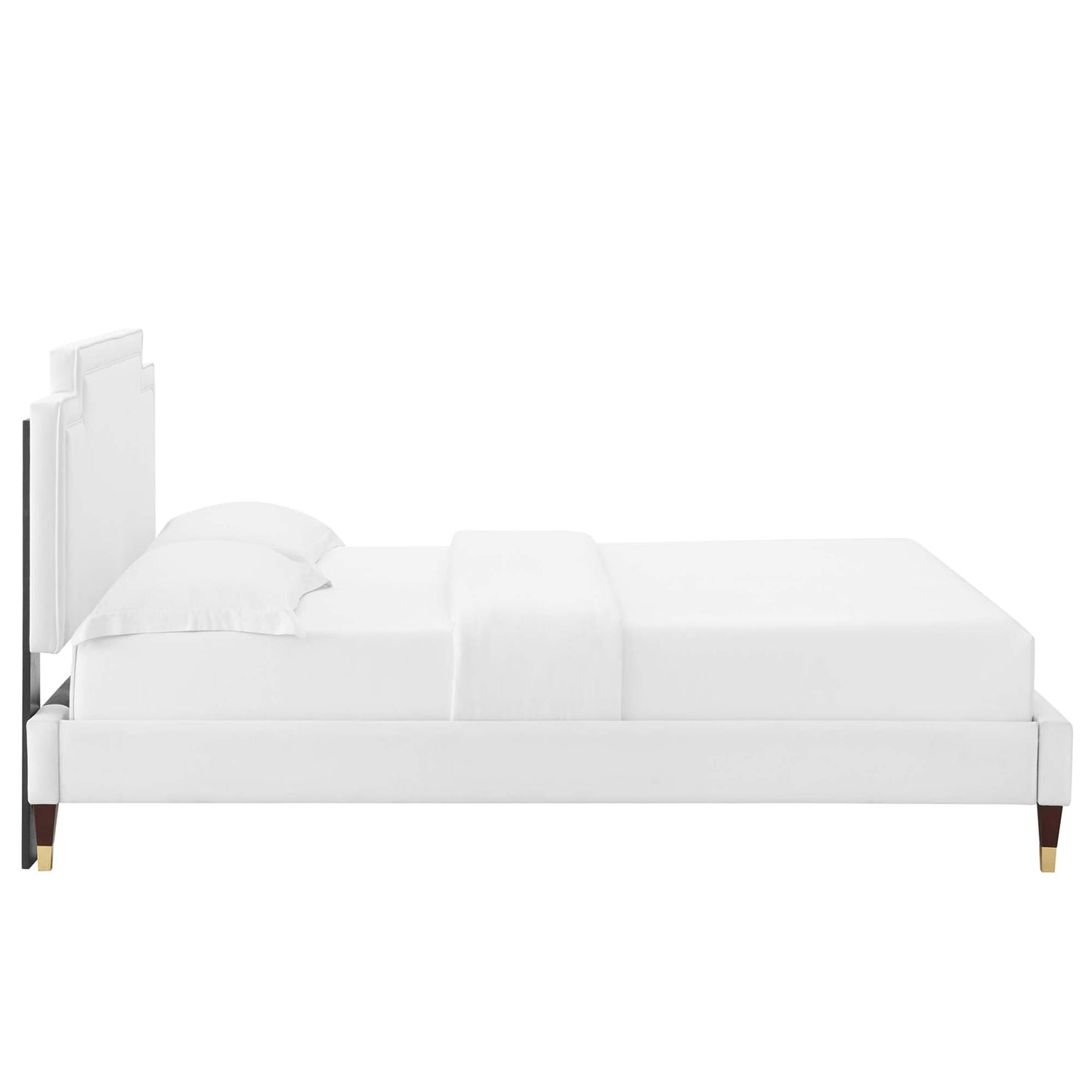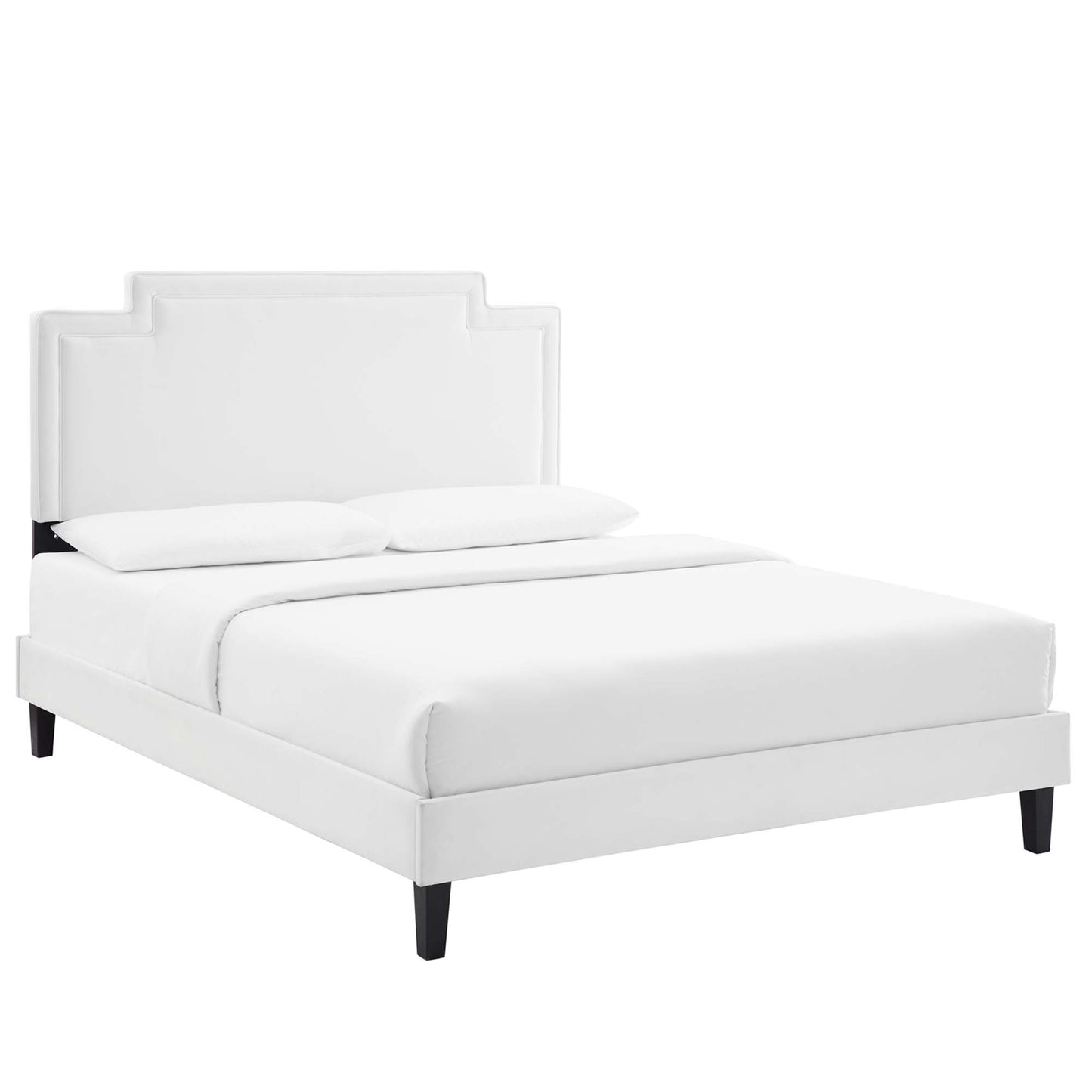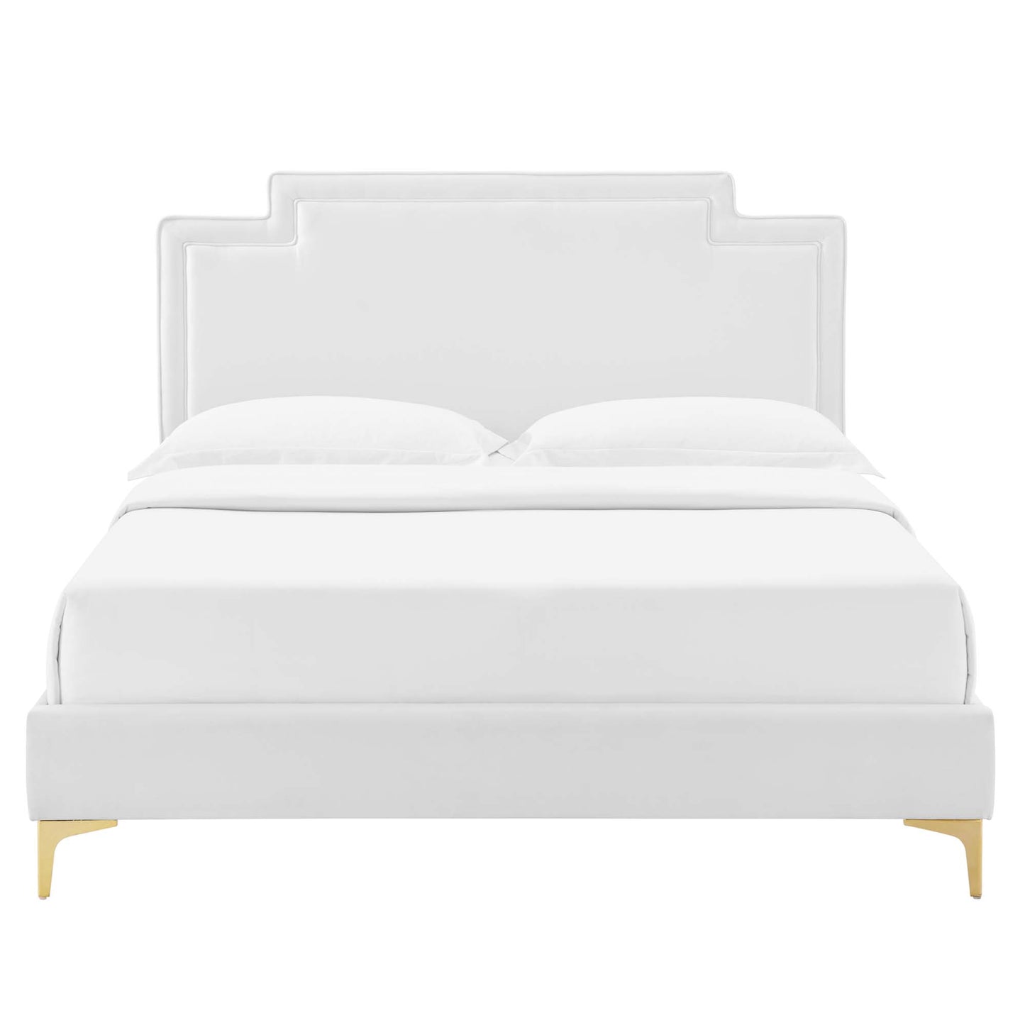 Cultivate an aura of refinement in your master bedroom or guest room decor with the sleek design of the Liva Performance Velvet King Bed. The modern upholstered headboard features delicate French piping and is an alluring focal point sturdily constructed on solid plywood and MDF frame. Complementing mid-century modern, contemporary, or eclectic decors, the Liva Upholstered King Bed brings an essence of restfulness, featuring stain-resistant performance velvet and dense foam padding. This king platform bed boasts a well-crafted MDF bed frame providing a sturdy foundation for memory foam, innerspring, latex, and hybrid mattresses. The Liva Upholstered Platform Bed features a durable poplar wood slat support system with a reinforced center beam and two support legs, eliminating the need for a box spring. The slatted bed frame rests on gold metal legs with non-marking foot caps. Assembly required. Weight Capacity: 800 lbs.