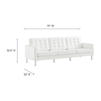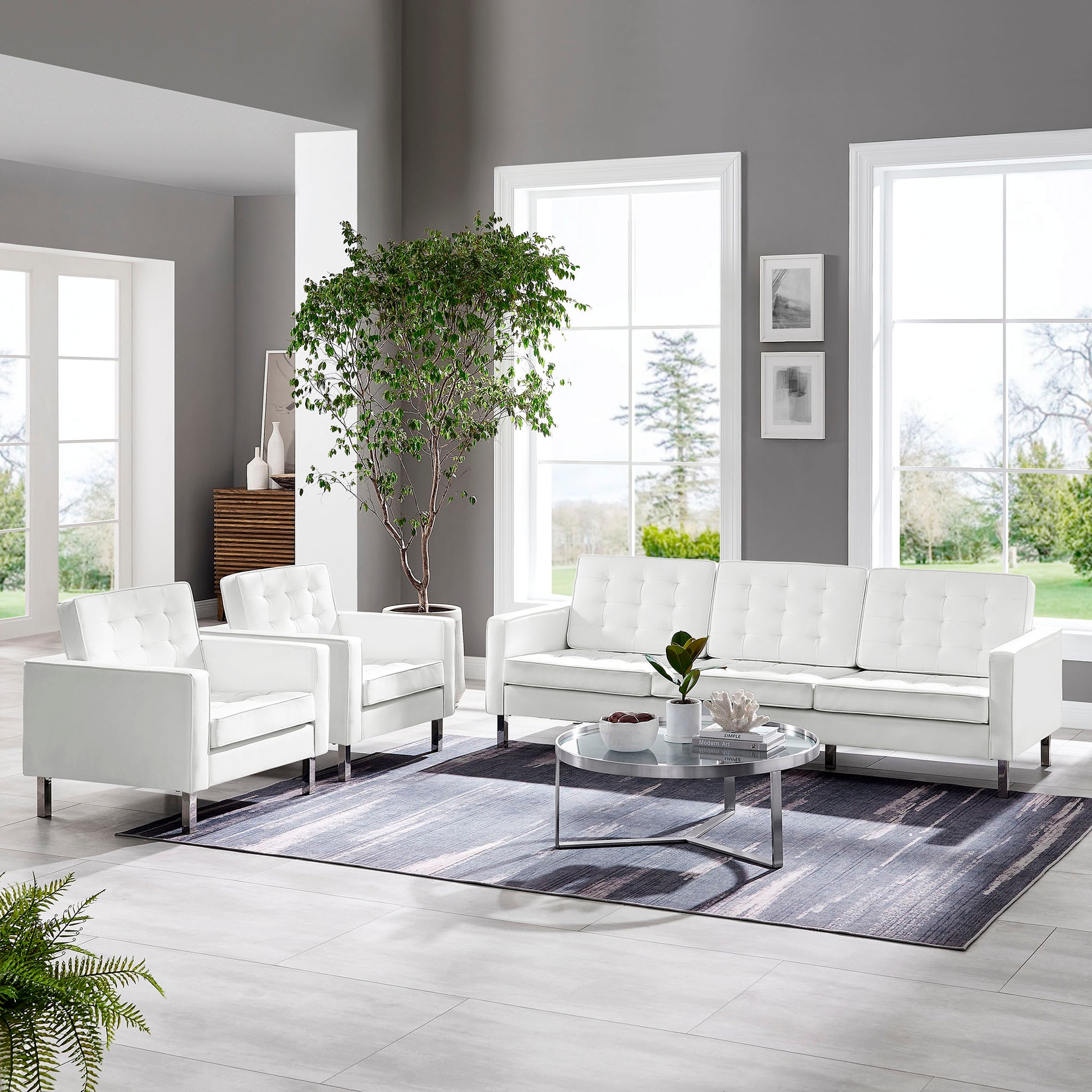 Revolutionize your living room furniture with the iconic Loft Vegan Leather Furniture Set. Adding visual depth to your living room or lounge space, Loft features soft and durable vegan leather upholstery accented with classic biscuit tufting. This modern living room furniture set showcases a captivating linear design, tubular stainless steel legs, and non-marking foot caps that protect flooring. Inspired by the richness of mid-century modern style, this stylish furniture set is an ideal choice for living rooms, office reception areas, and lounge spaces. Assembly required. Set Includes: 2 Armchairs, 1 Sofa