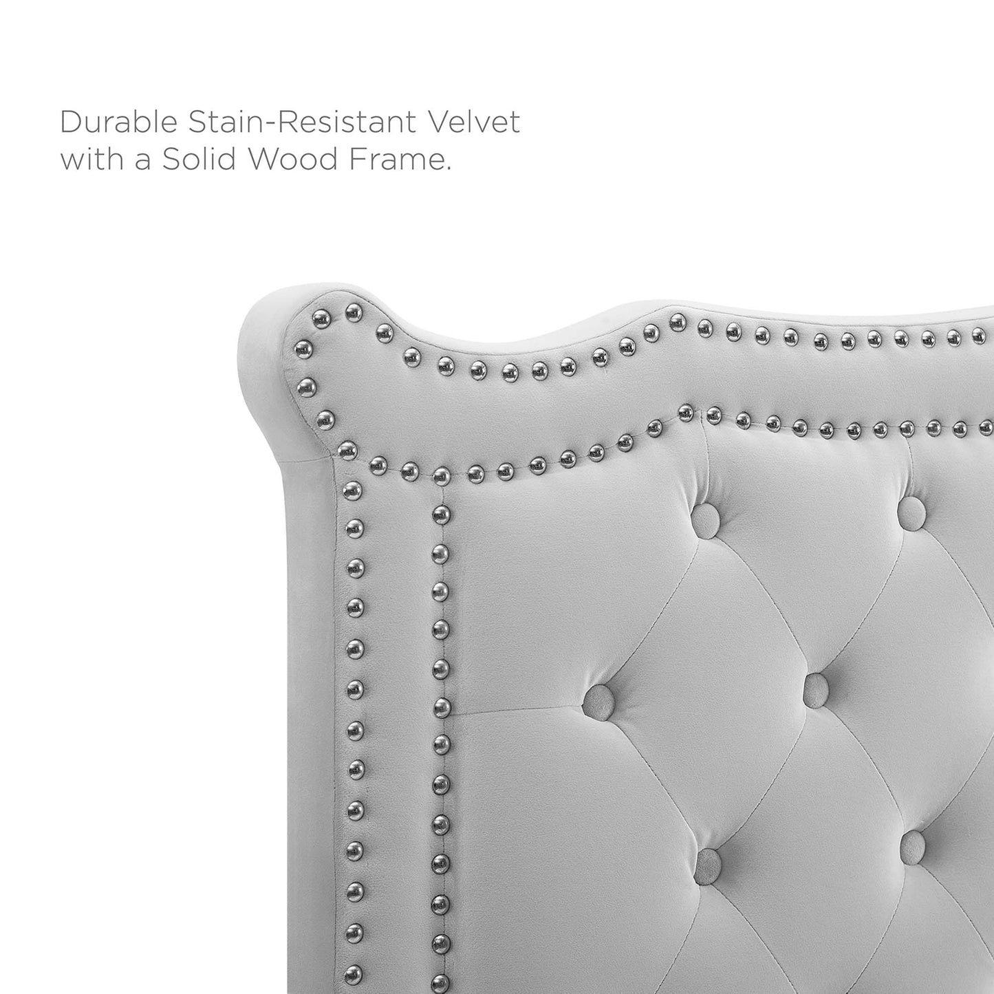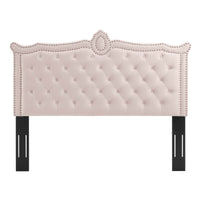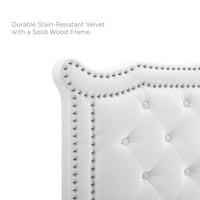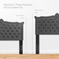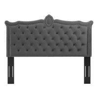 Elevate your master bedroom or guest bedroom decor with the opulent style and glam deco elegance of the Louisa Tufted Performance Velvet Full/Queen Headboard. Featuring classic button tufting, nailhead detail, and an ornate silhouette, this full/queen size headboard is rich in velvety texture and royal charm. This padded headboard features dense foam and soft, stain-resistant velvet upholstery granting supportive comfort while sitting up in bed resting and relaxing. A beautiful backdrop for a variety of bedding styles, this adjustable headboard full or queen bed frames with its three mounting positions. Assembly required.