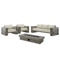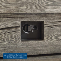 Capture a lakeside or cabin setting with the Manteo Outdoor Patio 4 Piece Set which includes a sofa, two armchairs, and fire pit table. Furniture made with solid magnesium oxide molding coated with a simulated driftwood finish create a stylish and sturdy finish. Complete with generously padded all-weather cushions, enjoy your outdoor leisure time with this versatile sofa set for your backyard, deck, lake house, patio, poolside, or porch. Tempered glass beads fill the center of the rectangular fire pit, lighting up surrounding silhouettes with a cozy golden glow. This propane gas fire table with a 50,000 BTU burner creates a smoke-free flame, is CSA certified, and burns up to 8 hours on high or up to 16 hours on low. Manteo comes with a protective PVC cover when not in use, and is easy to control for consistent heat with a simple turn of a knob and touch of an ignition button. Furniture equipped with non-marking foot caps and a protective cover, this comfortable outdoor sofa set will update your patio decor with a rustic modern feel.