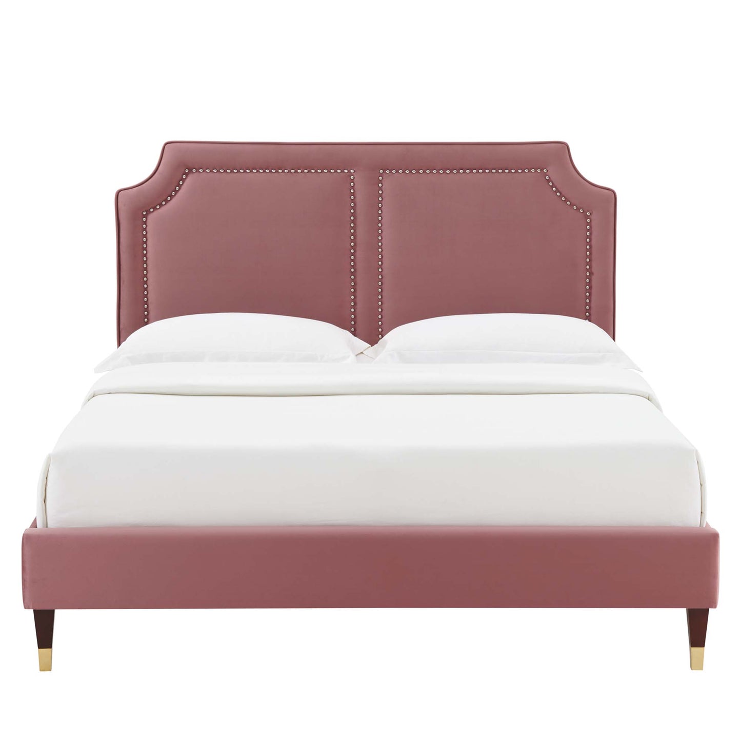 Cultivate an inspiring and upscale aesthetic in your master bedroom or guest room with the refined Novi Performance Velvet Queen Bed. The upholstered headboard is built with a solid plywood frame with artfully notched corners. The soft silhouette of the modern headboard is enhanced by the precise nailhead trim for glam deco style in mid-century modern or eclectic decors. This queen-sized platform bed is tailored in stain-resistant performance velvet and features a well-crafted MDF frame granting an enduring foundation for memory foam, innerspring, latex, and hybrid mattresses. A durable poplar wood slat support system ensures strength and steady support, eliminating the need for a box spring. The slatted bed frame has a reinforced center beam with two support legs for enhanced stability. Novi stands on gold metal legs with non-marking foot caps. Assembly required. Weight Capacity: 800 lbs.