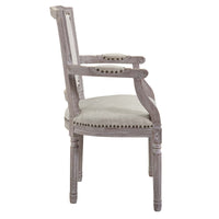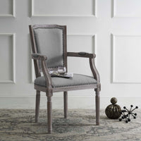 Revel in the whispered opulence of the Penchant Dining Armchair. Featuring a fluted wood frame, dense foam upholstered fabric seat and armrests, and antique copper nailhead trim, this dining or accent chair elegantly blends old world charm with modern intrigue. Designed with a weathered vintage French look and an undeniable appeal, Penchant supports up to 331 pounds and comes with foot pads to preserve flooring. Comes fully assembled.