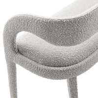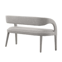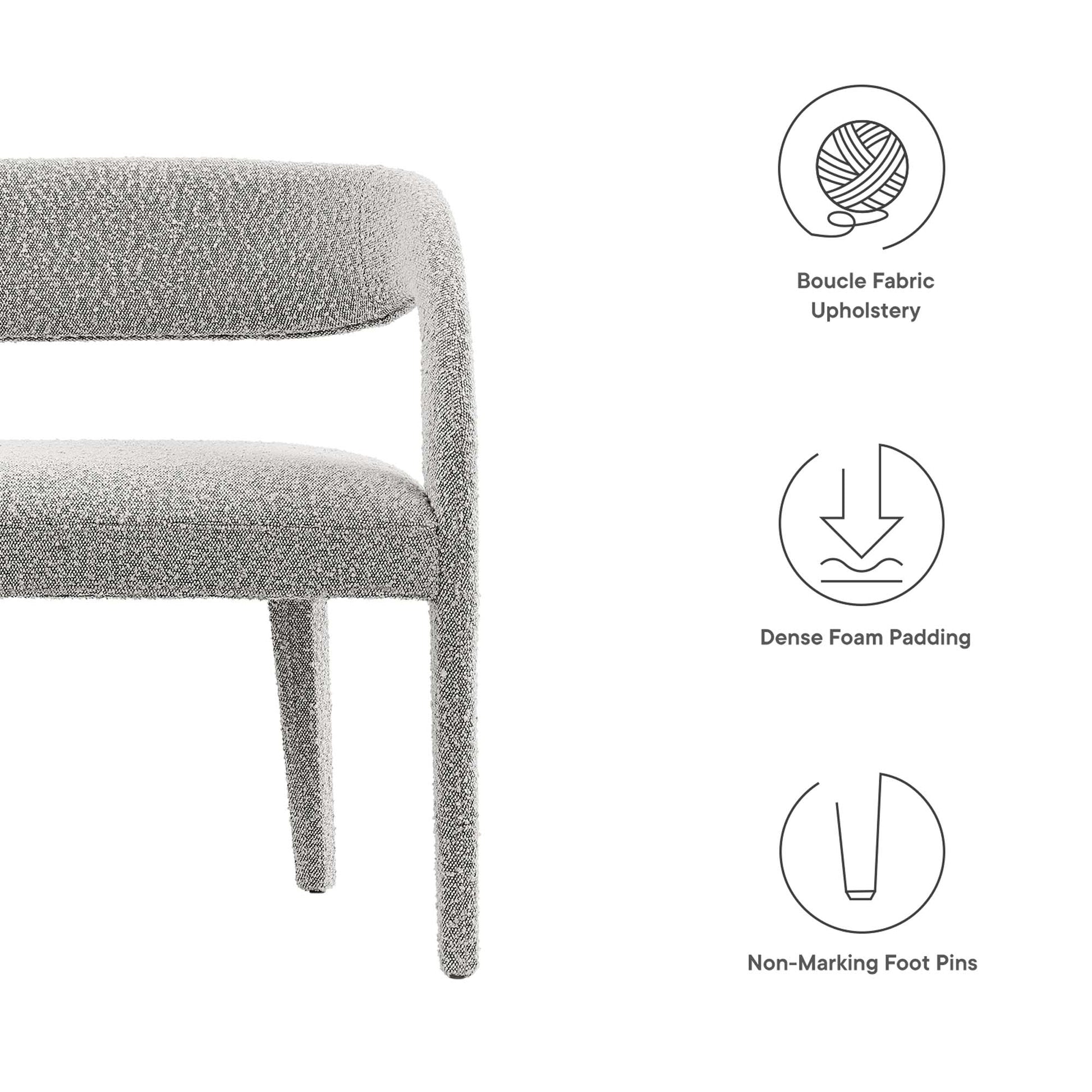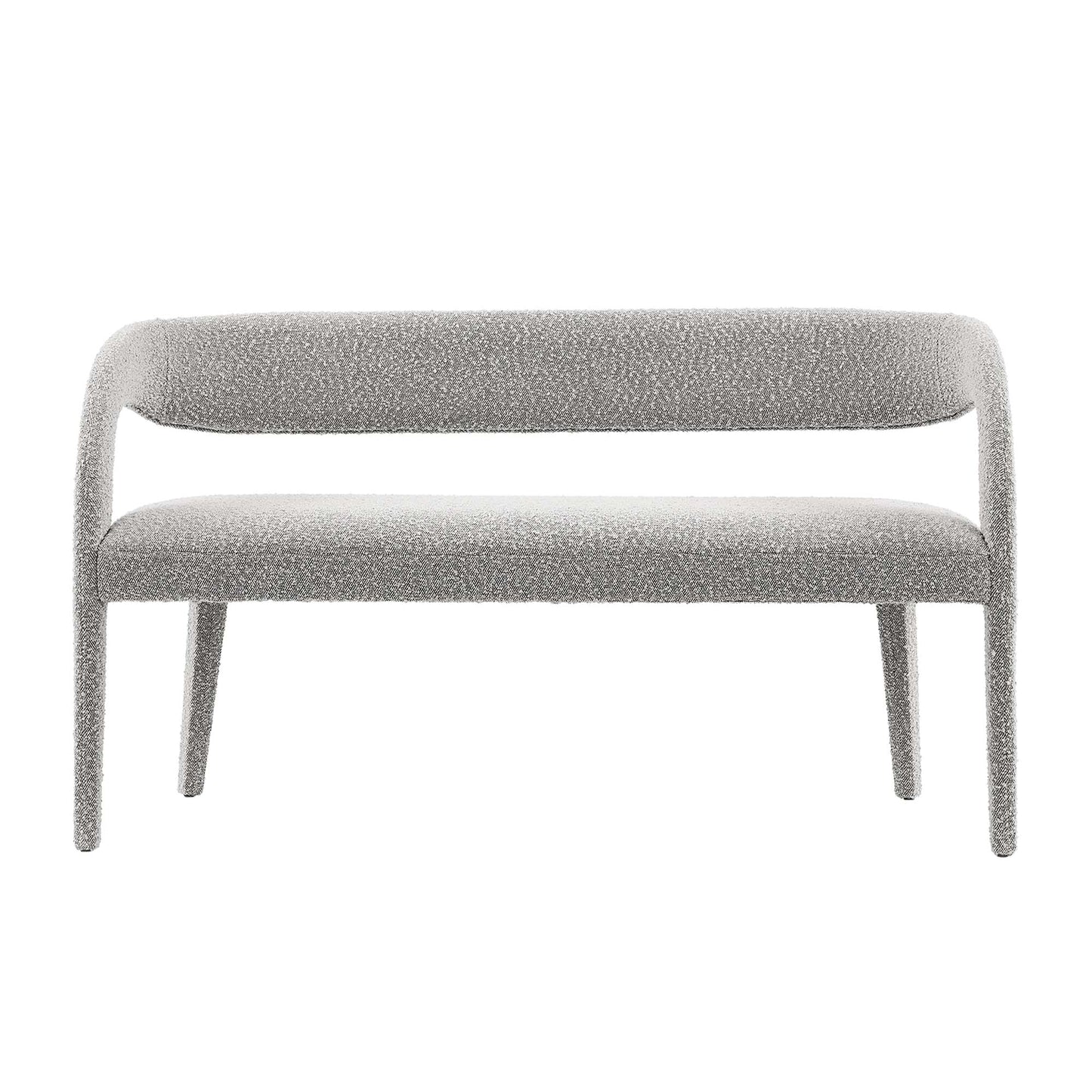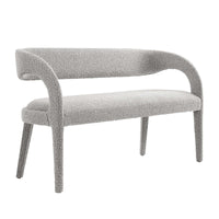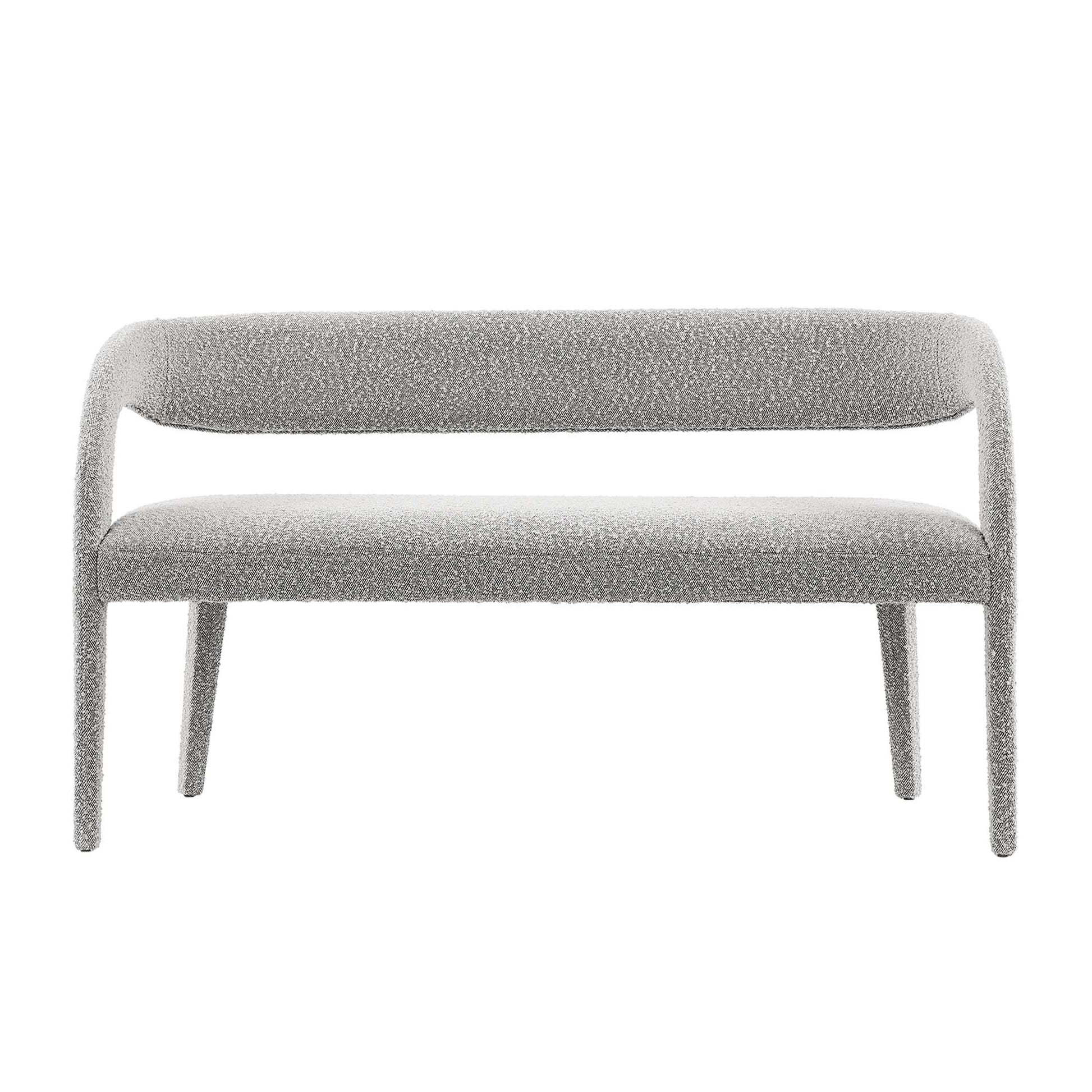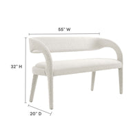 Experience the perfect blend of modern sophistication and luxurious comfort with the Pinnacle Boucle Fabric Upholstered Accent Bench. Whether used as a dining bench or accent bench, its distinct silhouette showcases a curved backrest and an open design that effortlessly enhances your dining or living space with luxe style. This modern bench indulges your senses with its dense foam padding, upholstered in a tactile, nubby textured boucle fabric. Non-marking plastic foot pins ensure your flooring remains free from scuffs and scratches. With no assembly required, this bench offers a stylish statement instantly. Weight Capacity: 330 lbs.