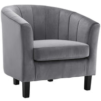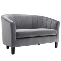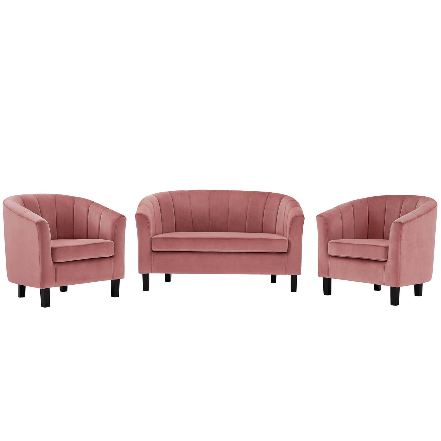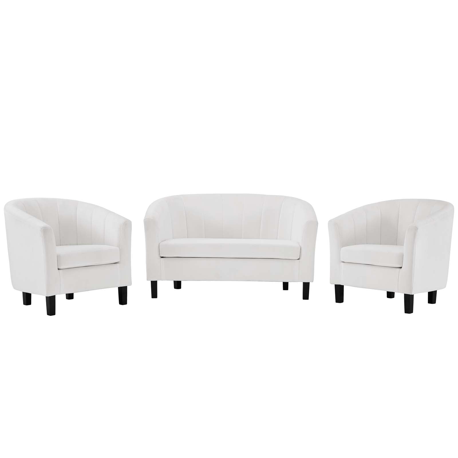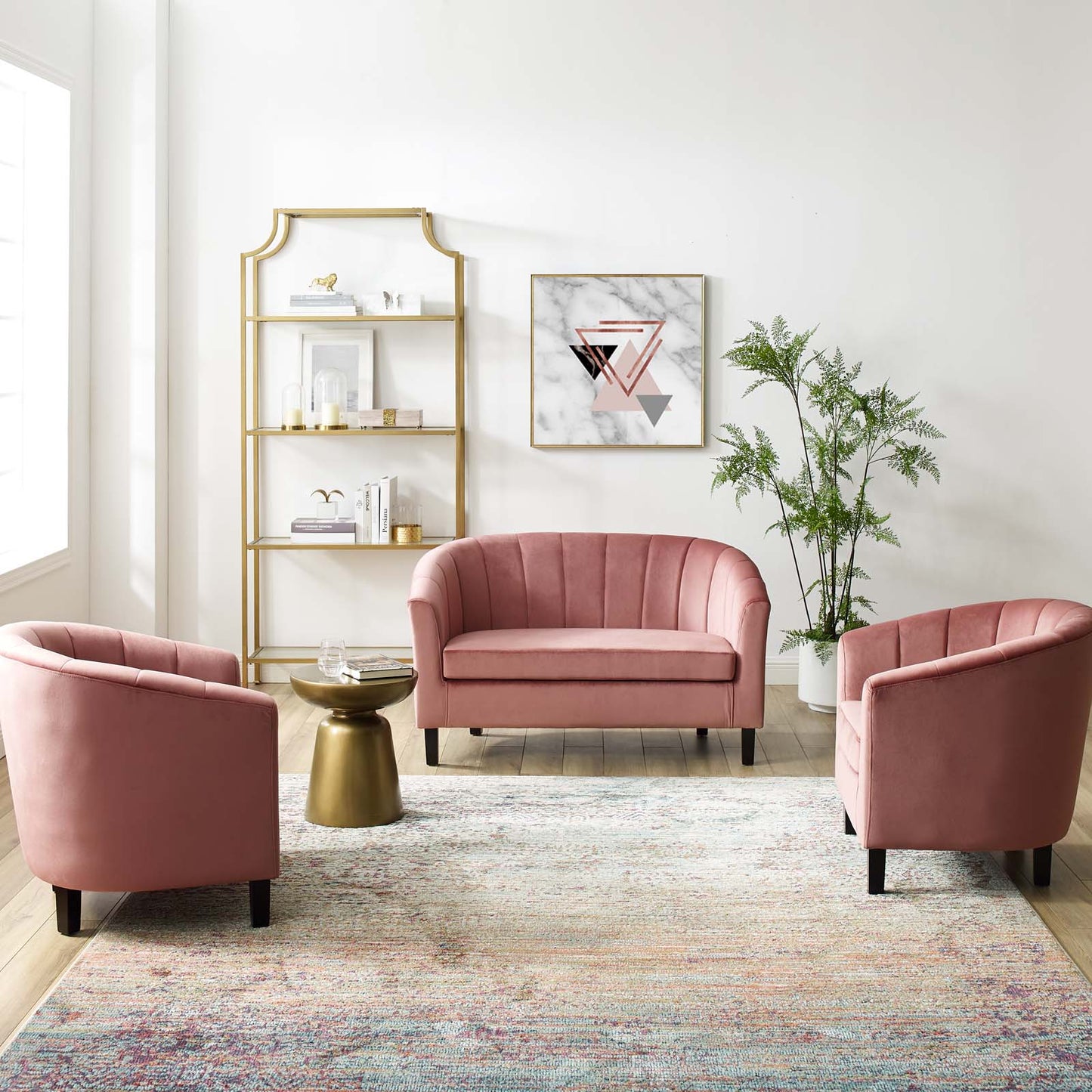 A fresh outlook on a familiar classic, Prospect Performance Velvet Loveseat and 2 Armchair Set brings intrinsic luxury to your living space. This barrel back set comes upholstered in stain-resistant performance velvet fabric, and boasts chic channel tufting, updating the Chesterfield-inspired profile with retro modern design elements. The densely padded removable seat and backrest grant approachable comfort that beckons guests to sit and stay a while.