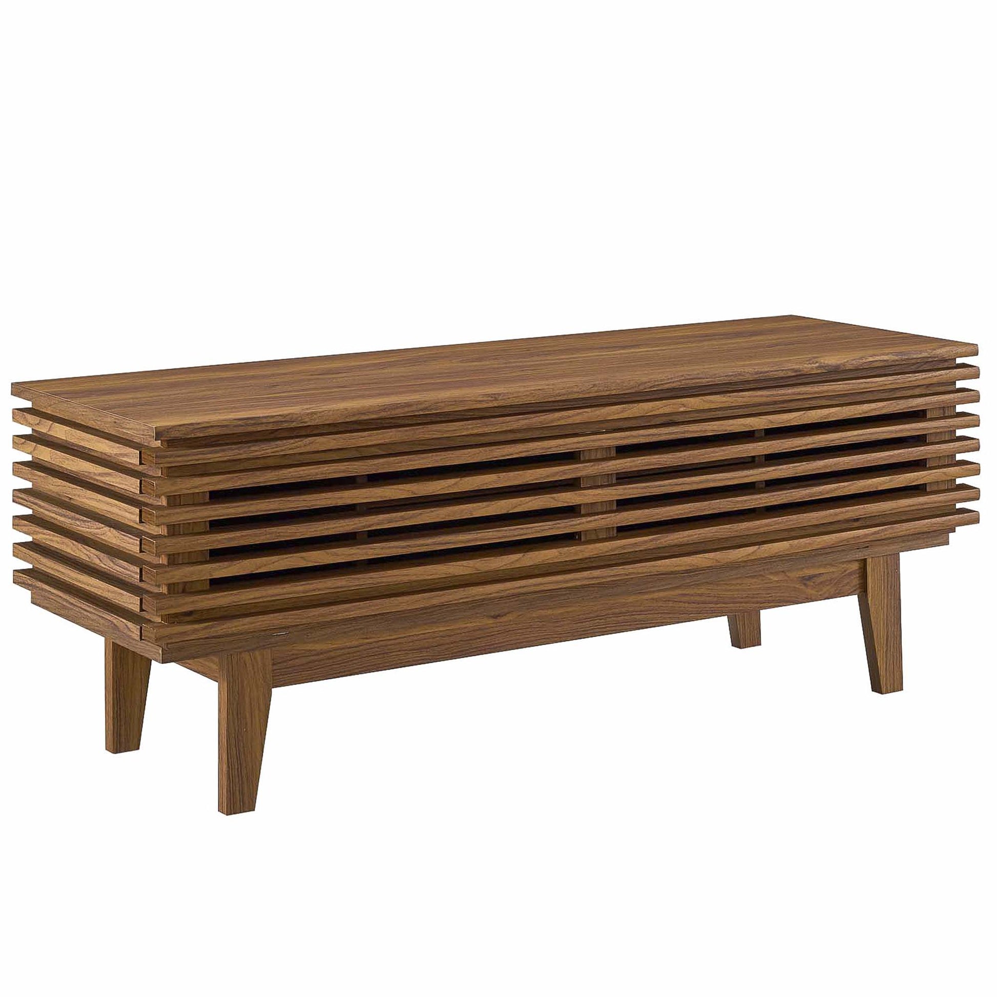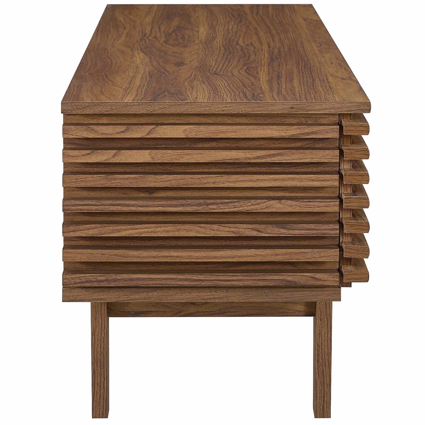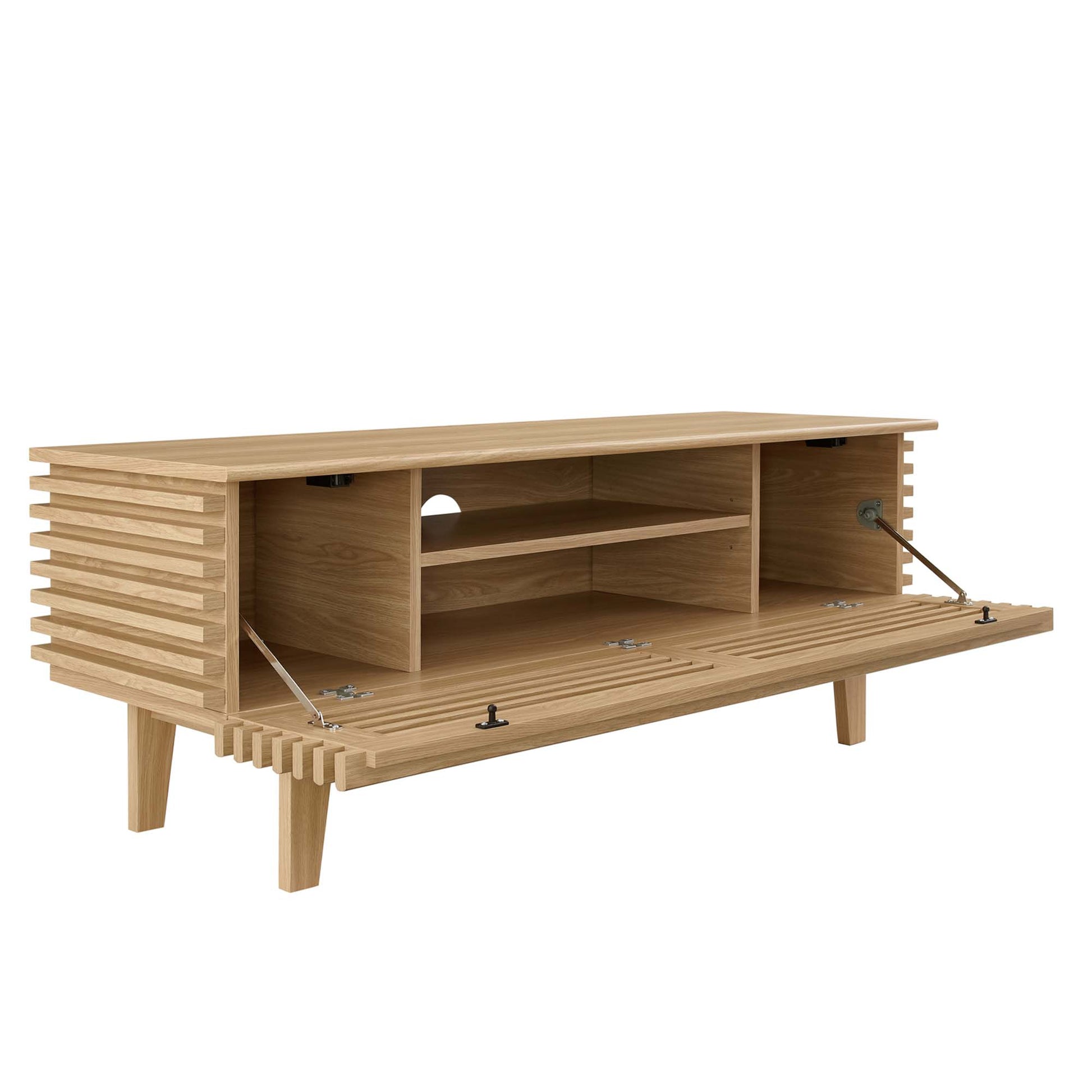 Tap into mid-century aesthetics with the Render 50" TV Stand. This installment of the Render collection features a durable particleboard frame with a smooth walnut grain laminate, four tapered wood legs, an adjustable shelf, a center cable management hole, side storage areas, and a bottom-hinged door for easy access to shelf storage. This versatile mid-century modern living room table features a solid construction with a pleasing look and practical functionality. Perfect for media storage, Render accommodates flat-screen TVs up to 50” wide.