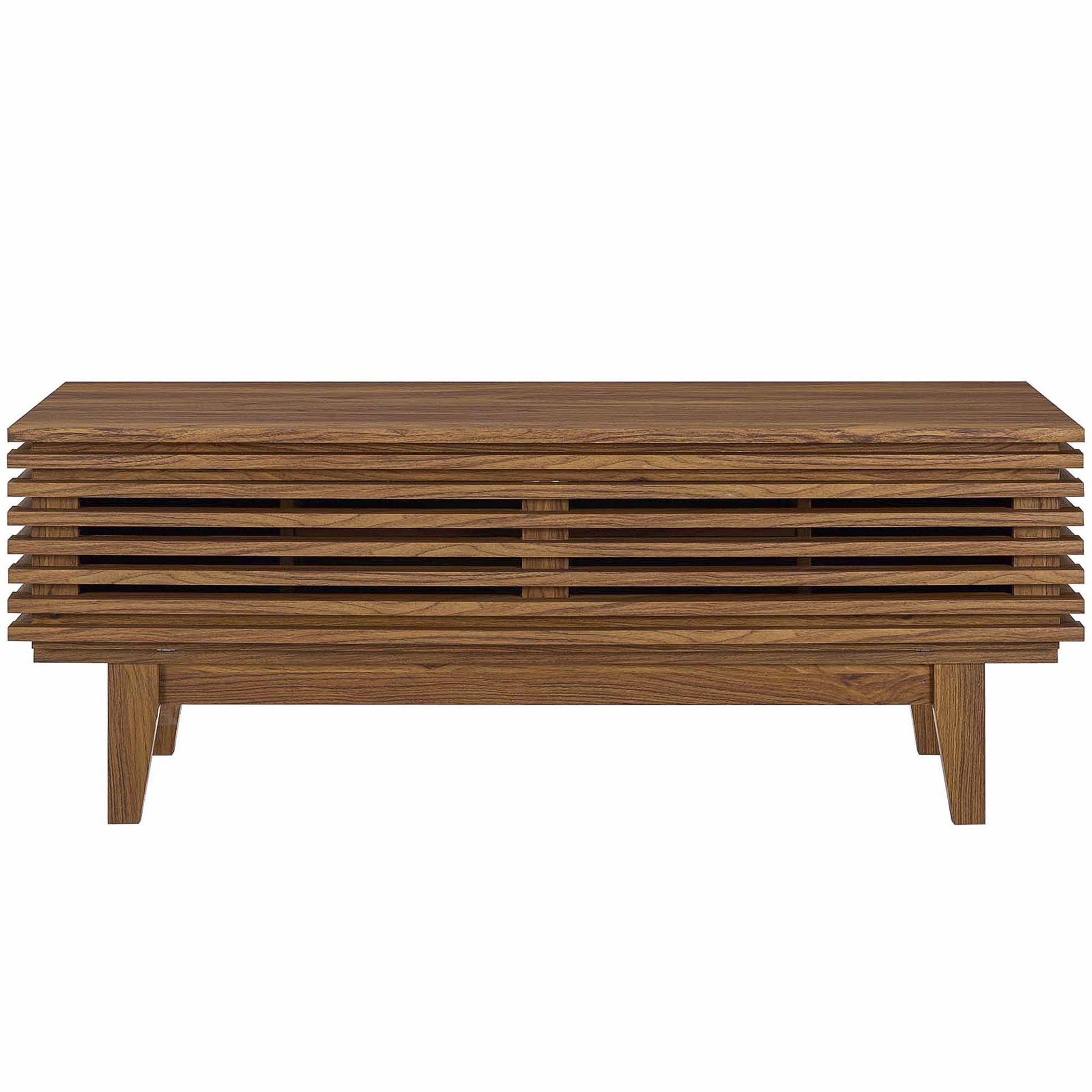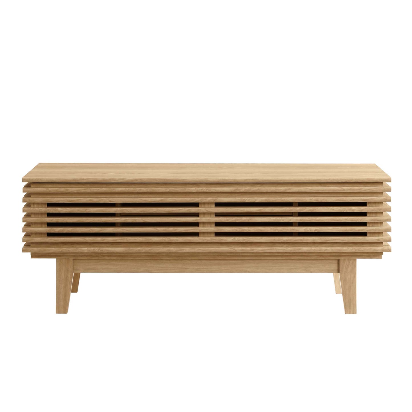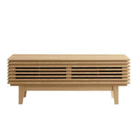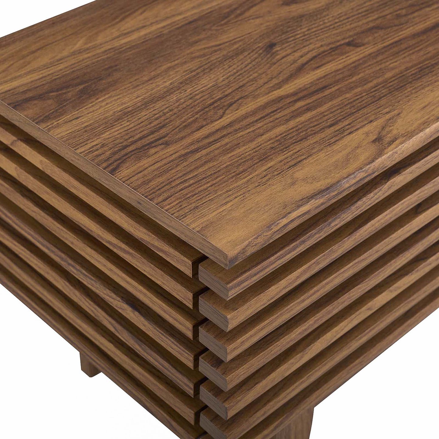 Tap into mid-century aesthetics with the Render 50" TV Stand. This installment of the Render collection features a durable particleboard frame with a smooth walnut grain laminate, four tapered wood legs, an adjustable shelf, a center cable management hole, side storage areas, and a bottom-hinged door for easy access to shelf storage. This versatile mid-century modern living room table features a solid construction with a pleasing look and practical functionality. Perfect for media storage, Render accommodates flat-screen TVs up to 50” wide.