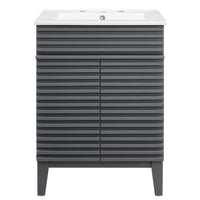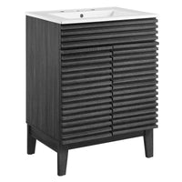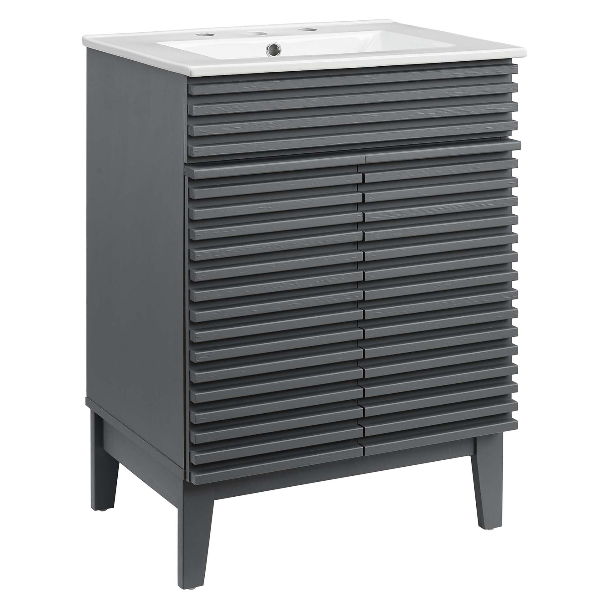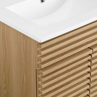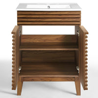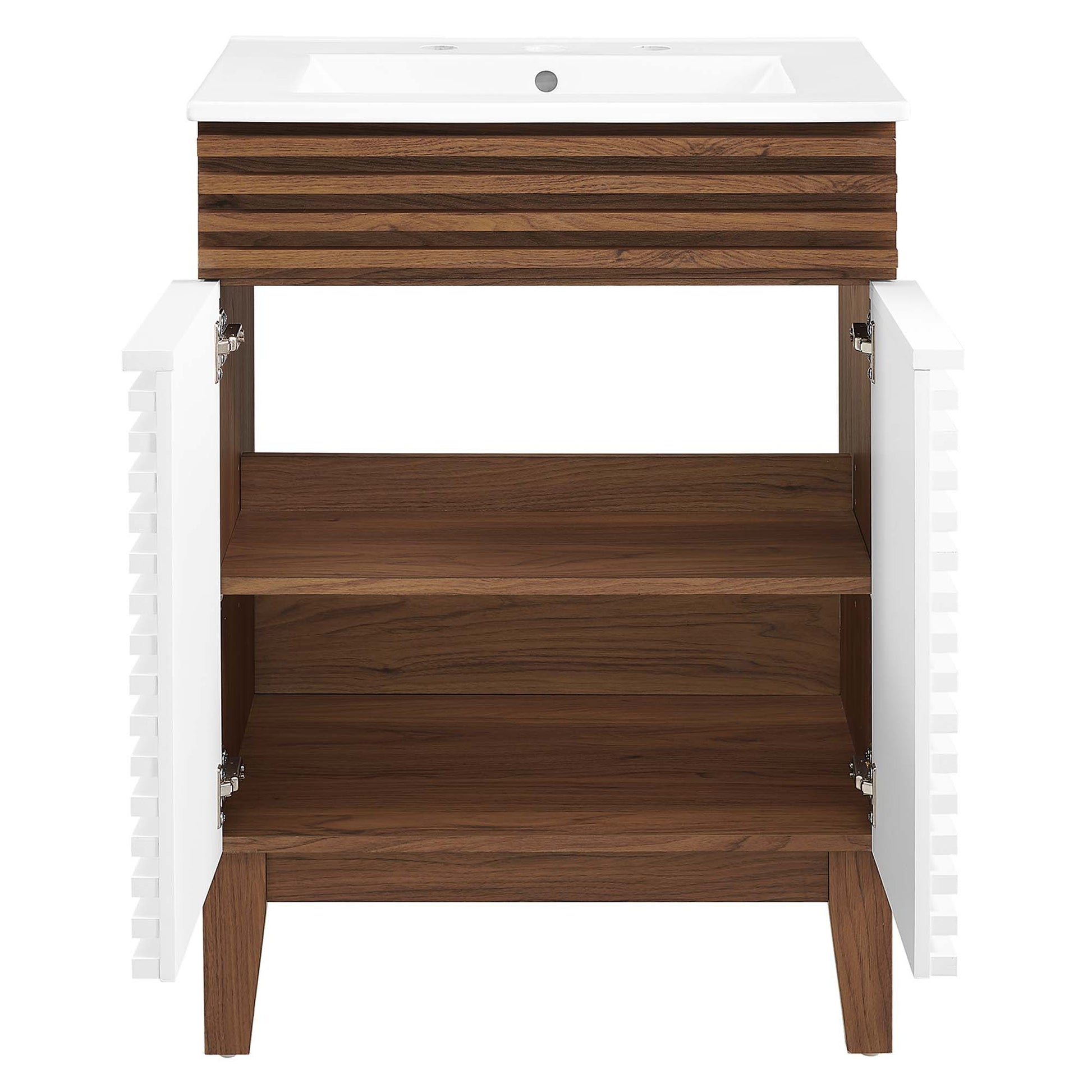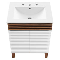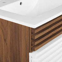 Tap into mid-century aesthetics with the Render Vanity. Render Bathroom Vanity features a durable particleboard frame with smooth walnut grain laminate, four tapered wood legs, and adjustable storage shelf behind two soft-close hinged doors. A curved basin and integrated countertop with three faucet holes create sleek lines and crisp design for an edgy style designed to meet your needs. Boasting a mid-century modern style this vanity features a solid construction with a pleasing look and practical functionality. 8" centerset faucet holes. Assembly required and fixtures not included.