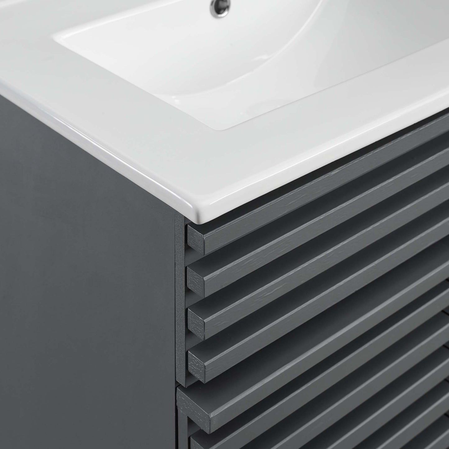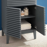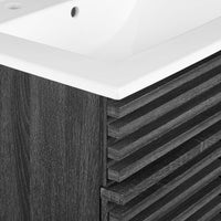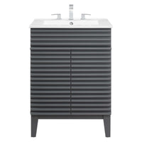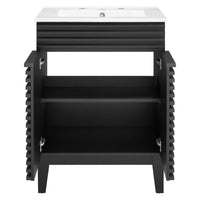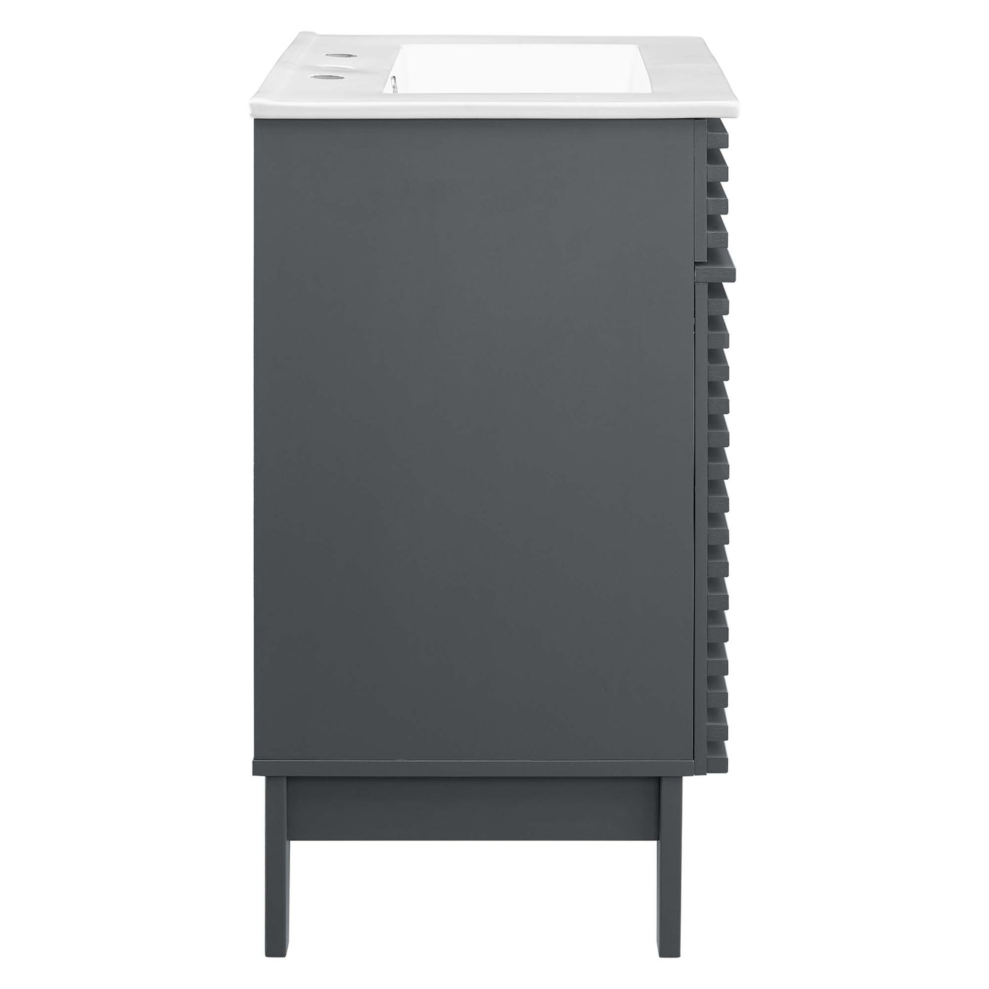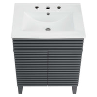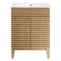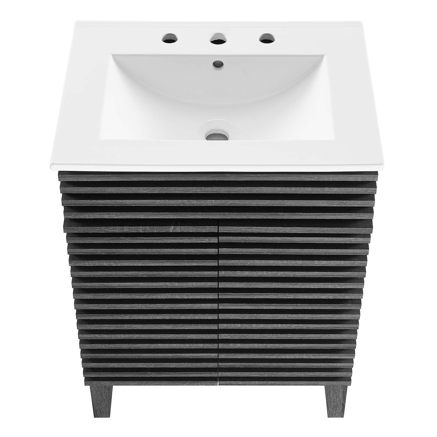 Tap into mid-century aesthetics with the Render Vanity. Render Bathroom Vanity features a durable particleboard frame with smooth walnut grain laminate, four tapered wood legs, and adjustable storage shelf behind two soft-close hinged doors. A curved basin and integrated countertop with three faucet holes create sleek lines and crisp design for an edgy style designed to meet your needs. Boasting a mid-century modern style this vanity features a solid construction with a pleasing look and practical functionality. 8" centerset faucet holes. Assembly required and fixtures not included.