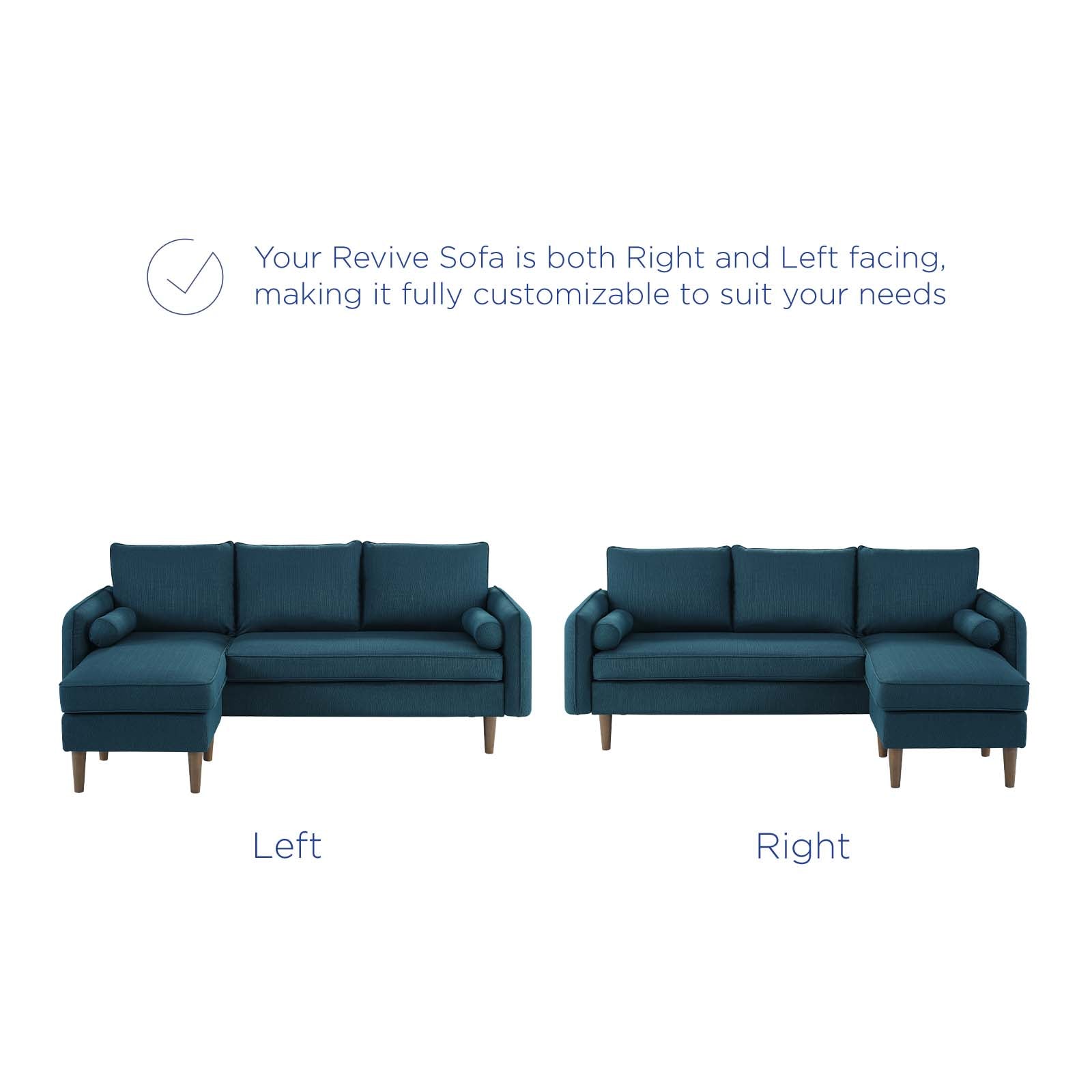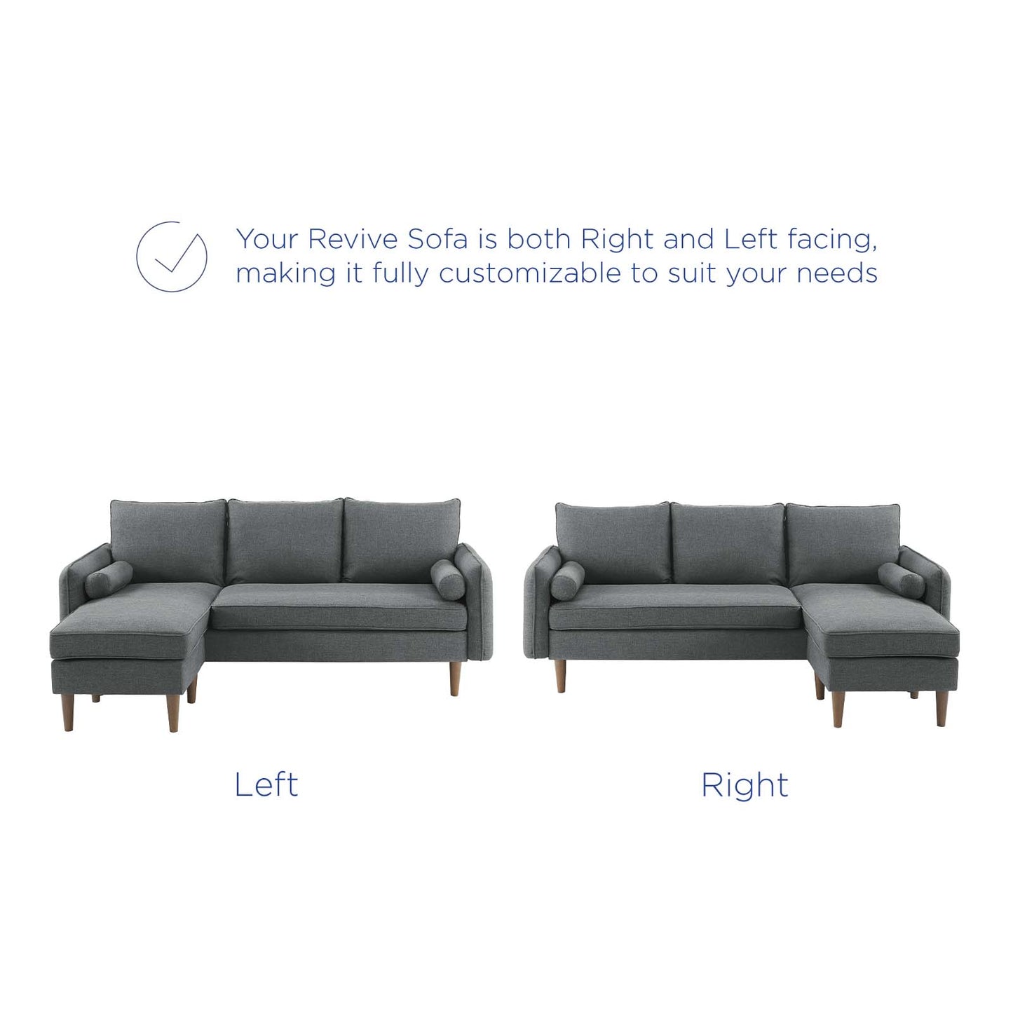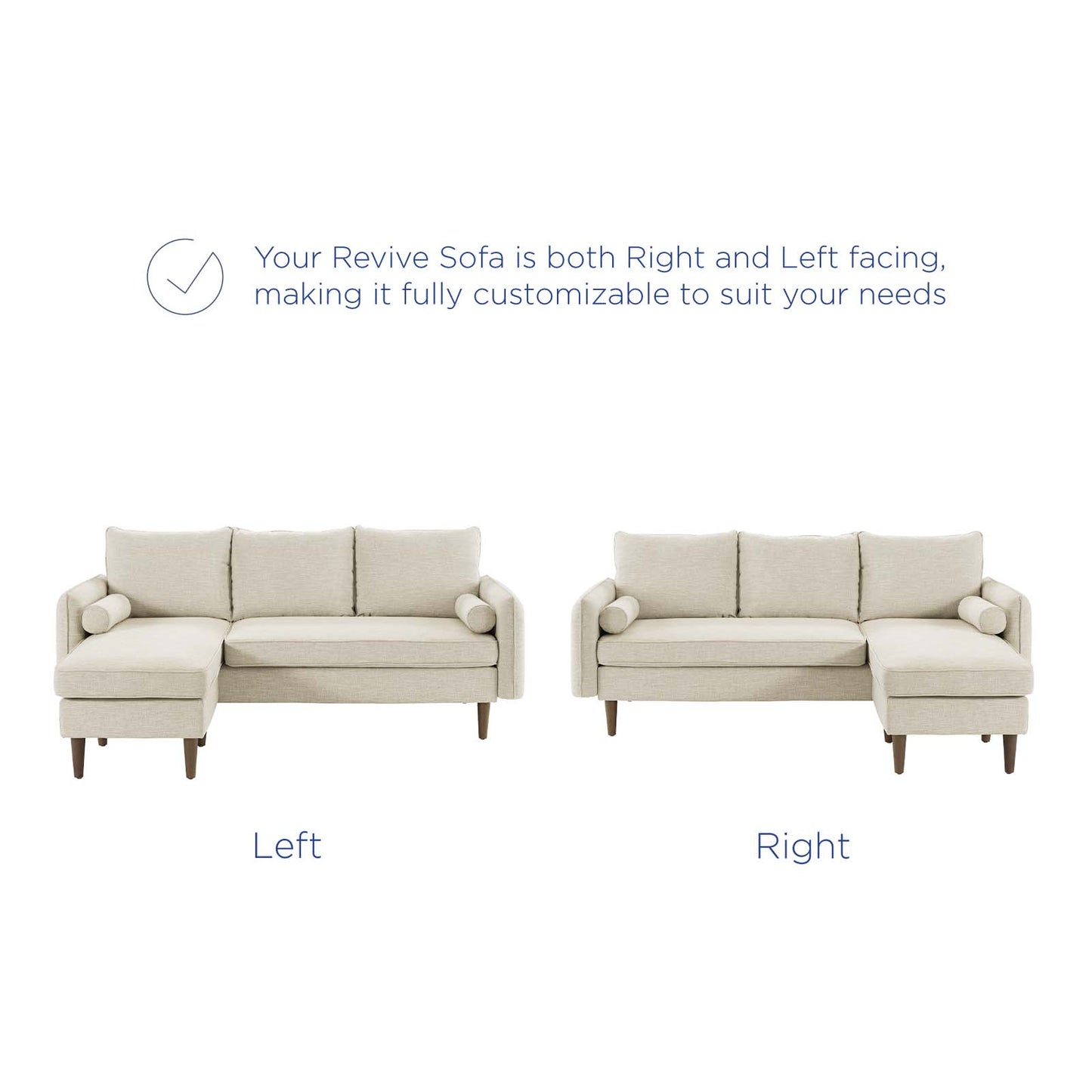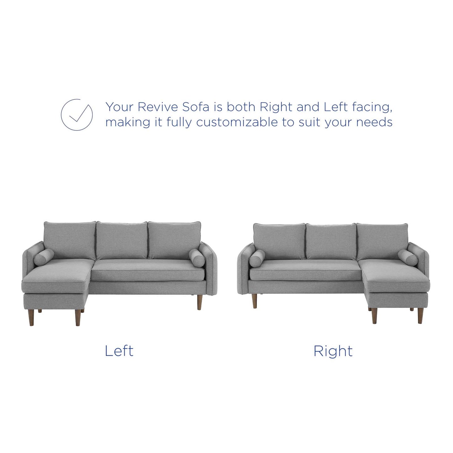 Give new vitality to your living space with the Revive Upholstered Fabric Right or Left Sectional Sofa Sectional Sofa. With a comfortable yet tailored profile and two bolster pillows, Revive Living Room Couch beckons guests to sit and stay a while. Dense foam padding and a pocket coil spring system provide a luxurious seating experience. Soft polyester fabric upholstery grants this three-seater sectional sofa with a right or left facing chaise an approachable appeal that’s echoed by its calming color, clean lines, and splayed and tapered wood legs with non-marking foot caps. The Revive Right-Facing Sofa has a built in ottoman that allows for a variety of comfortable lounging combinations and accommodates a multiple decor styles in your living room, lounge room, or other seating area. Weight Capacity: 900 lbs.