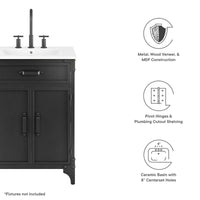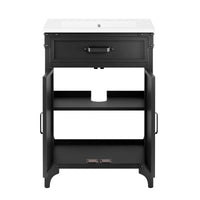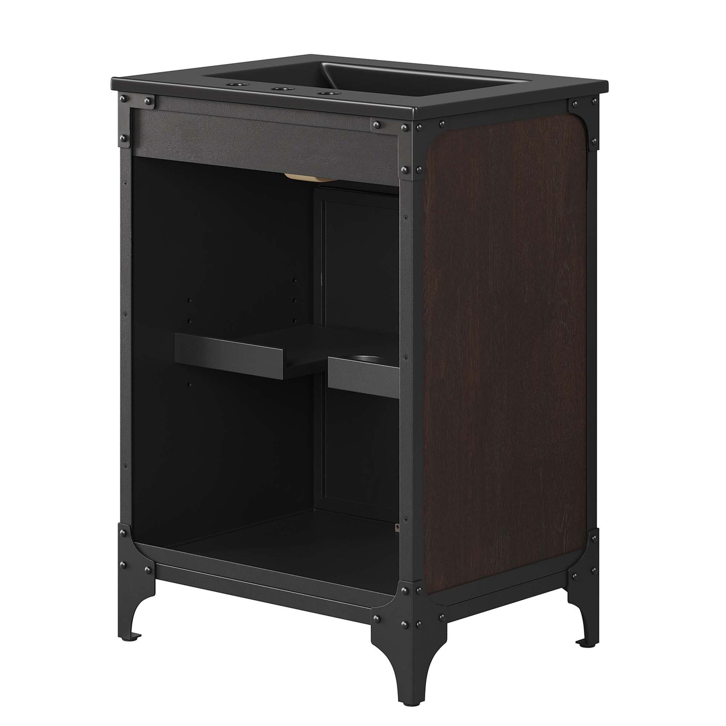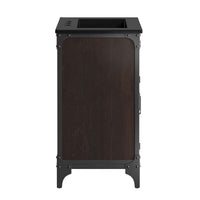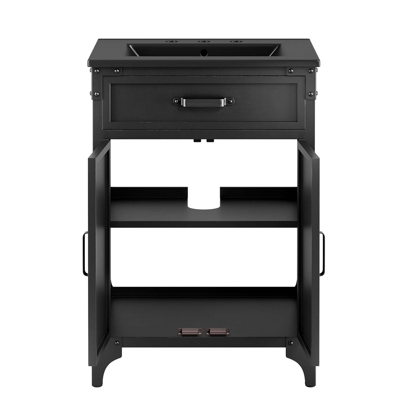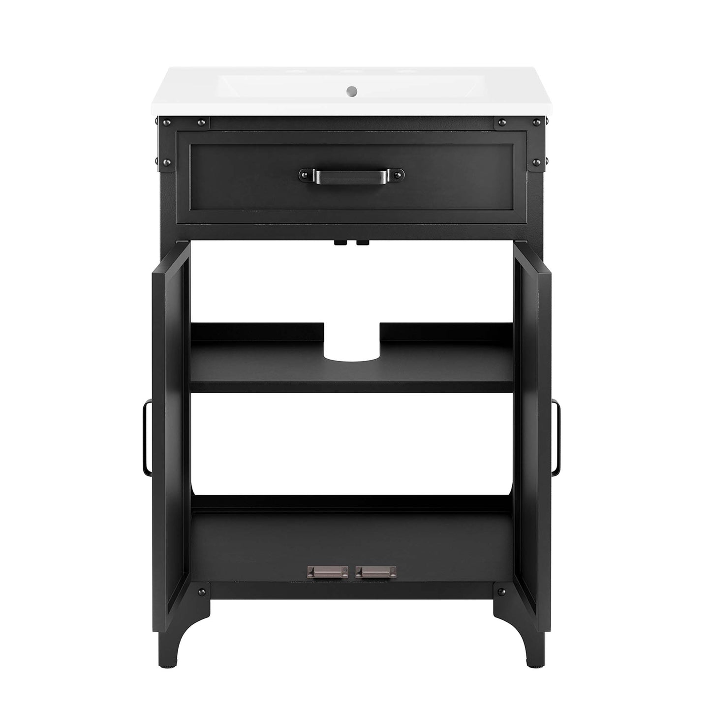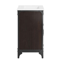 Experience the perfect blend of functionality and industrial modern style with the Steamforge 24" Bathroom Vanity. Crafted from sturdy metal with an antique patina and MDF with a beautiful wood grain veneer, this bathroom vanity cabinet brings a touch of utilitarian elegance to your bathroom decor. With pivot hinged double doors and spacious shelving complete with a plumbing cutout, this vanity provides ample storage space for all your bathroom essentials. The ceramic sink basin boasts an integrated countertop with 8" centerset holes, ready for your chosen fixtures (not included). With non-marking foot pads to protect your flooring, this bathroom vanity offers the ideal balance of design and practicality.