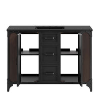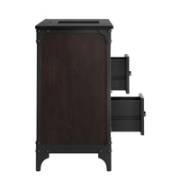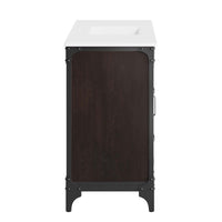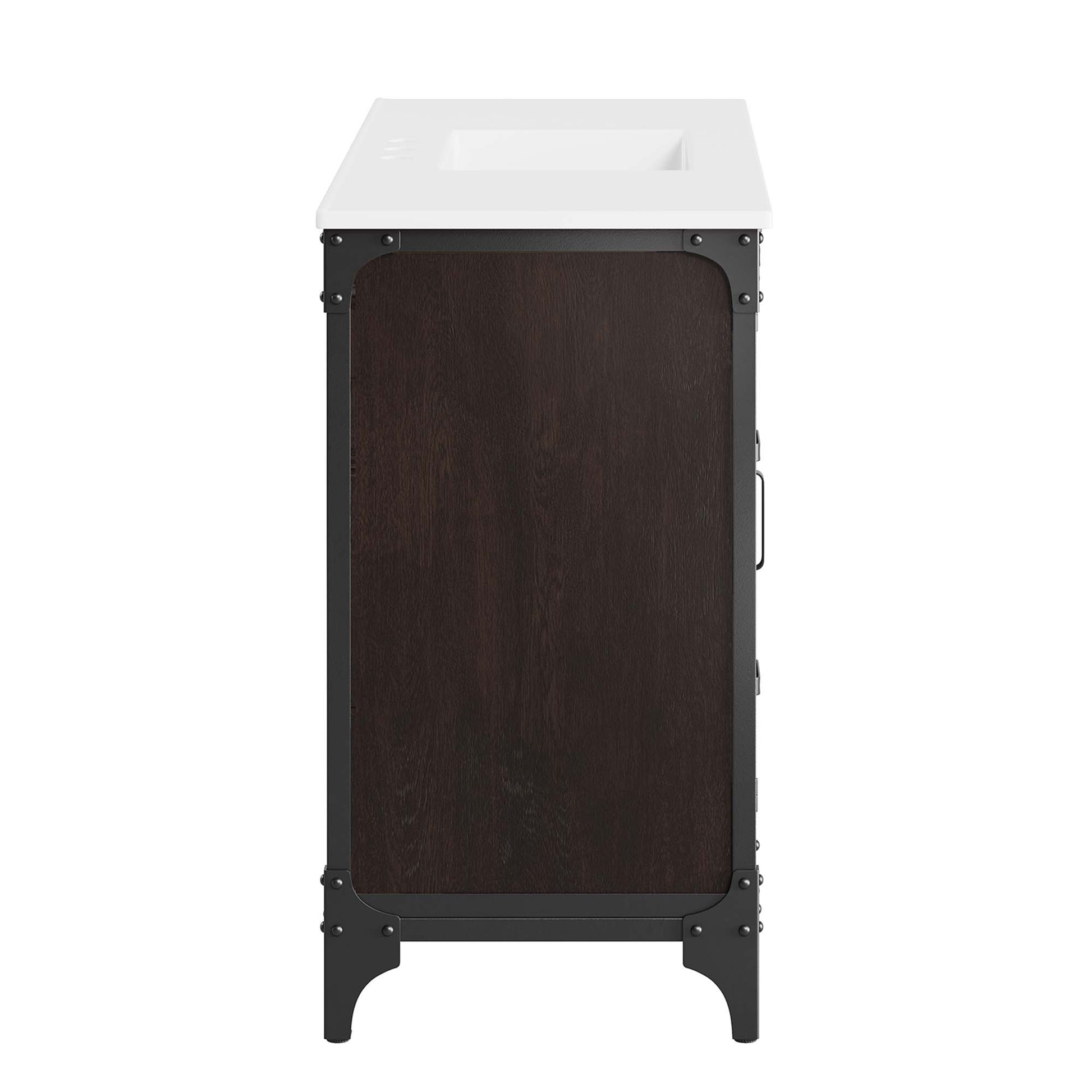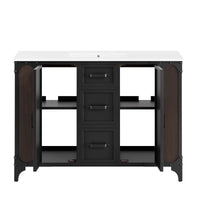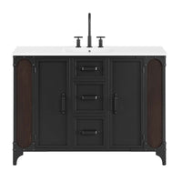 Experience the perfect blend of functionality and industrial modern style with the Steamforge 48" Bathroom Vanity. Crafted from sturdy metal with an antique patina and MDF with a beautiful wood grain veneer, this bathroom vanity cabinet brings a touch of utilitarian elegance to your bathroom decor. With a fixed drawer, two full-glide drawers, pivot hinges, and spacious shelving complete with plumbing cutouts, this vanity provides ample storage space for all your bathroom essentials. The ceramic single sink basin boasts an integrated countertop with 8" centerset holes, ready for your chosen fixtures (not included). With non-marking foot pads to protect your flooring, this bathroom vanity offers the ideal balance of design and practicality.