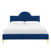 Awaken a kid's bedroom or guest bedroom with the energizing style of the Sunny Performance Velvet Twin Bed. Offering luxe texture and a glam deco look, the twin headboard of this bed features an arching silhouette reminiscent of the morning sunrise. This twin size bed is upholstered in stain-resistant performance velvet and padded with dense foam creating a soft, supportive place to rest and relax while sitting up in bed. Eliminating the need for a box spring, the MDF frame of this twin bed is complete with a wood slat support system crafted with poplar for lasting durability and support. A sturdy mattress foundation for memory foam, innerspring, latex, and hybrid mattresses, this slatted bed frame rests on gold metal legs with non-marking foot caps and includes a reinforced center beam with two support legs for enhanced stability. Twin Bed Weight Capacity: 800 lbs.