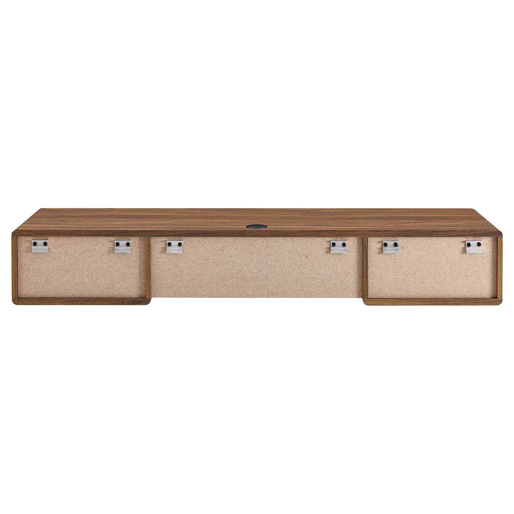 Harness the iconic energy of mid-century style in your home office with the Transmit Wall-Mount Office Desk. Abounding in retro modern design, this computer desk is complete with a pull-out keyboard tray, two full-extension drawers for ample storage space of all your office essentials, and a cable management hole to keep your workspace neat and organized. This durable office desk is built with a sturdy particleboard frame with a smooth walnut wood grain laminate and white lacquer drawer fronts with chrome metal hardware. Mounting directly to the wall, this office desk is an instant update to your workspace. Assembly required. Weight limit: 23 lbs.