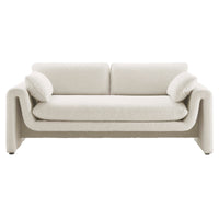 Divulge in the luxe splendor of the one-of-a-kind Waverly Boucle Fabric Sofa. This living room sofa features a unique, wavy shape complete with bent lines and rounded edges. With dense foam padding for superior comfort, this sofa is upholstered in boucle fabric with a charming nubby texture. The cushions are removable and feature removable covers to make cleaning a breeze. The bench seat, back cushions, and two throw pillows create an inviting look and offer superior comfort while resting and relaxing. The adjustable non-marking foot pads elevate the sofa to perfectly fit your space and protect your floors. With its beautiful silhouette and cozy comfort, this boucle sofa is a stylish piece for the living room, bedroom, office, or reception area. No assembly required. Weight Capacity: 661 lbs.