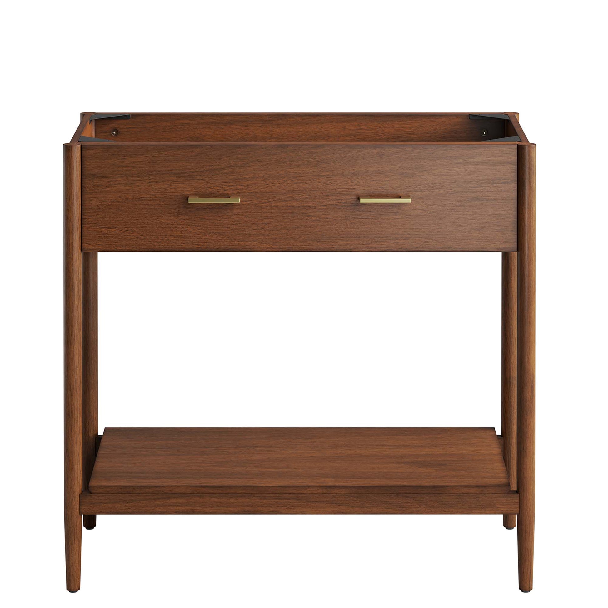 Infuse your bathroom decor with the subtle charm and simplicity of the Zaire 36” Bathroom Vanity Cabinet. This exquisite washstand combines sleek, contemporary lines with the natural beauty of wood in an organic minimalist design. Crafted from MDF and solid rubberwood and topped with a wood grain veneer, this vanity’s design is emphasized by metal handle pulls, giving the drawer a touch of urban chic. Below this, you'll find an open shelf, ideal for holding towels or showcasing your favorite decorative pieces. This vanity’s tapered wood legs are a modest and understated design choice that completes the overall simple mid-century aesthetic. Includes adjustable, non-marking feet for added stability and floor protection. Assembly required. Fixtures and sink basin not included. Weight Capacity: 375 lbs.