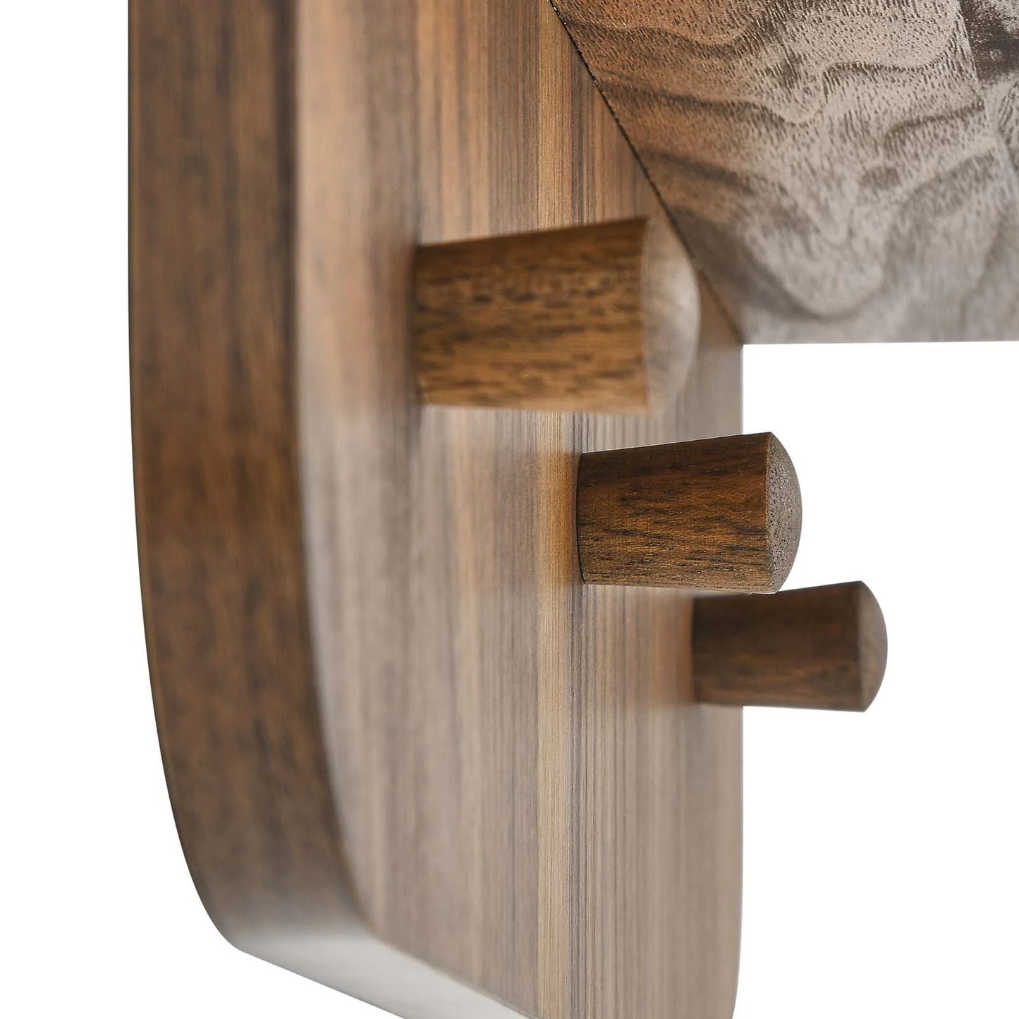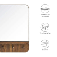 • As stylish as it is functional, the Lumina Mirror features rounded corners, a rectangular profile, small shelf, and three pegs making it a must-have for the entryway, hallway, or mudroom. Bringing a touch of modern style and elegance to your space, this mirror offers organization and storage for keys, dog leashes, hats, and a variety of other small items. Crafted from mindi wood and particleboard with a wood grain laminate, this all-in-one mirror is made to last and offers a charismatic touch to any home or apartment. Its sleek, modern design and wood grain aesthetics are sure to turn heads and make a statement. Minimal assembly required