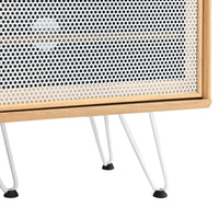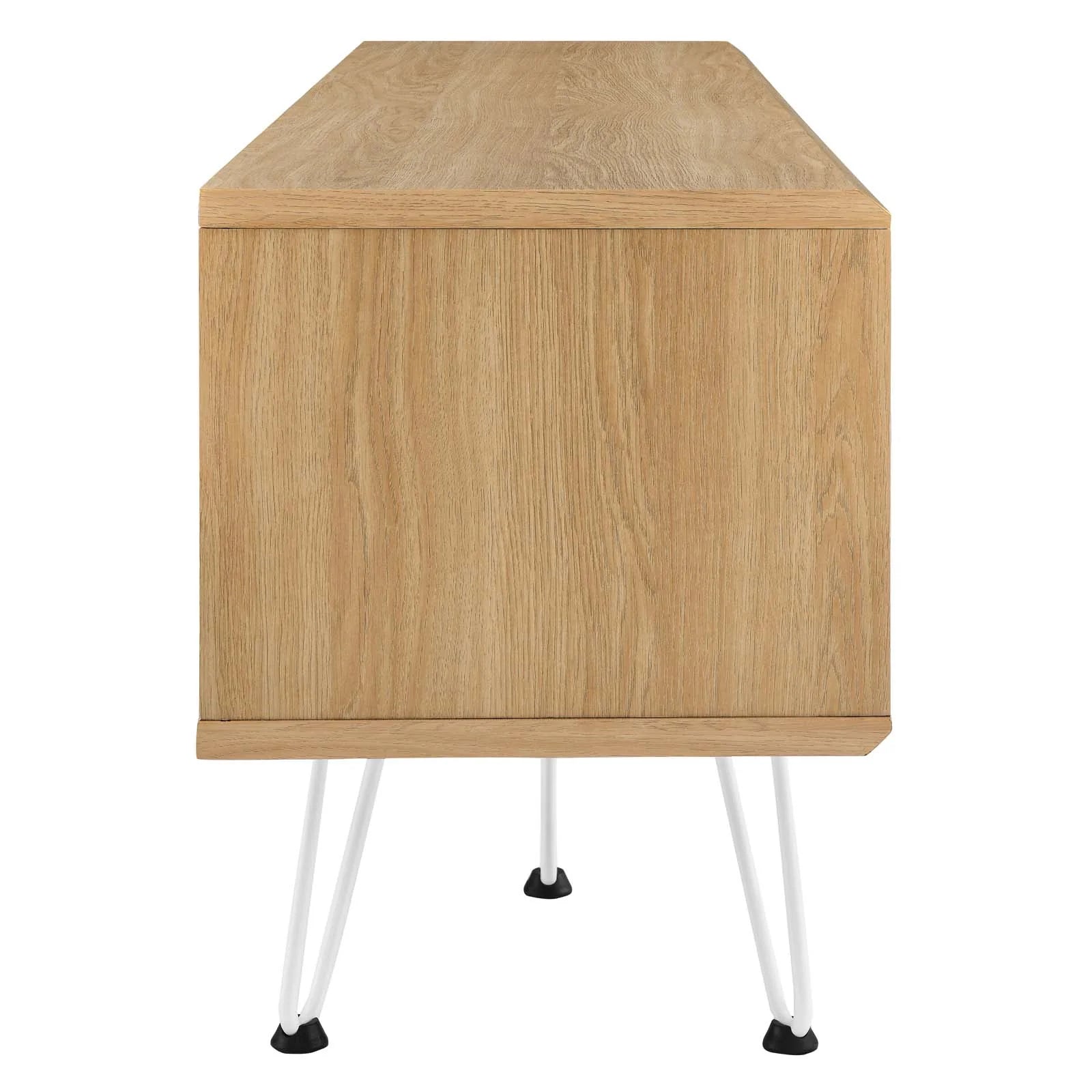 • Urbanize your living space with the modern style of the Nomad 59" TV Stand. Featuring two sliding metal mesh doors, this entertainment center brings organic aesthetics and industrial design to the living room, bedroom, home office, or lounge area. This media stand is crafted with a honeycomb core and wood grain laminate. Resting on splayed hairpin legs with non-marking rubber pads, this media stand offers ample storage space for all your media essentials with spacious shelving while cable management holes keep visual space clean and allow for flow-through ventilation. This TV center accommodates TVs up to 65". Assembly required. Weight Capacity: 200 lbs.